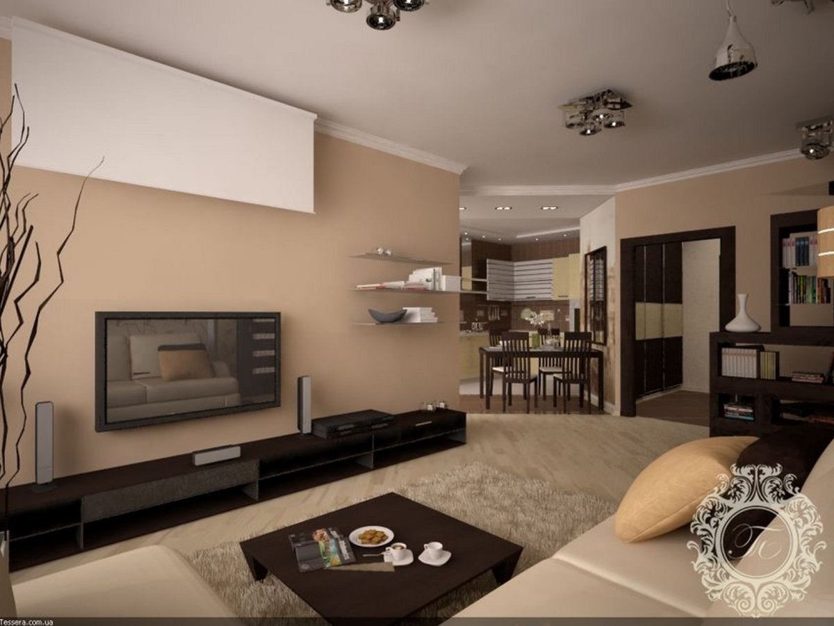 Кофейные стены в интерьере гостиной