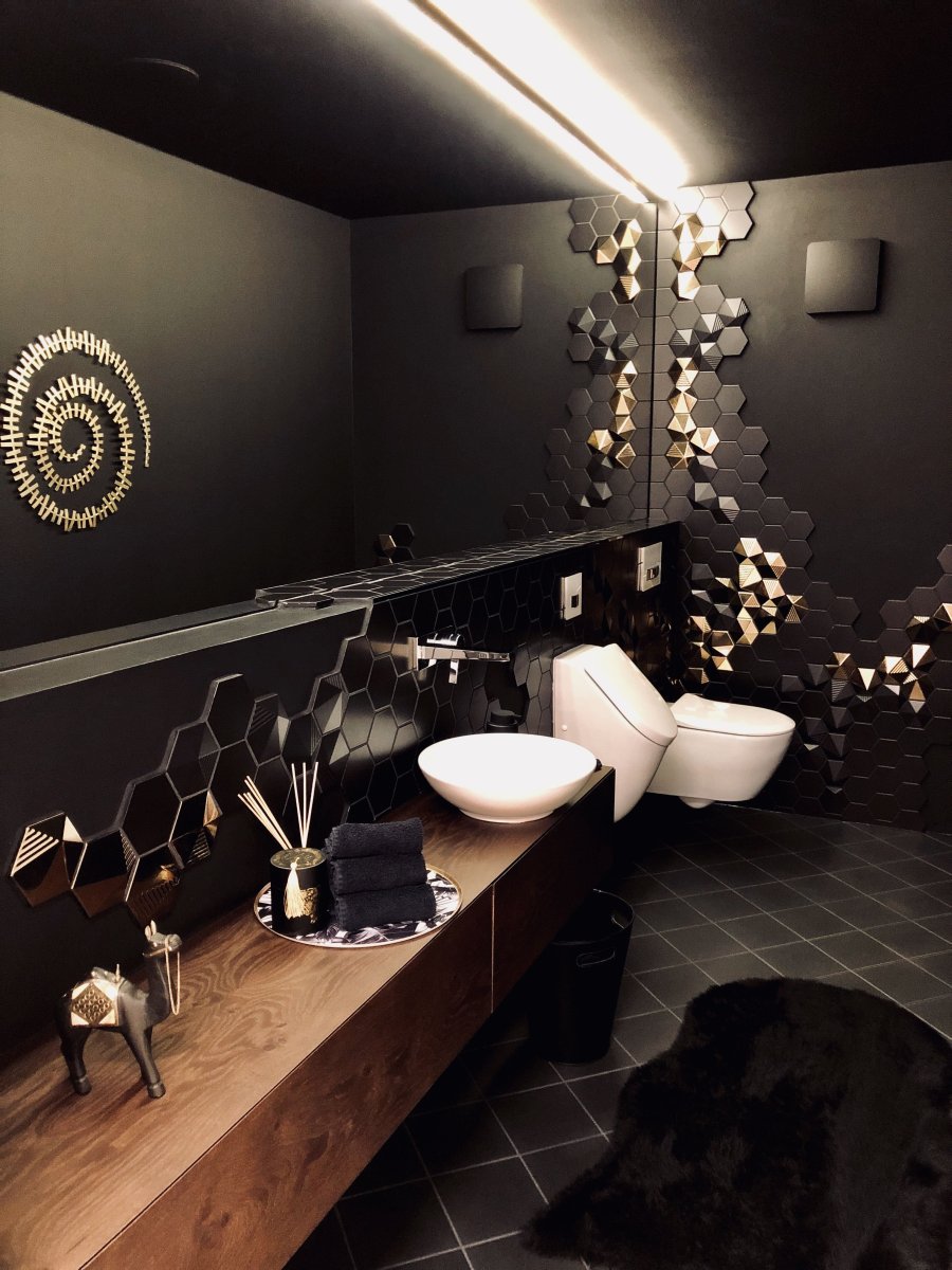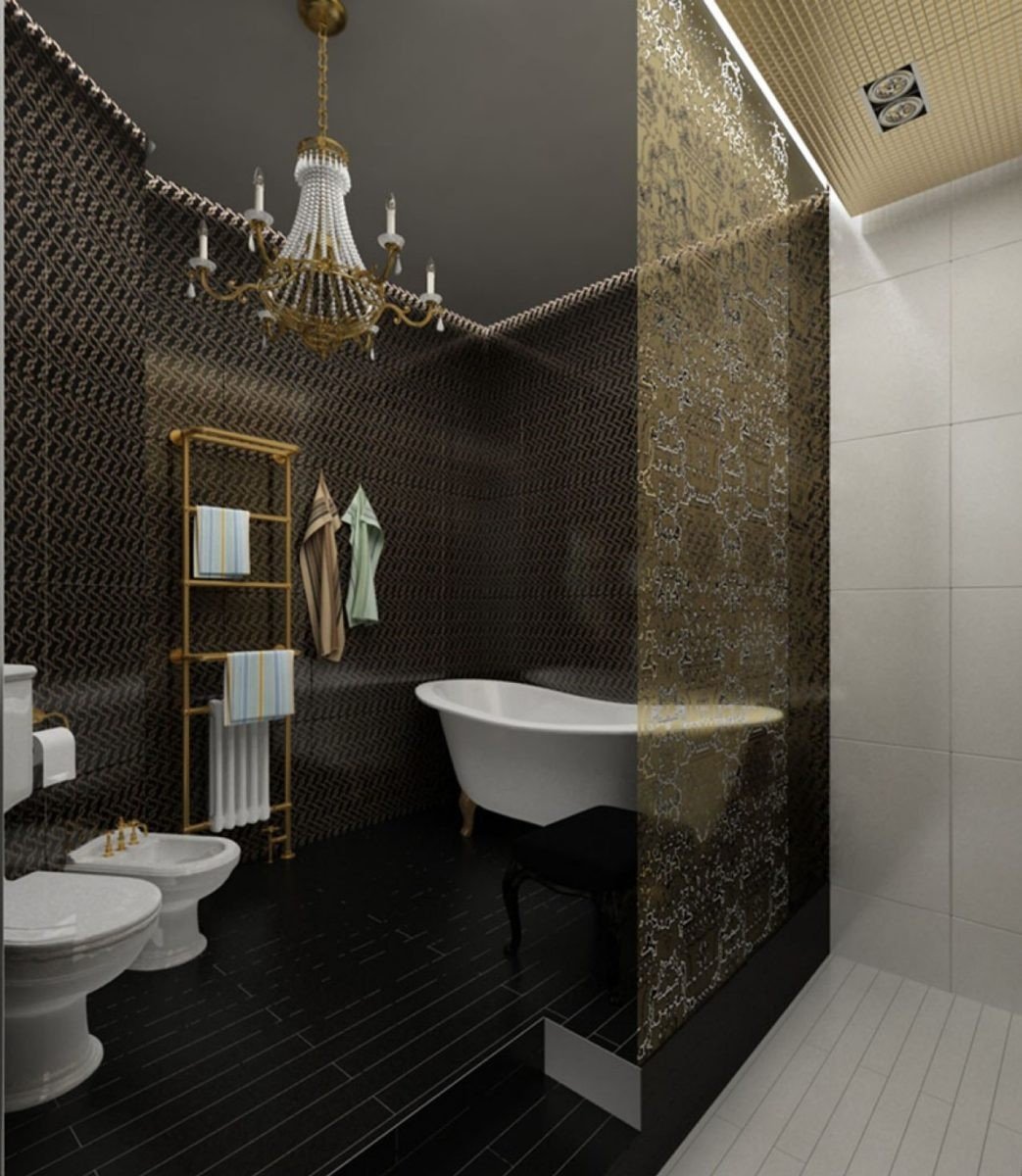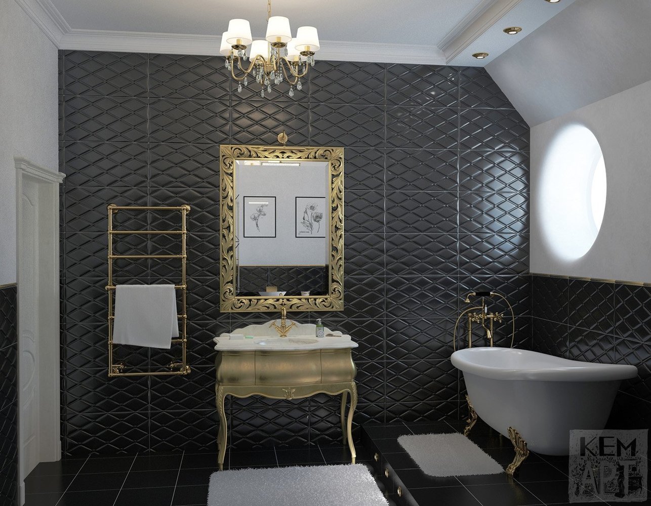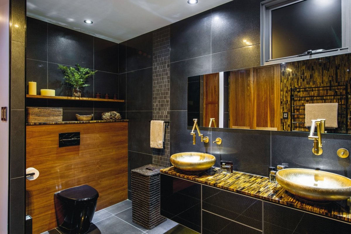 Ванная с черной плиткой и золотом