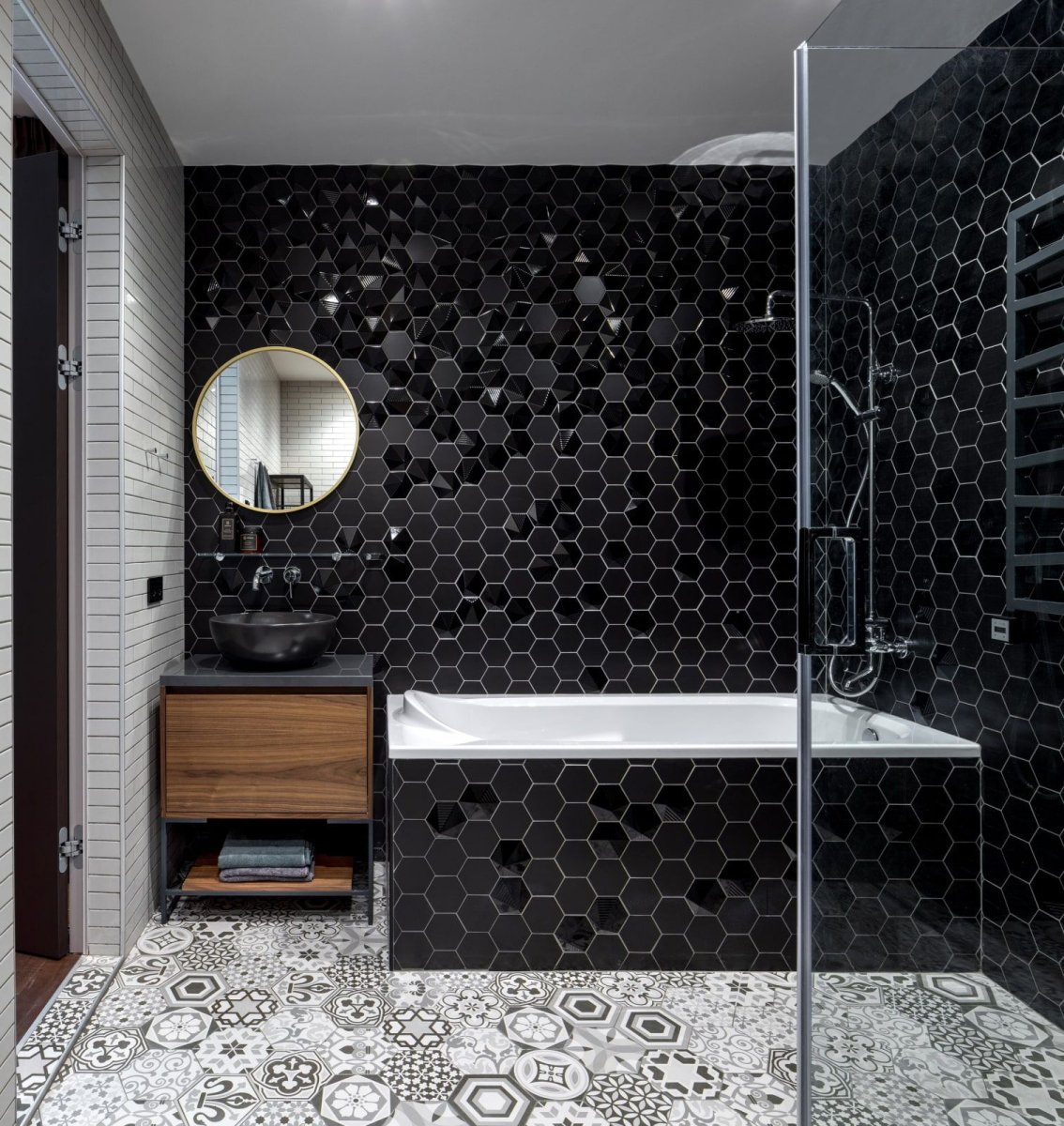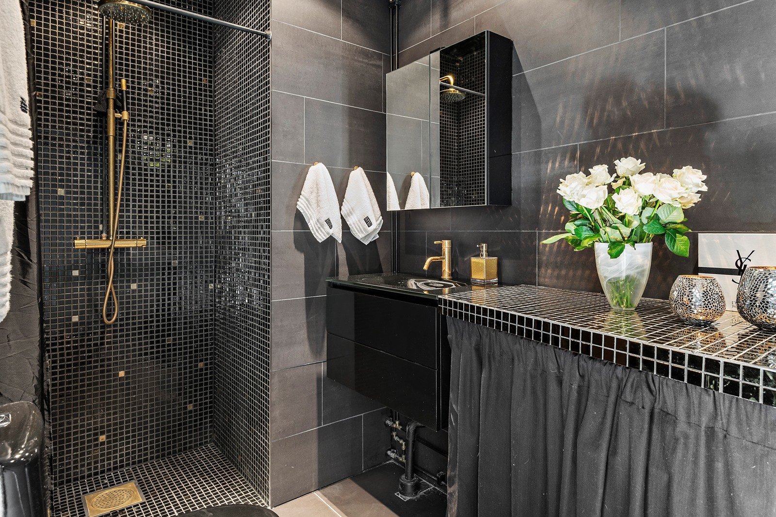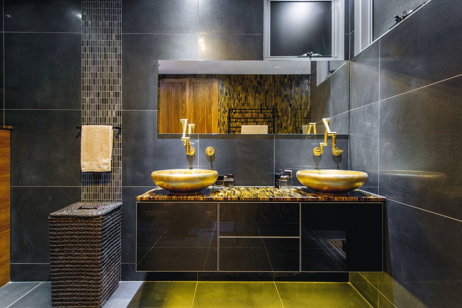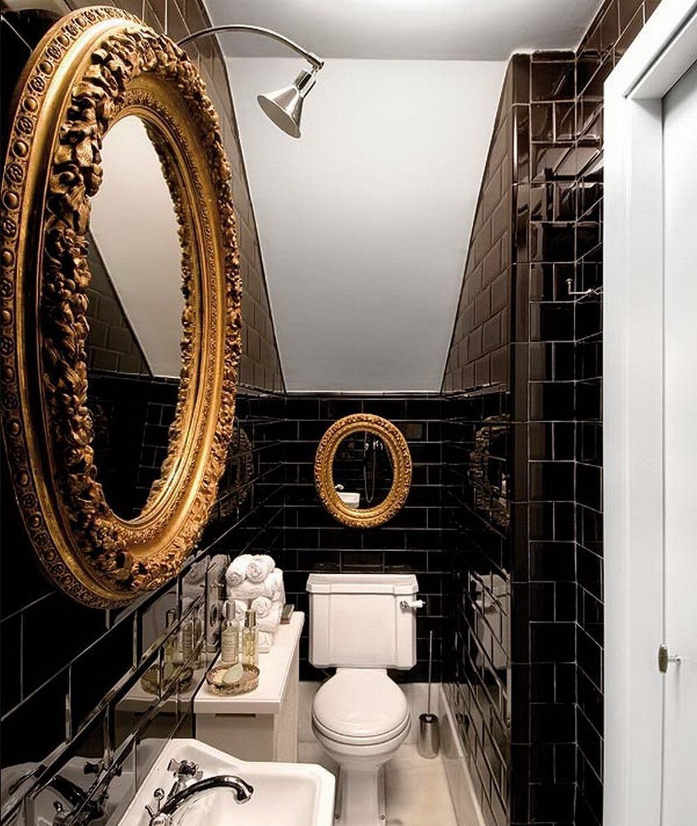 Ванная с черной плиткой и золотом