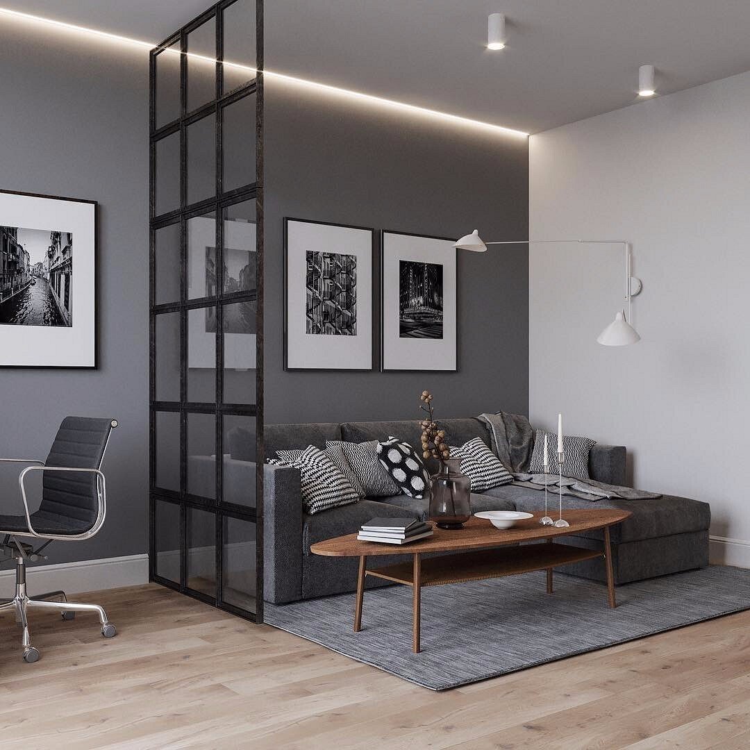 Гостиная студия в сером цвете