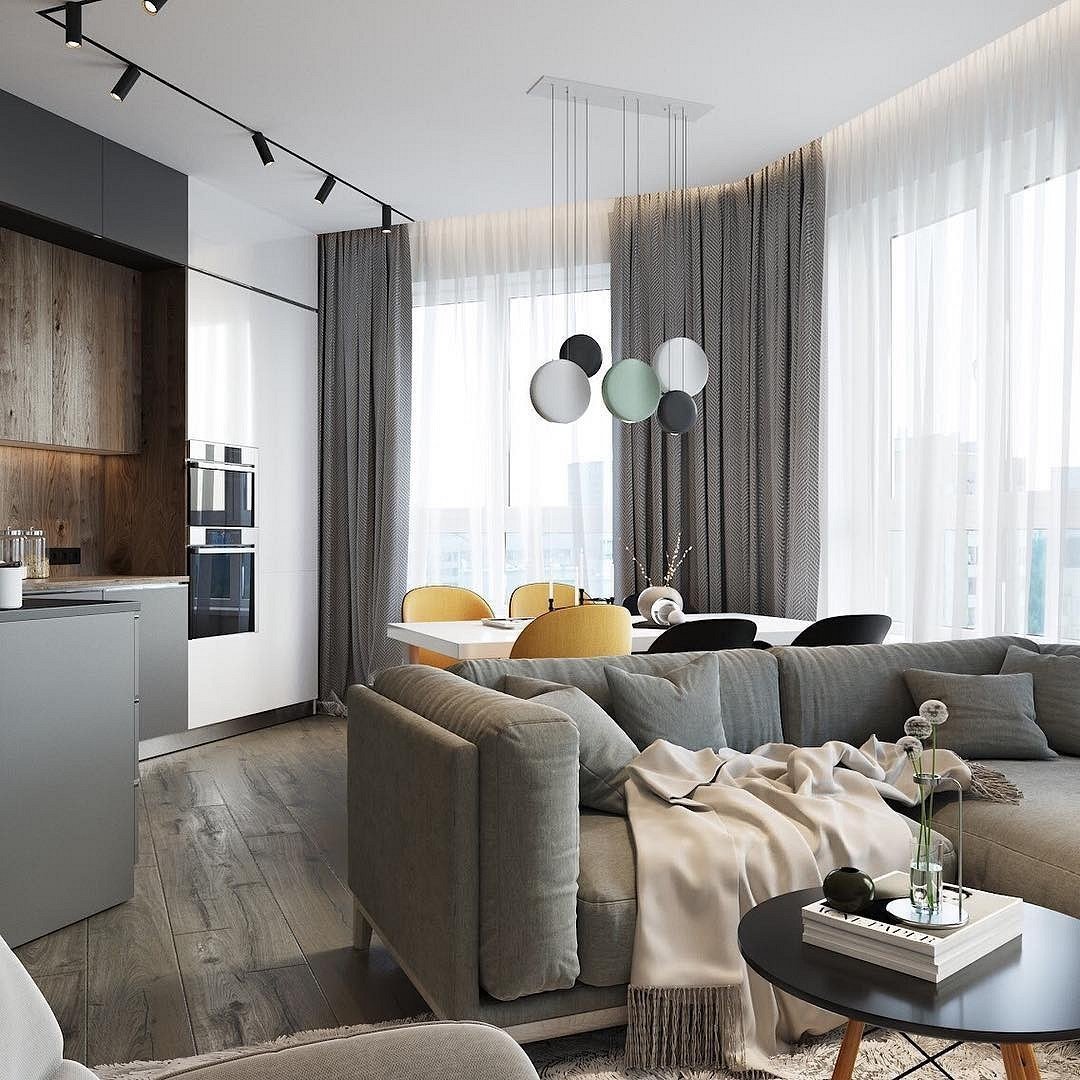 Кухня гостиная с серой кухней