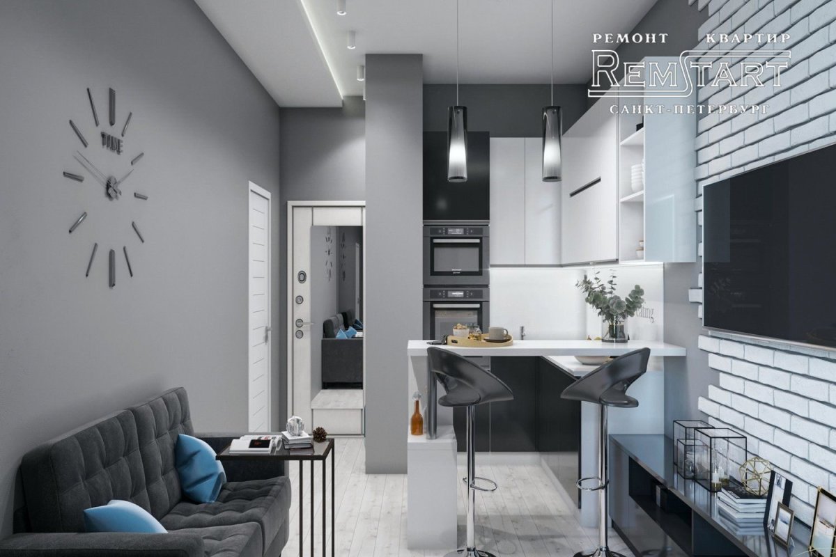 Квартира студия в серо белых тонах с акцентами
