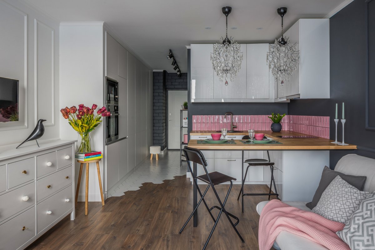 Квартира студия в серо розовых тонах