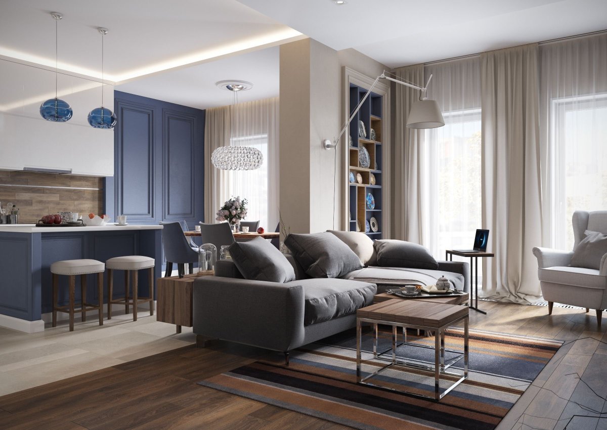 Кухня гостиная в серо синих тонах