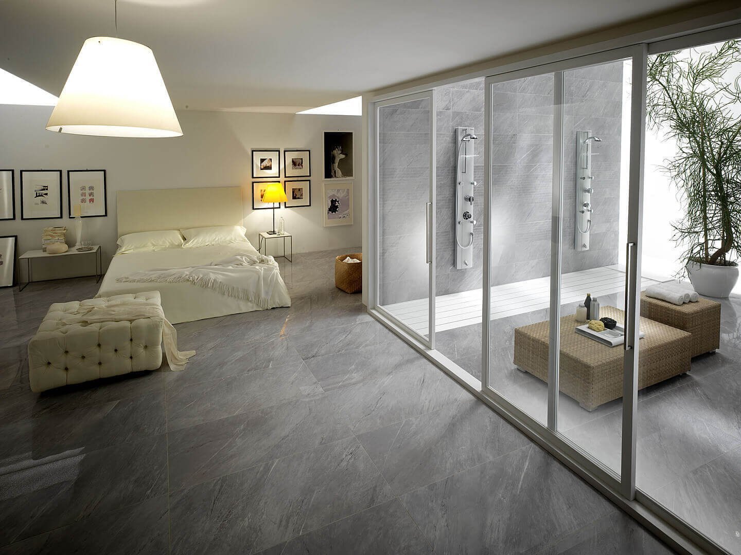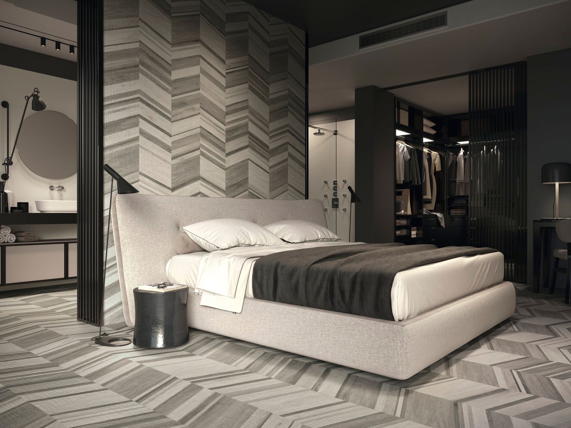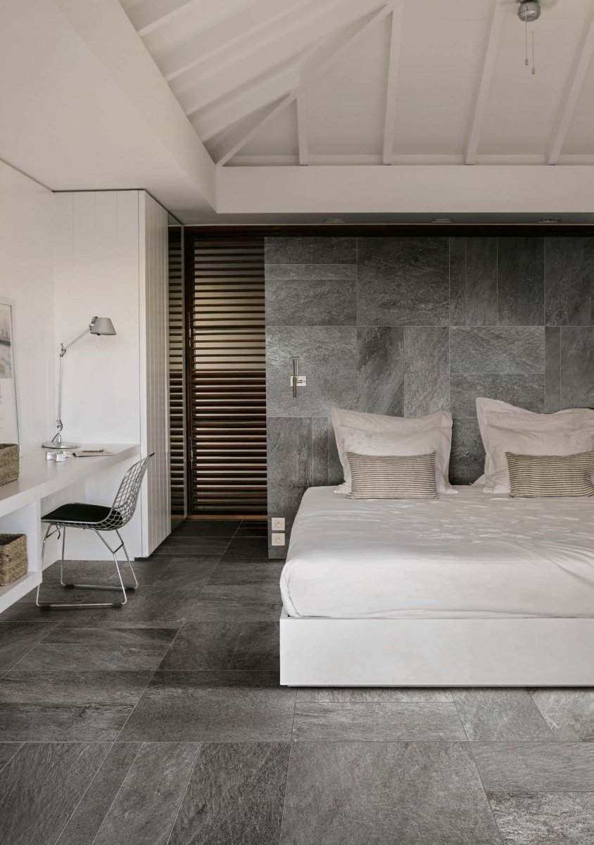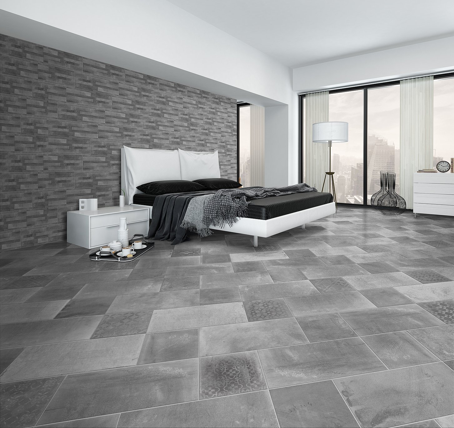 Серый керамогранит в спальне
