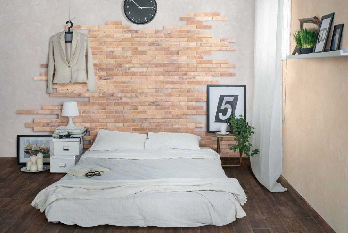 Декоративная плитка под кирпич в спальне