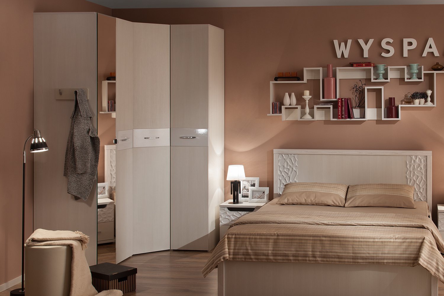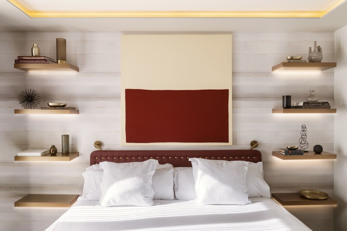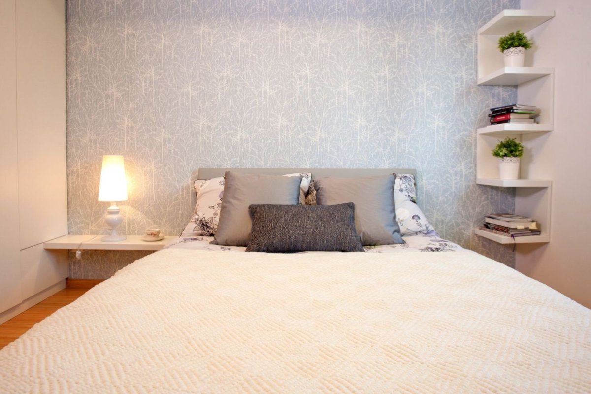 Угловые полочки над кроватью в спальне