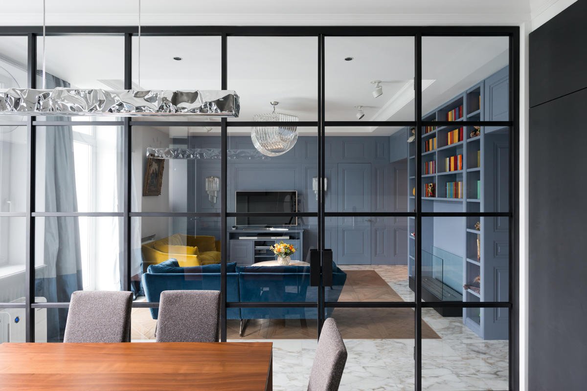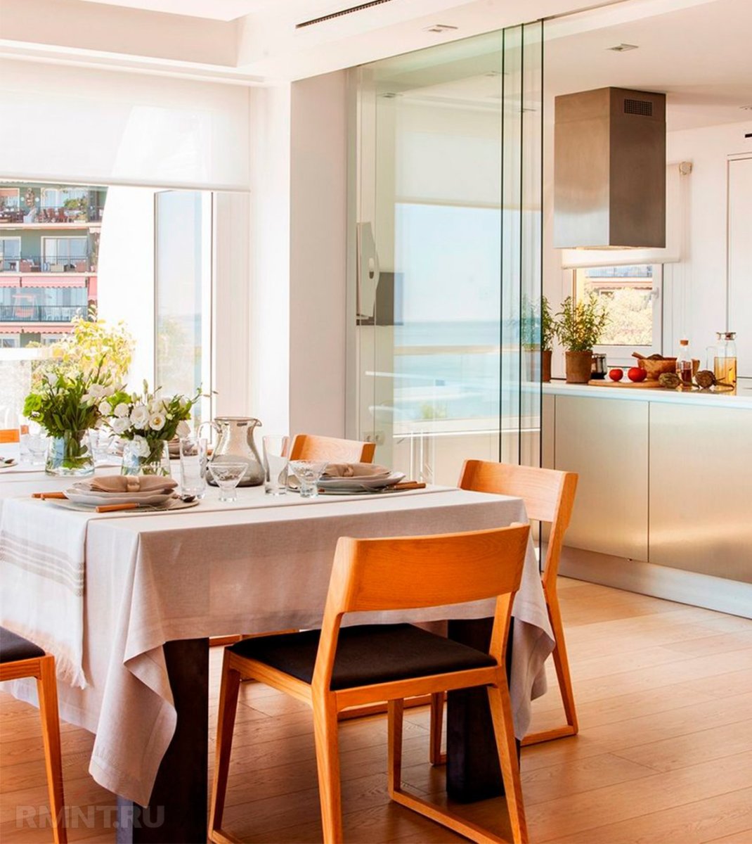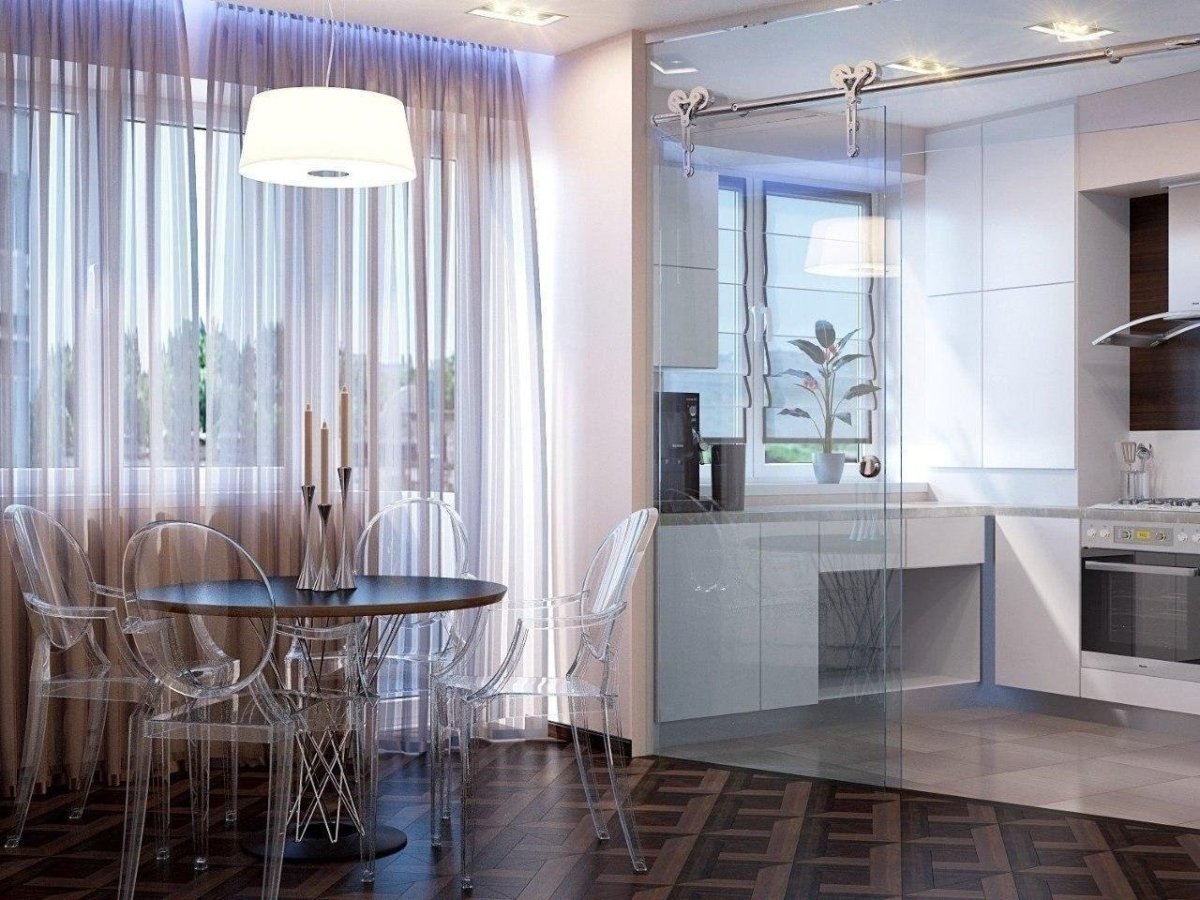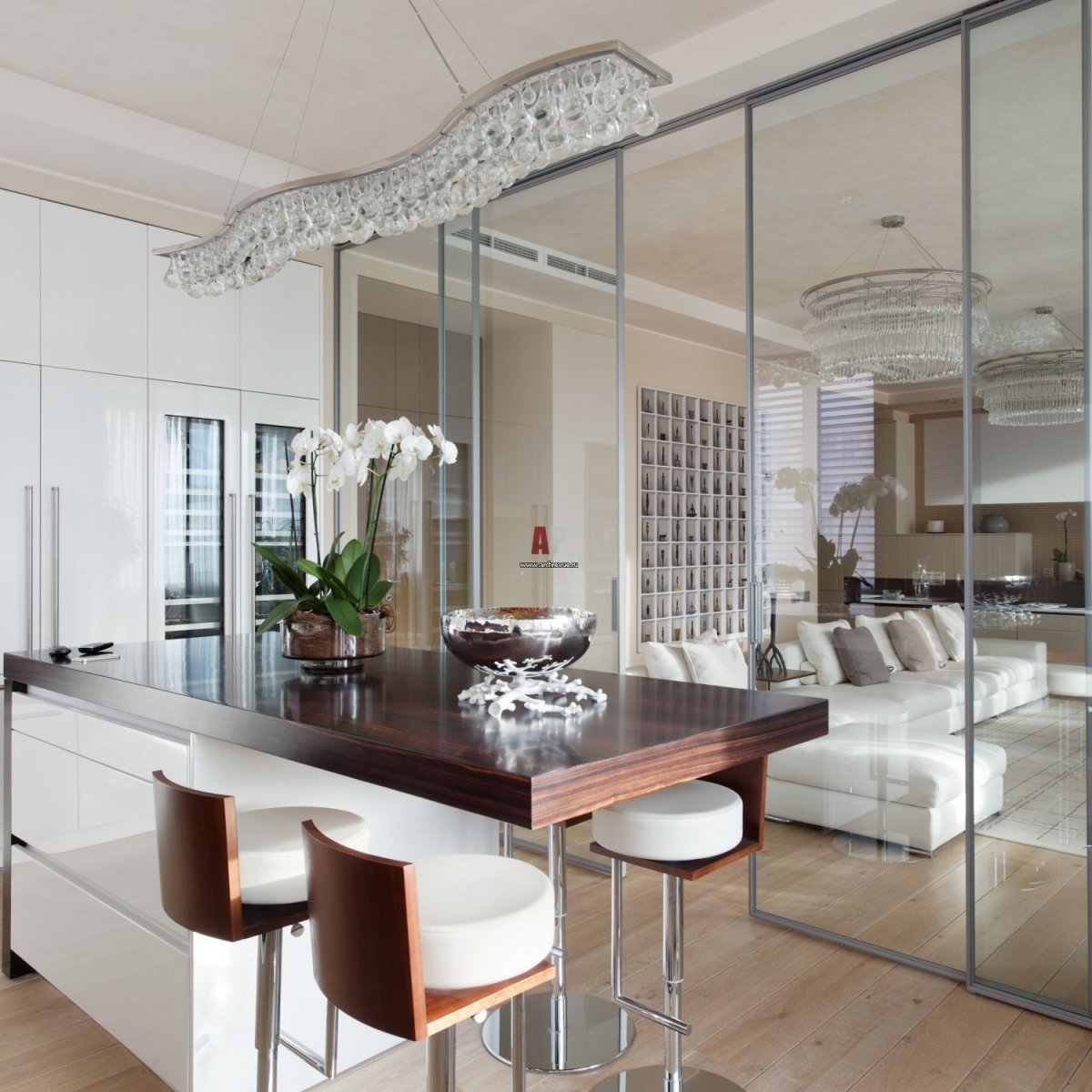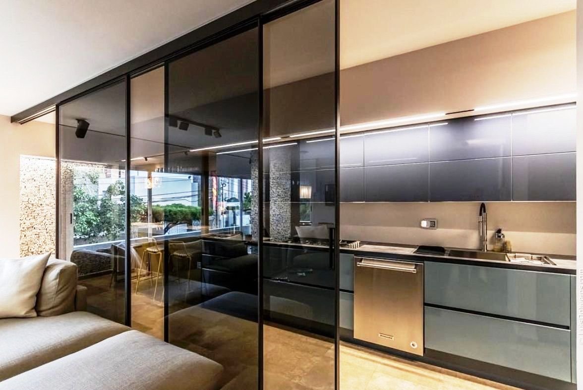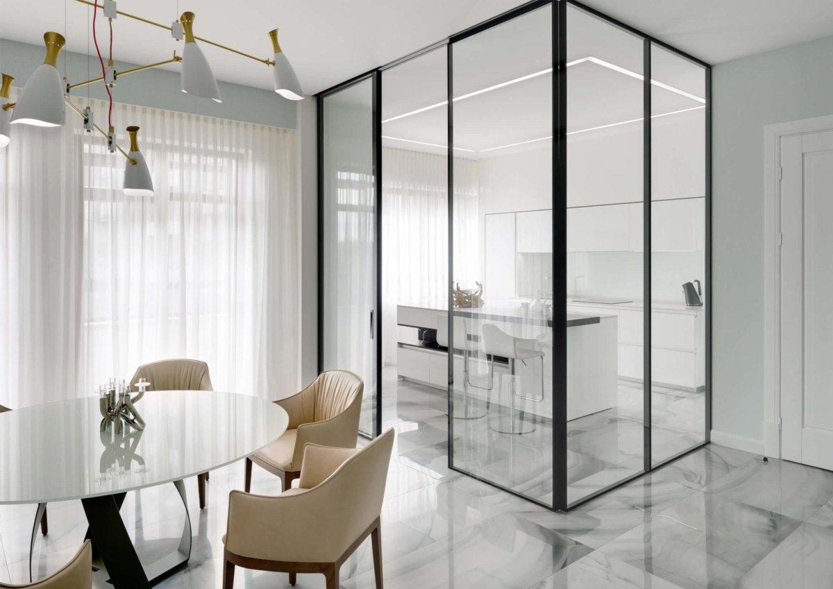 Раздвижная стеклянная перегородка между кухней и гостиной