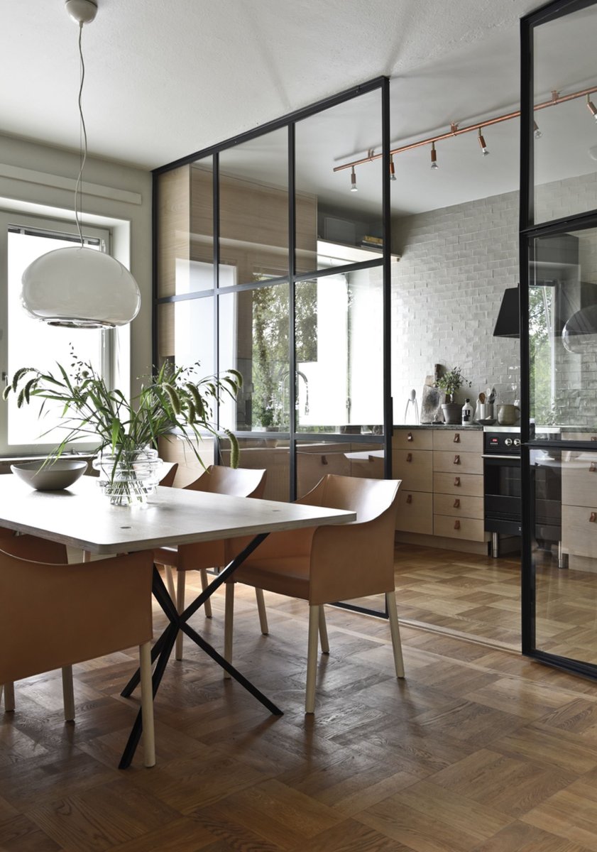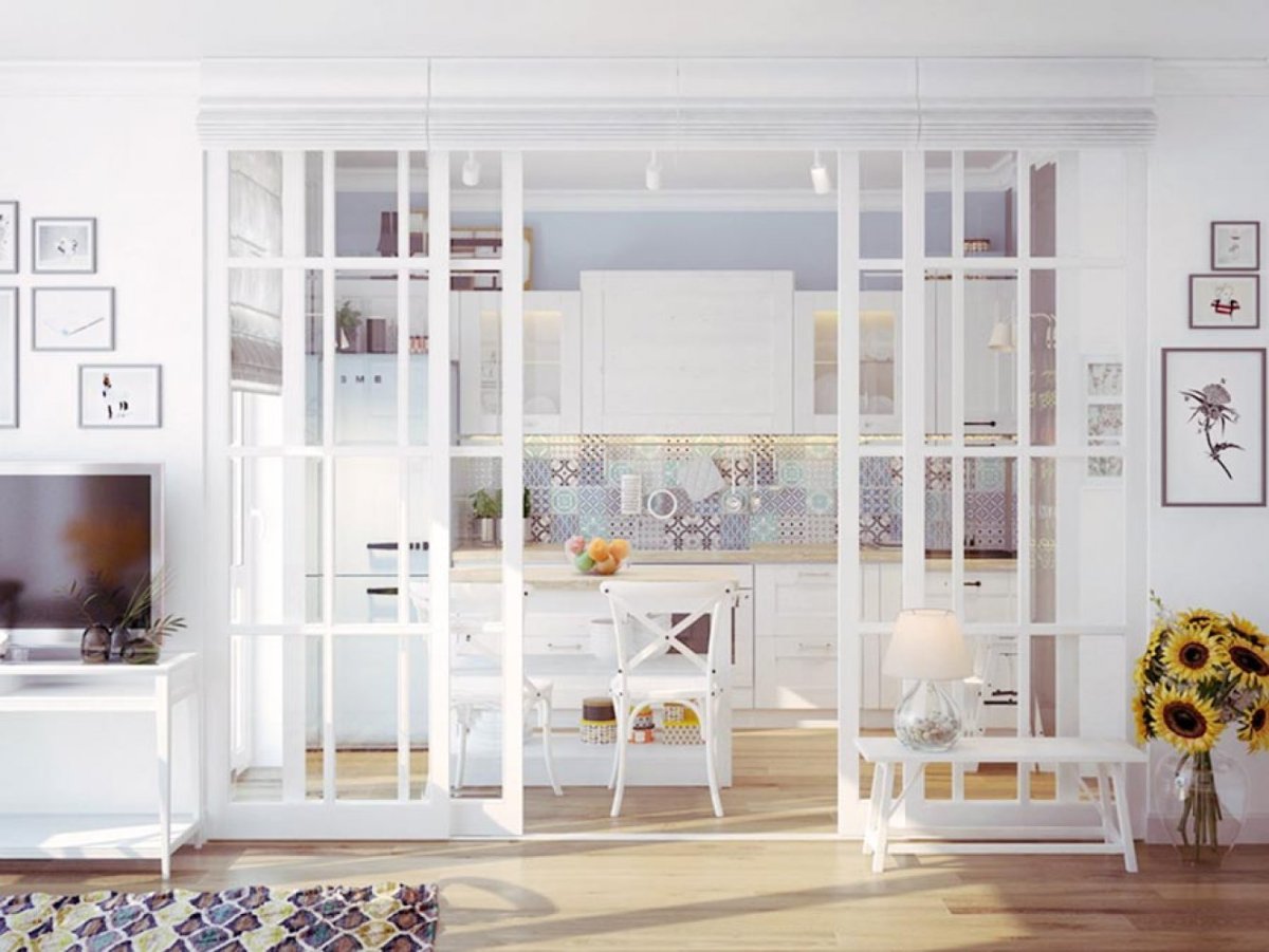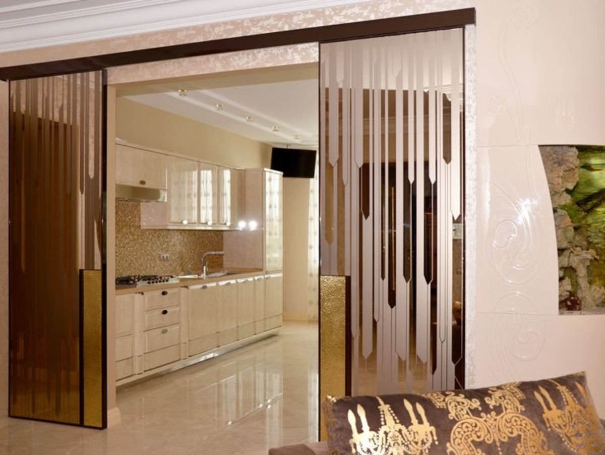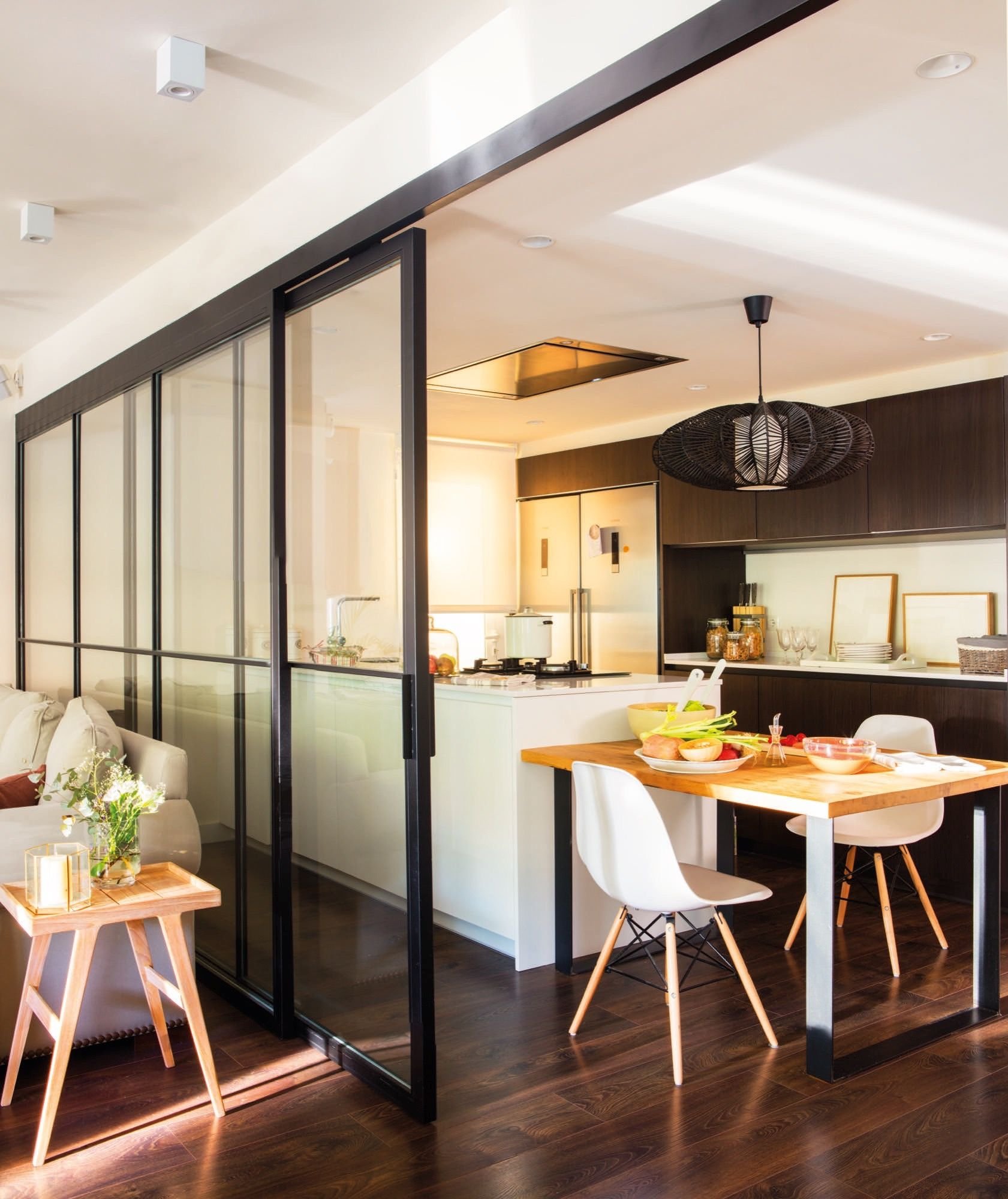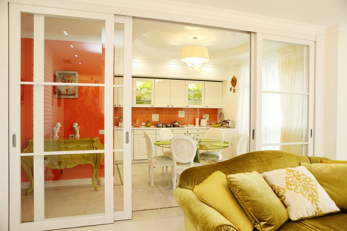 Раздвижная стеклянная перегородка между кухней и гостиной