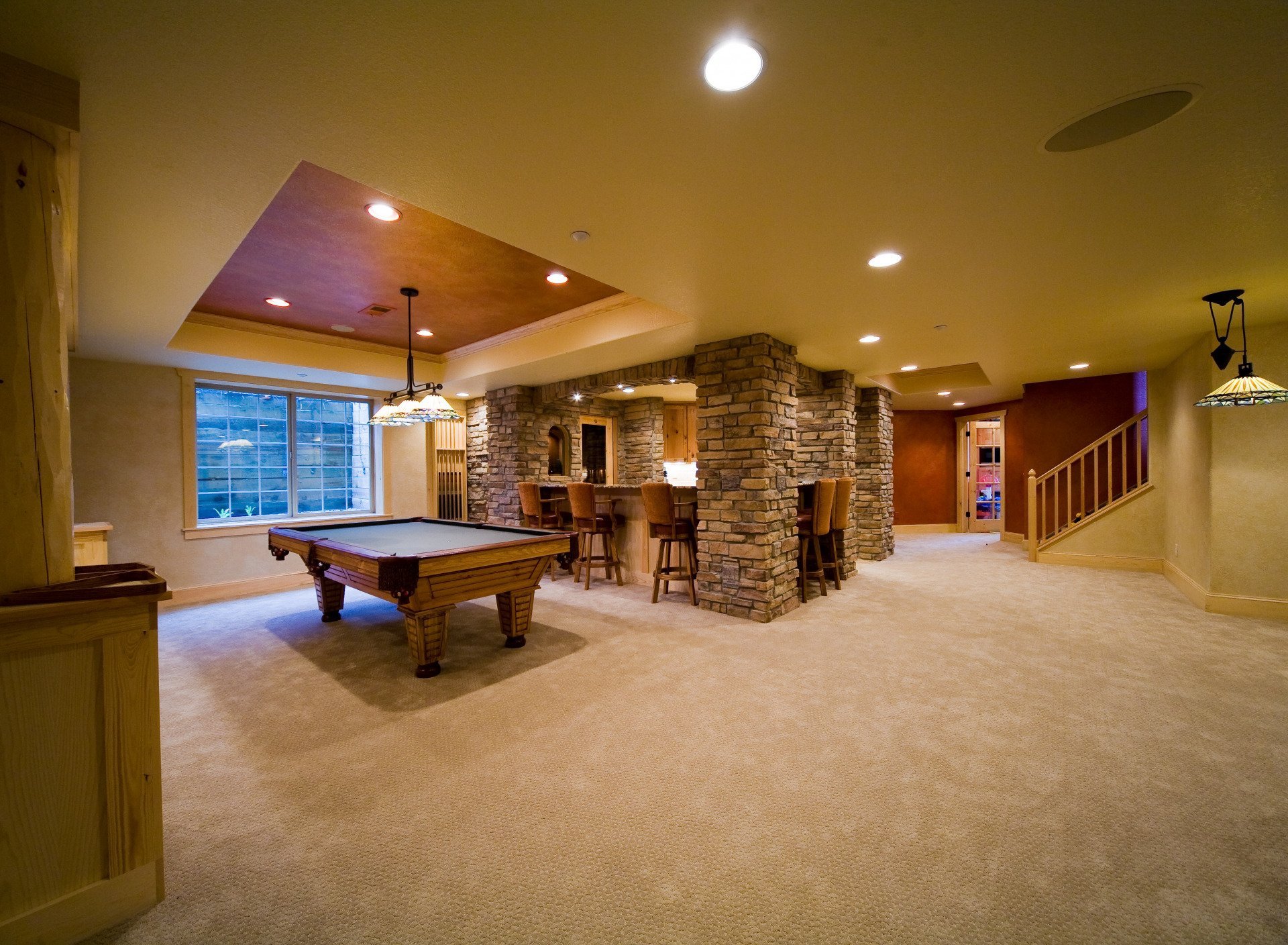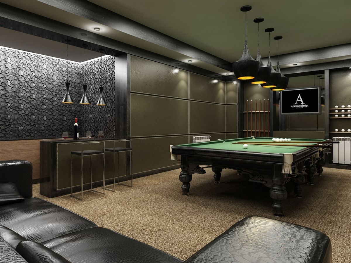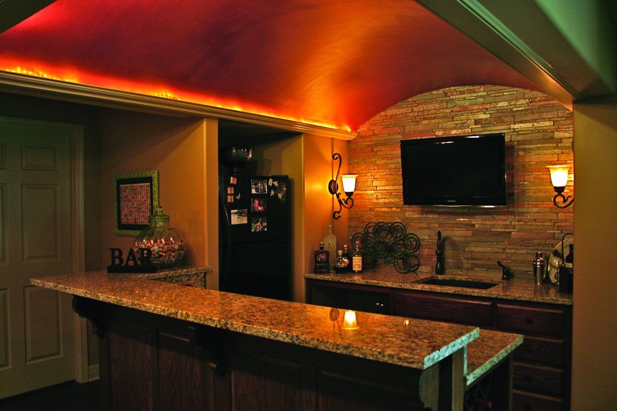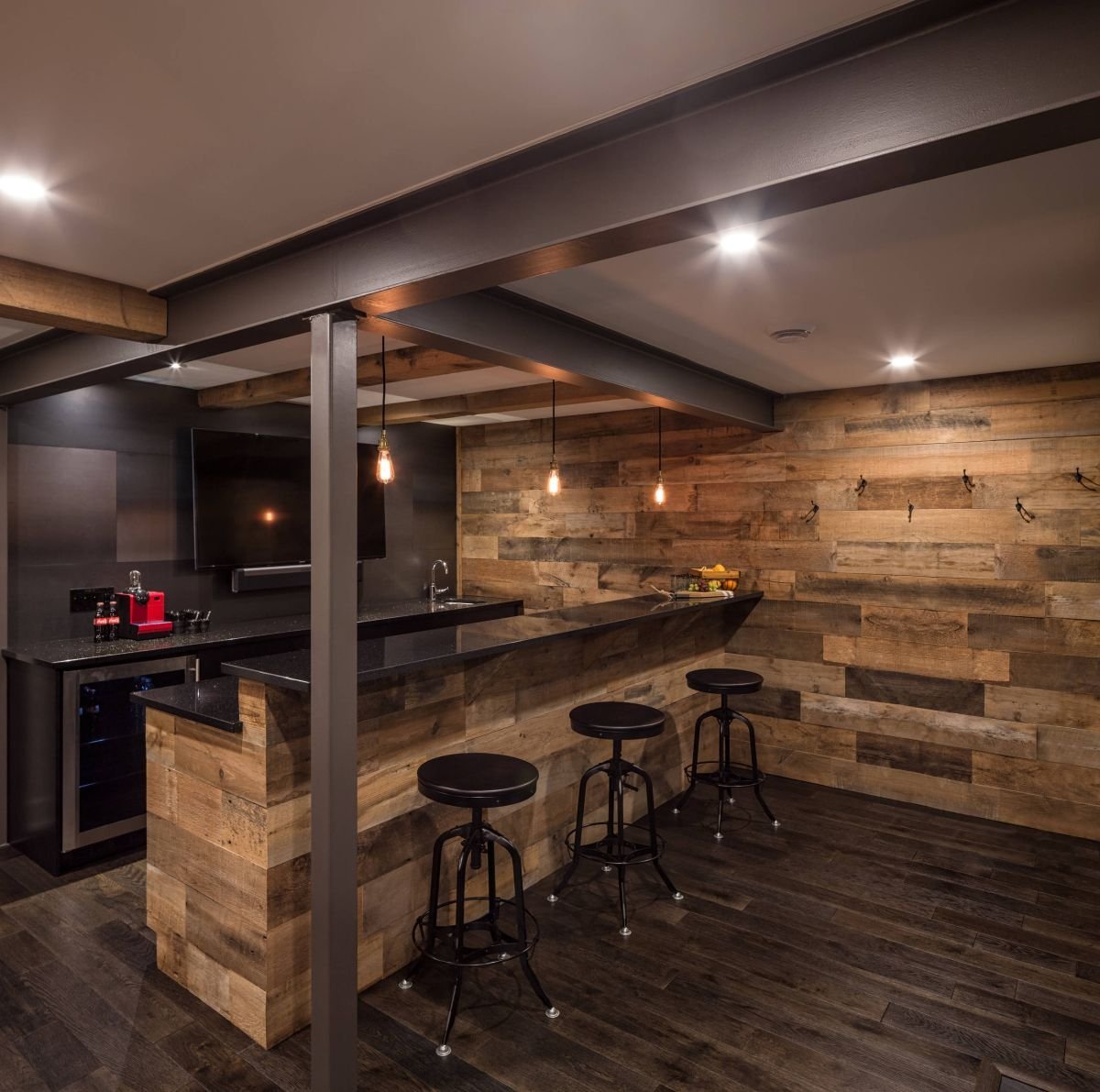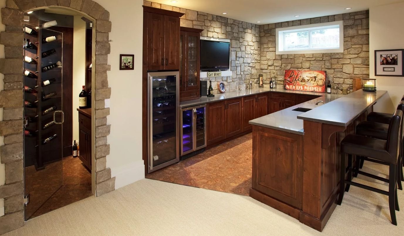 Дизайн подвала для отдыха с барной стойкой под лестницей