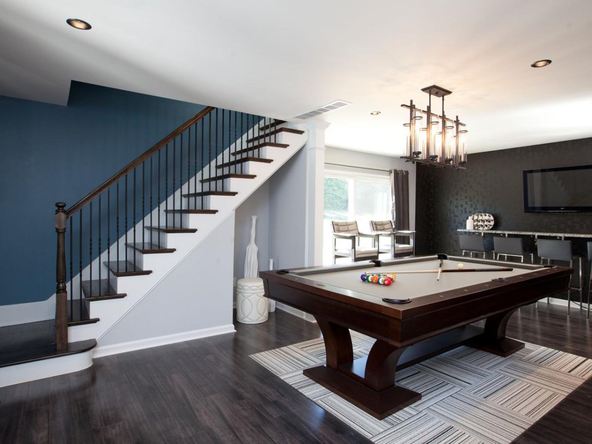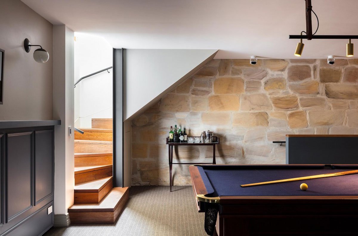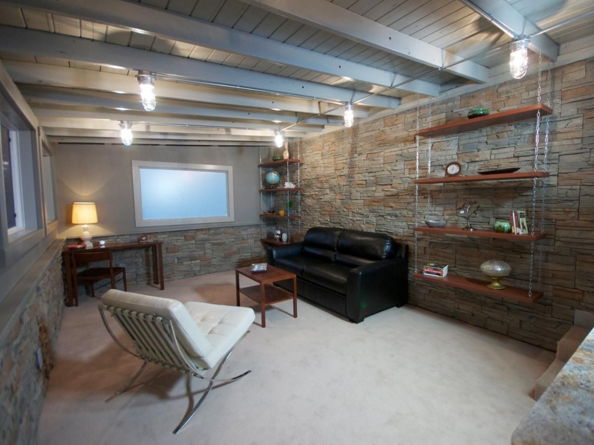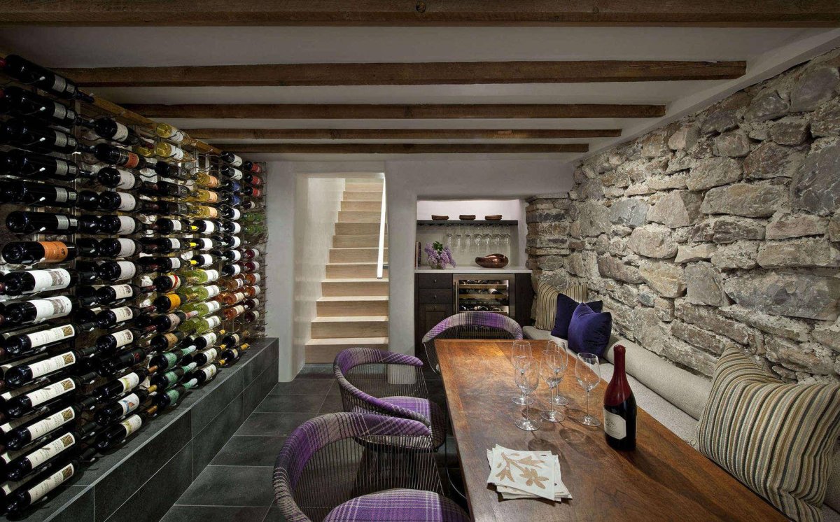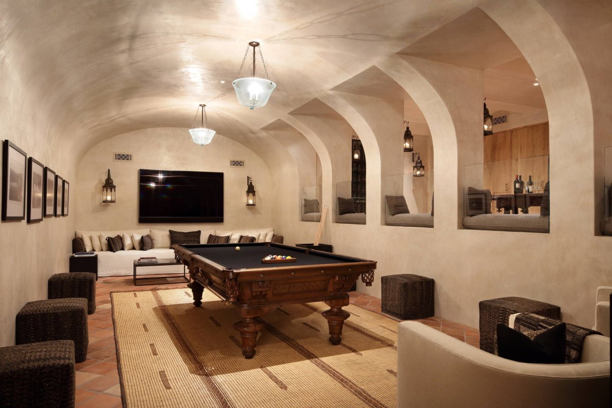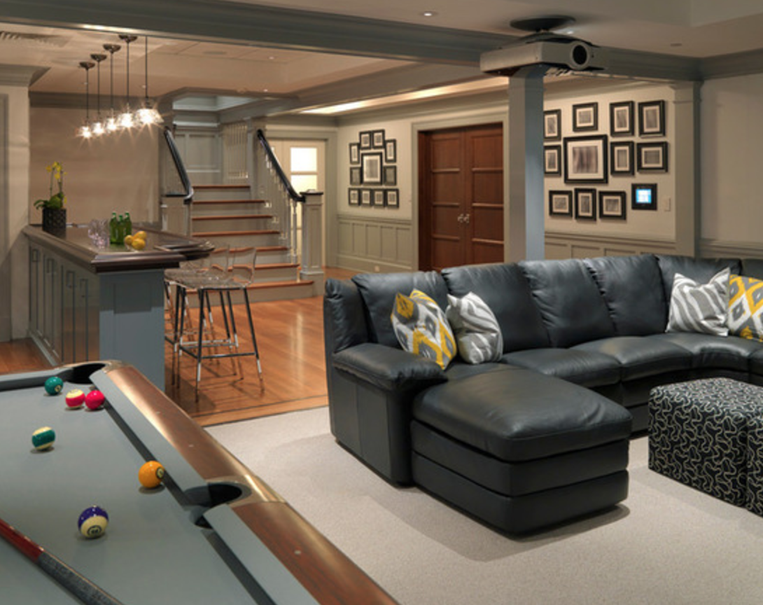 Дизайн подвала для отдыха с барной стойкой под лестницей