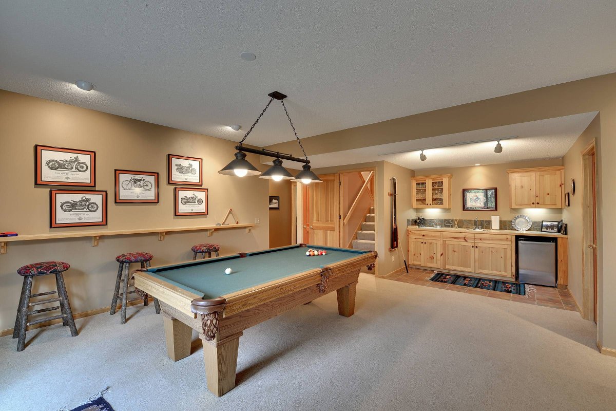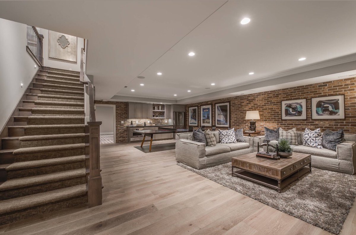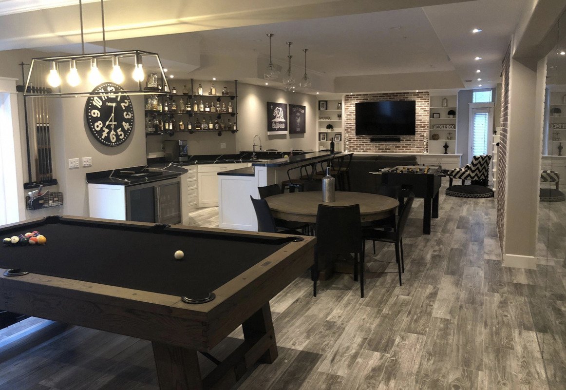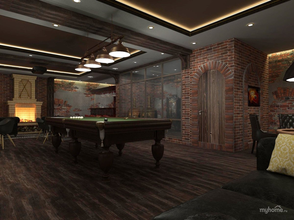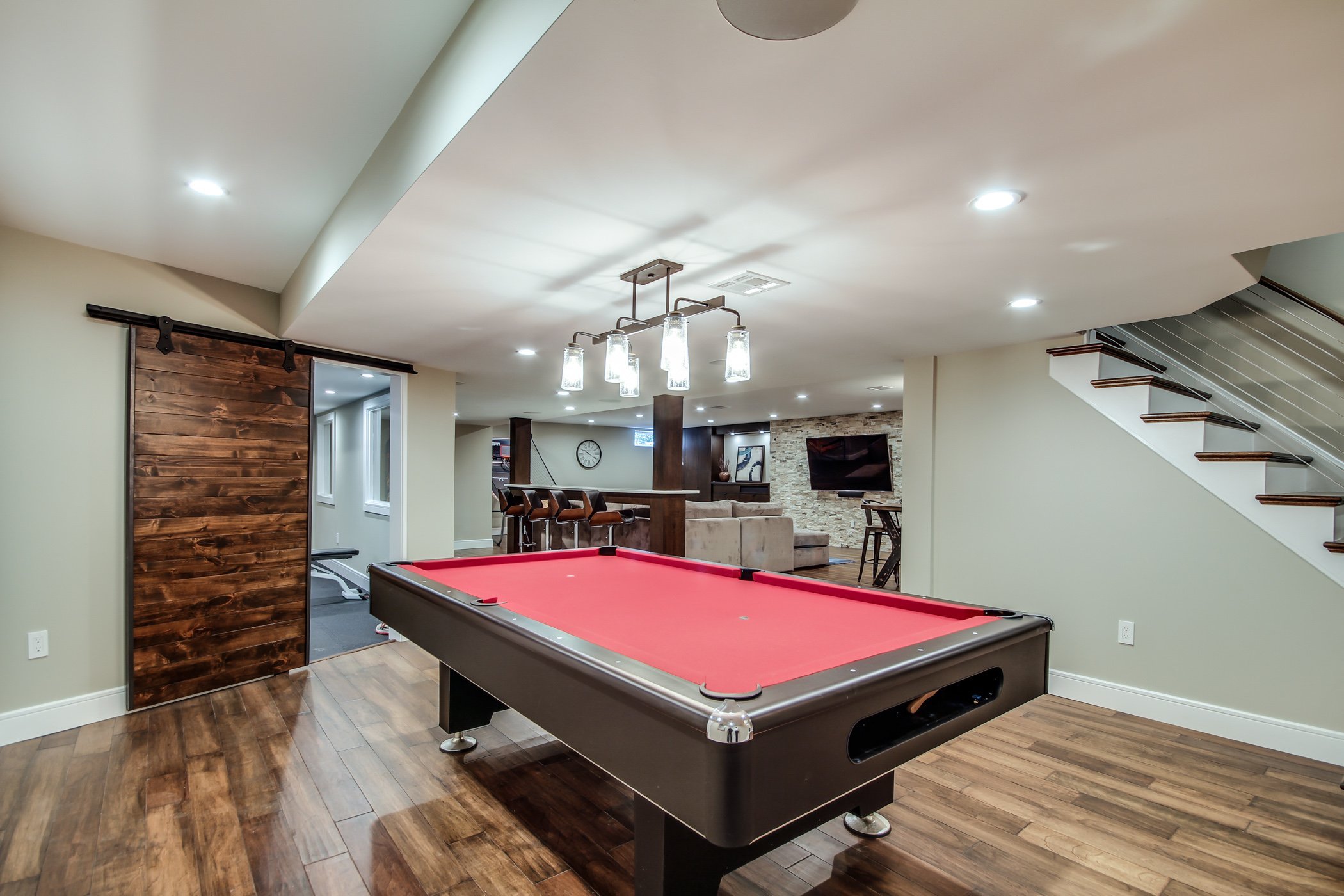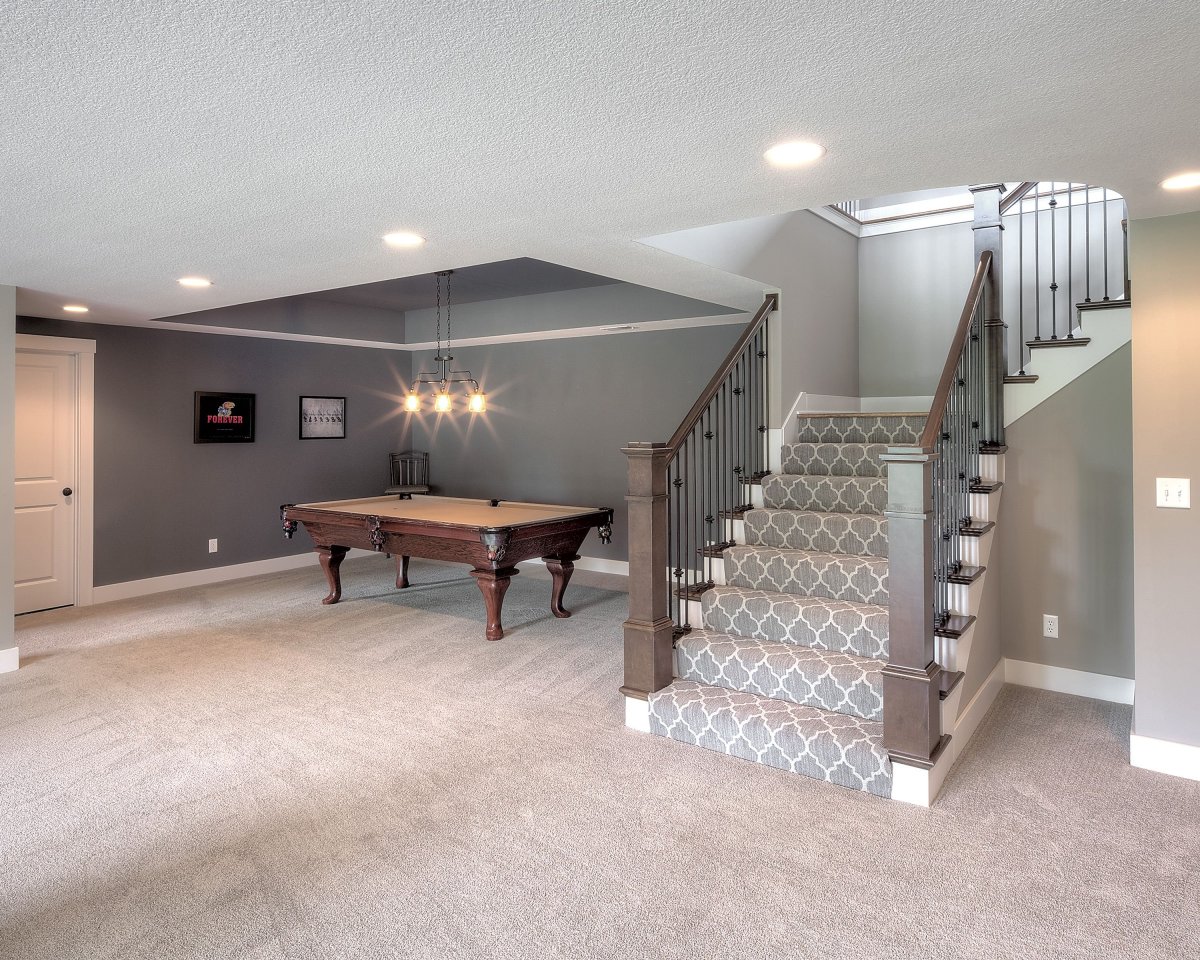 Дизайн подвала для отдыха с барной стойкой под лестницей