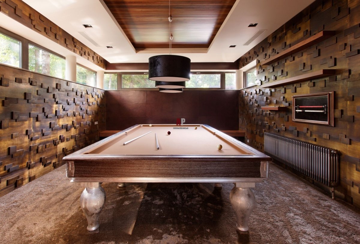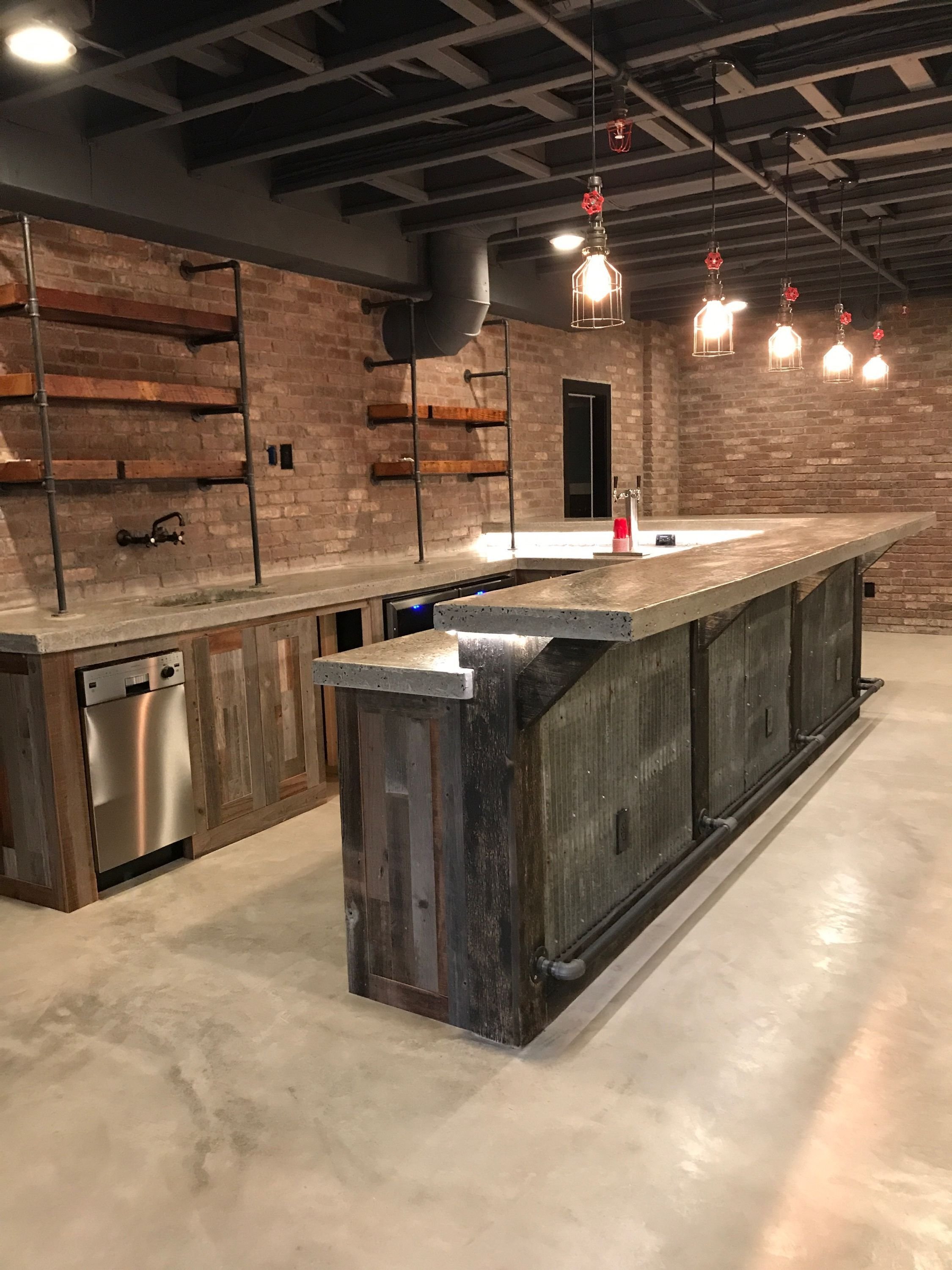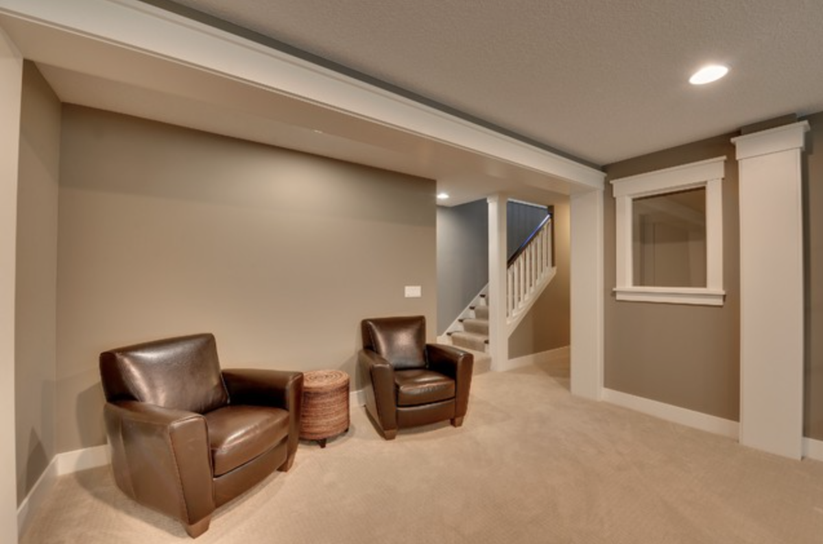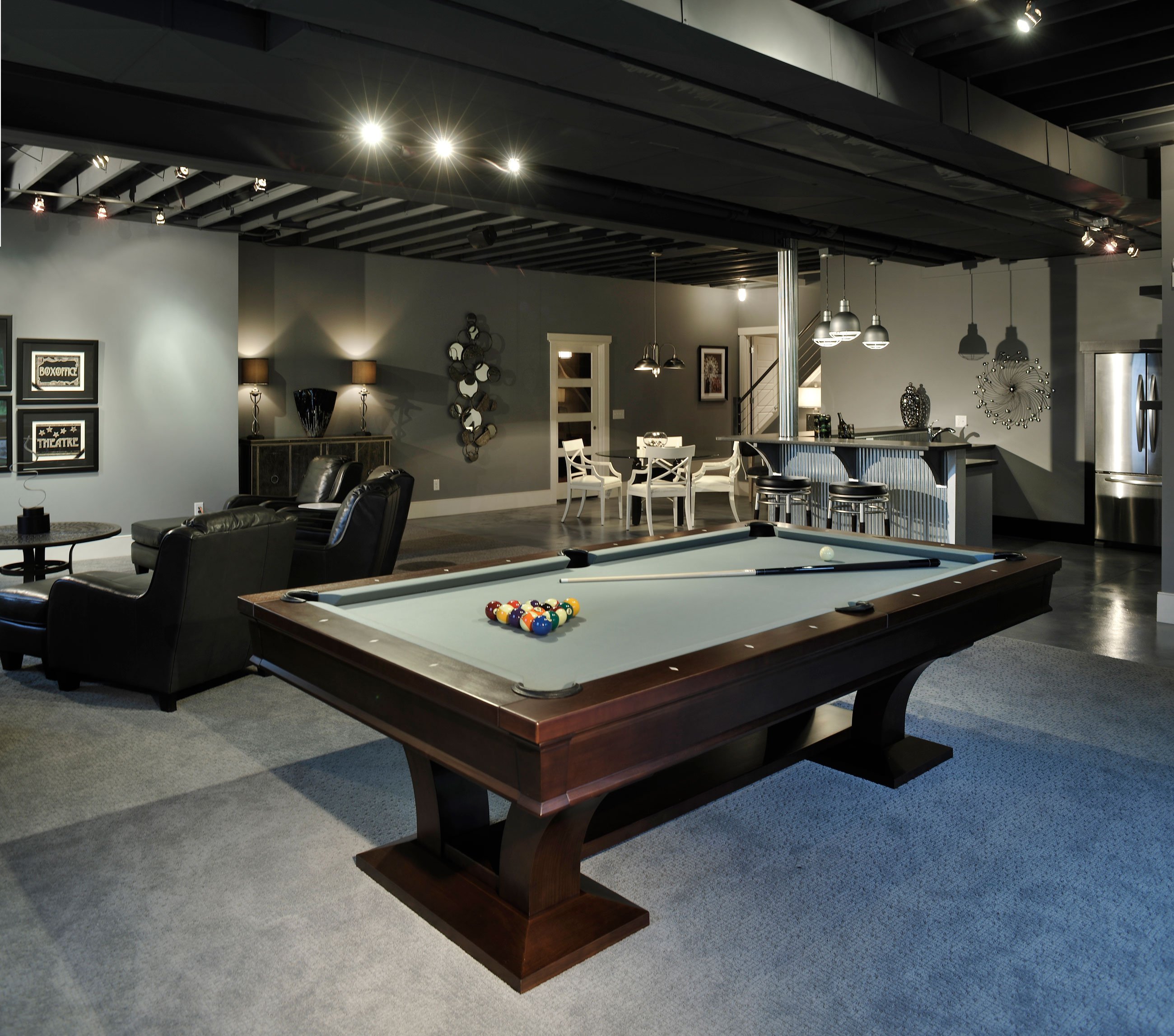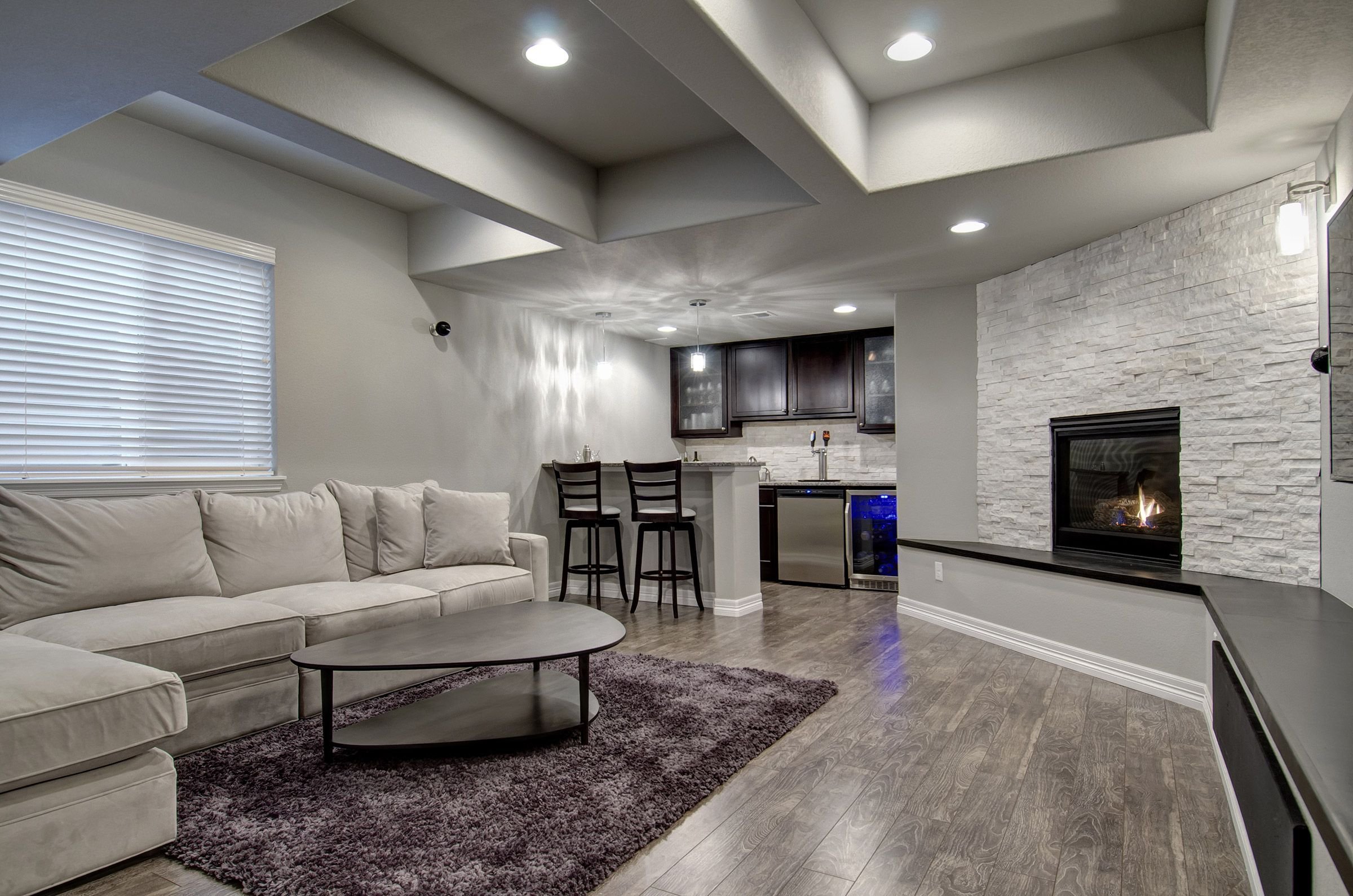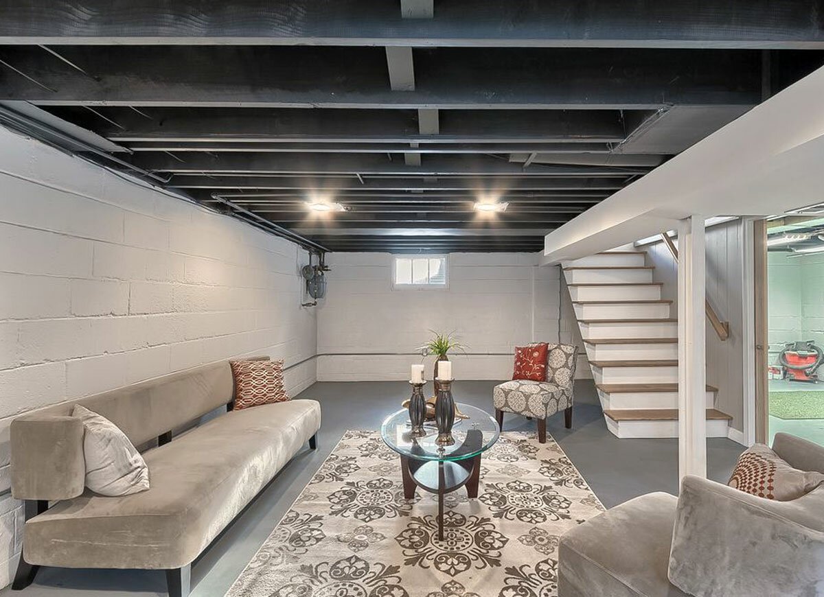 Дизайн подвала для отдыха с барной стойкой под лестницей