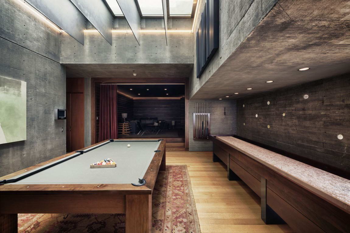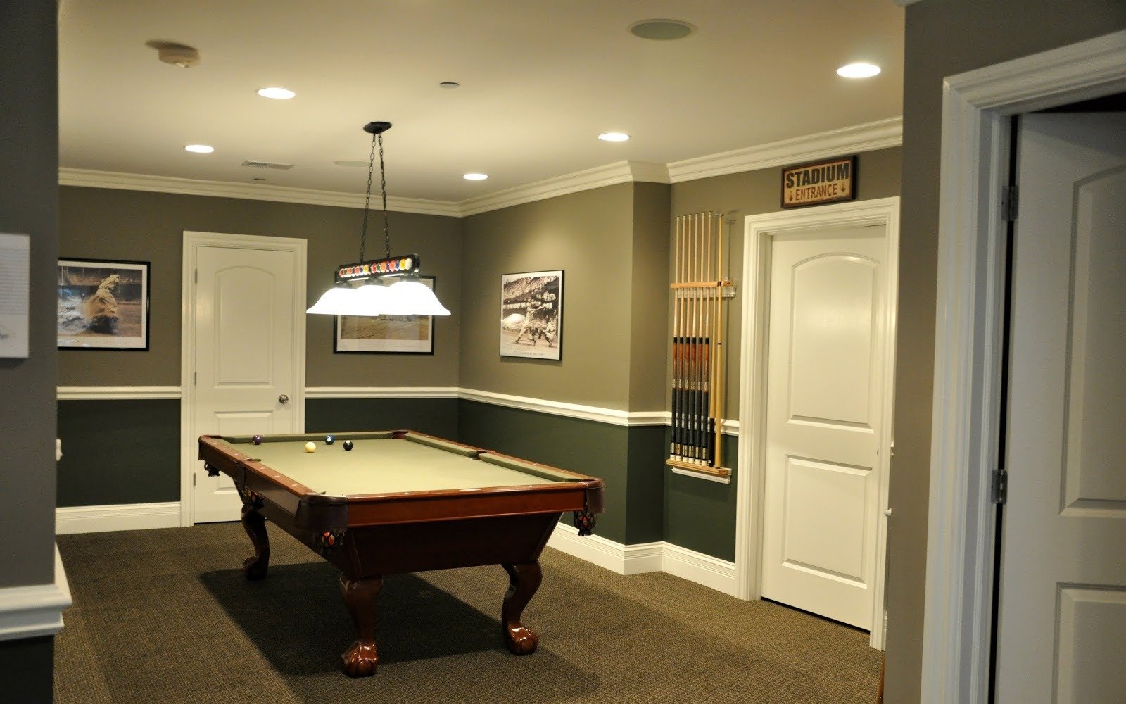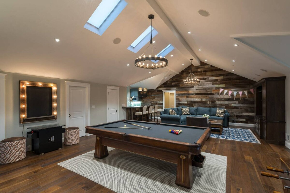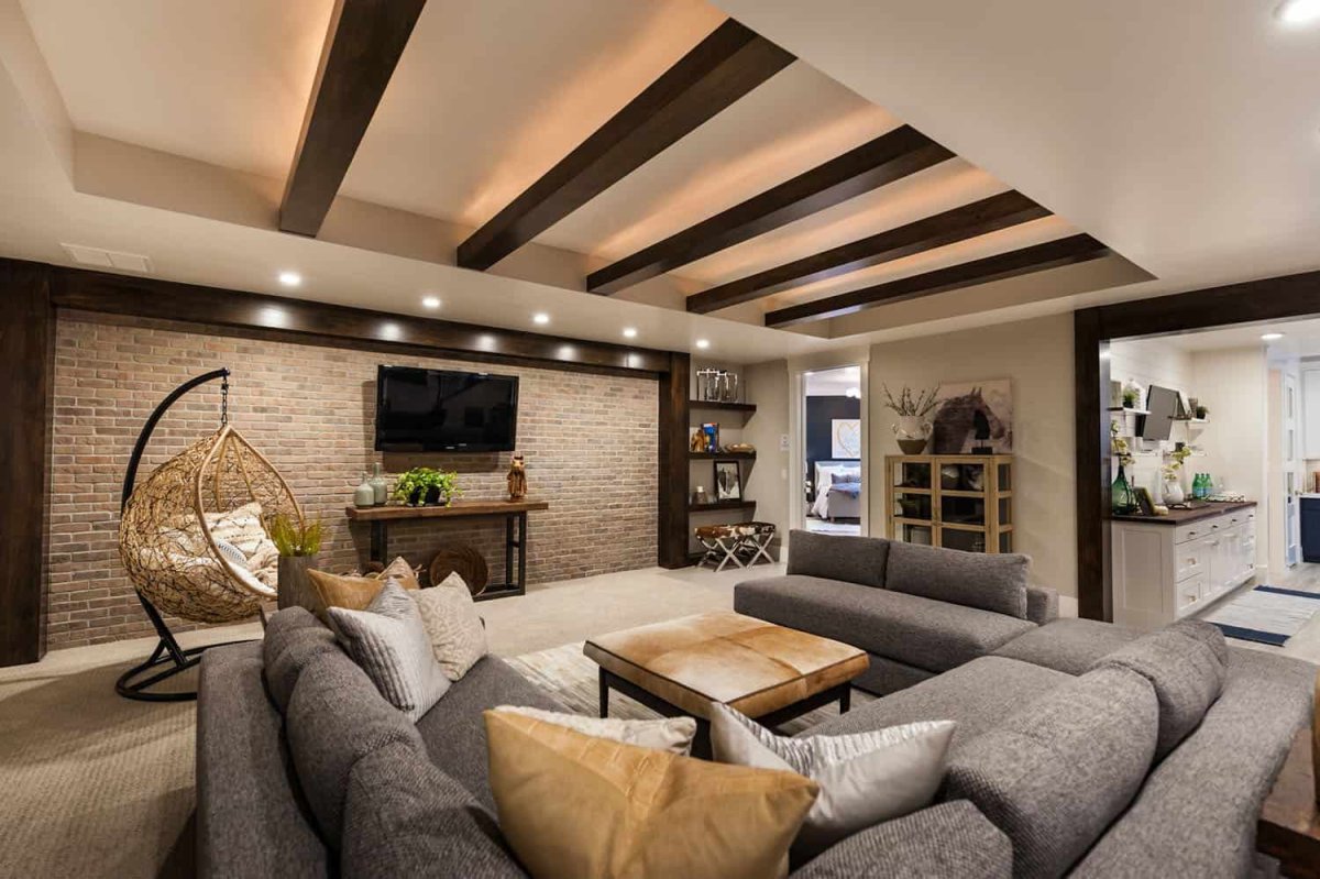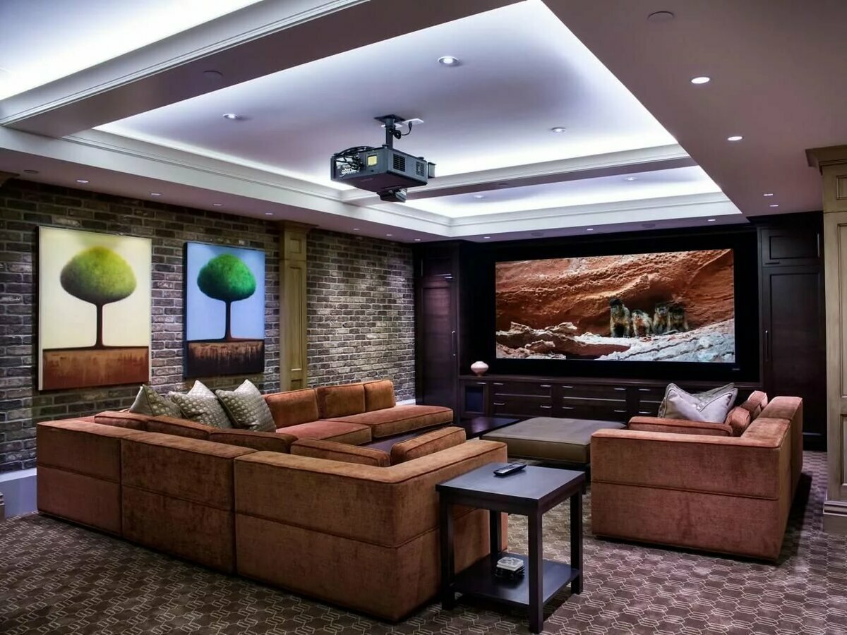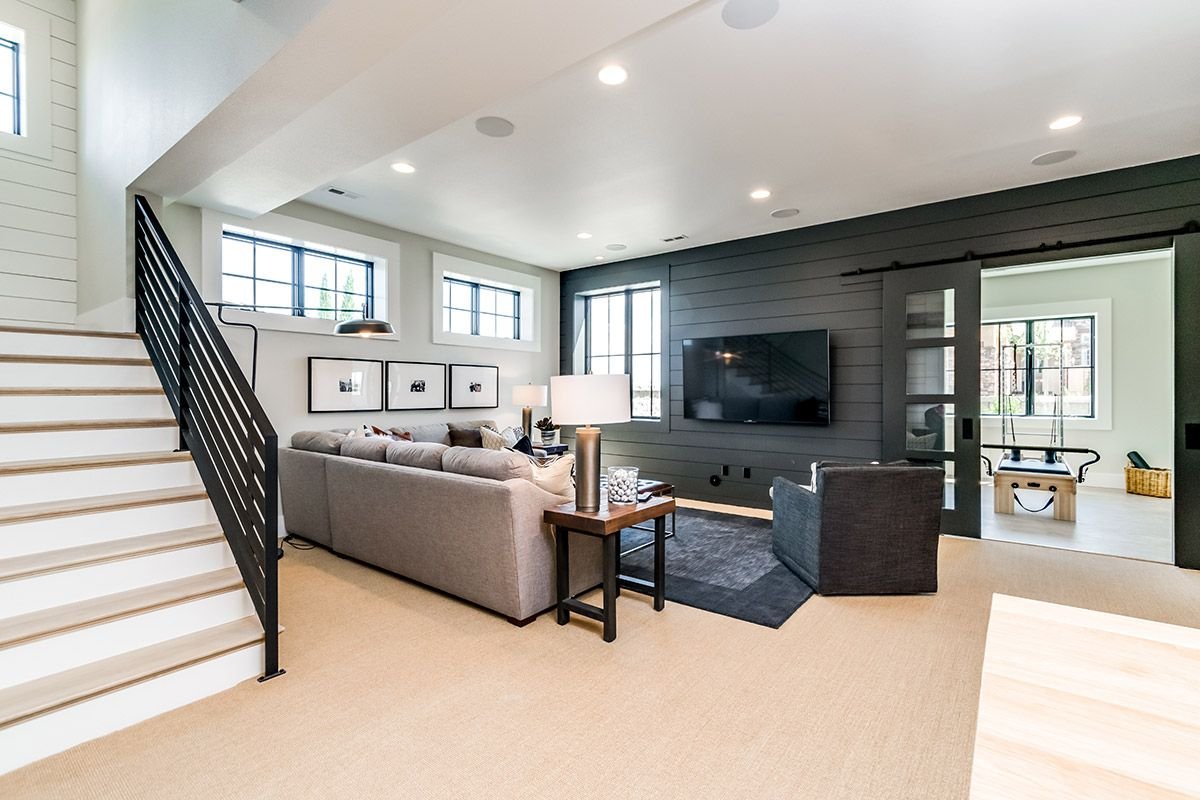 Дизайн подвала для отдыха с барной стойкой под лестницей