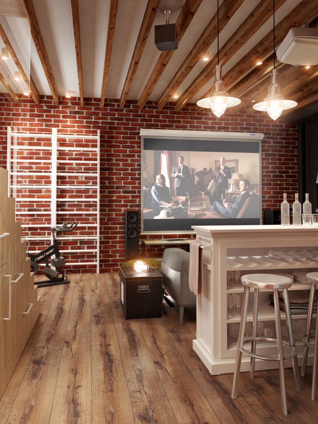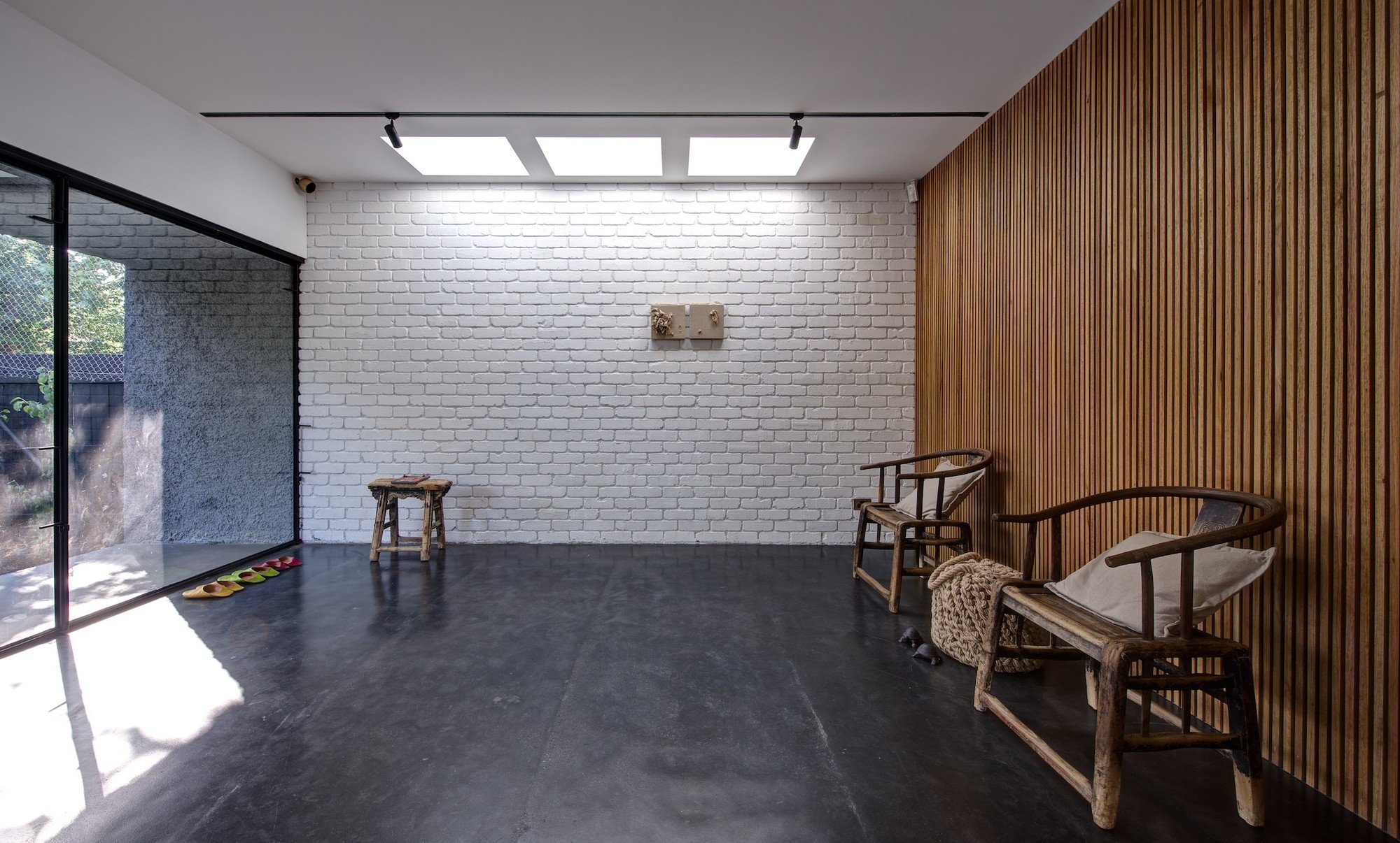 Рейки и кирпич в интерьере