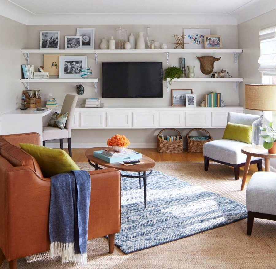 Полки в интерьере гостиной