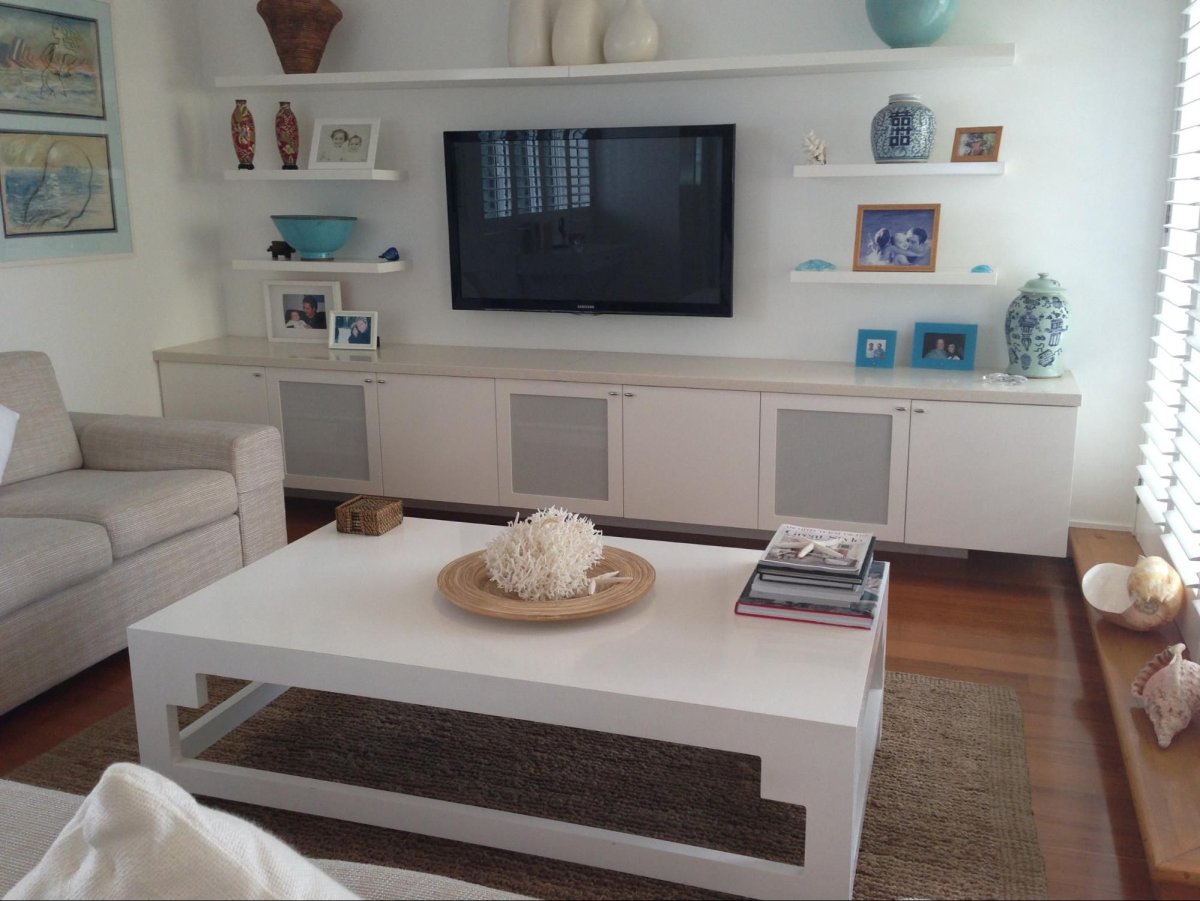 Полки над телевизором в гостиной