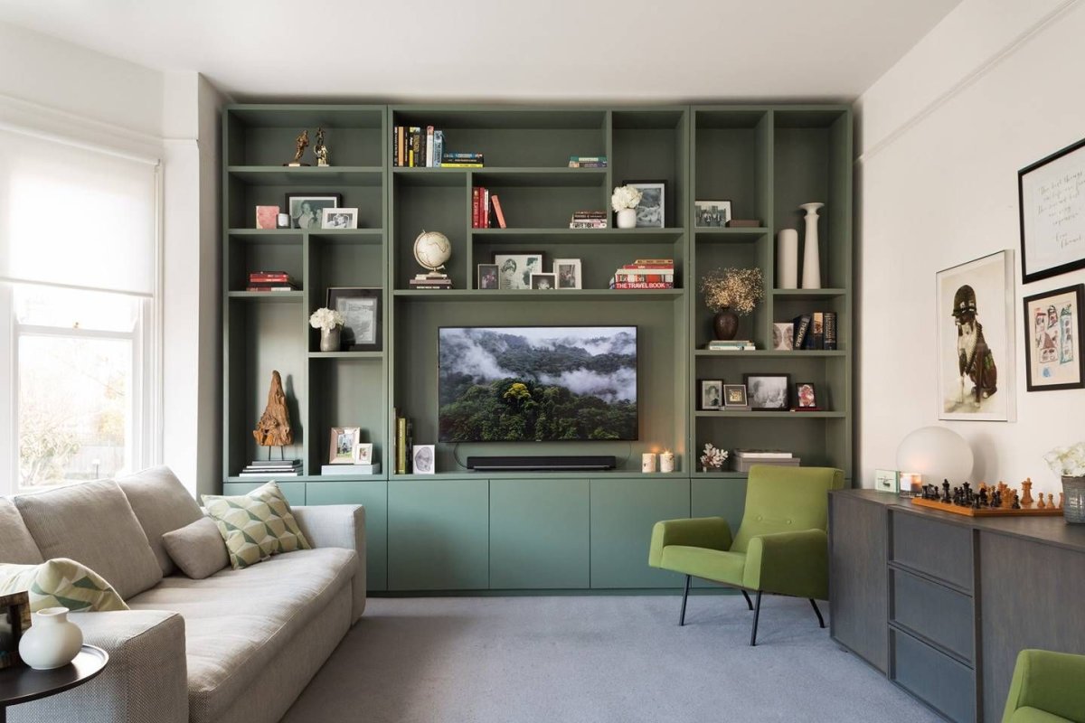 Стеллажи над телевизором в гостиной