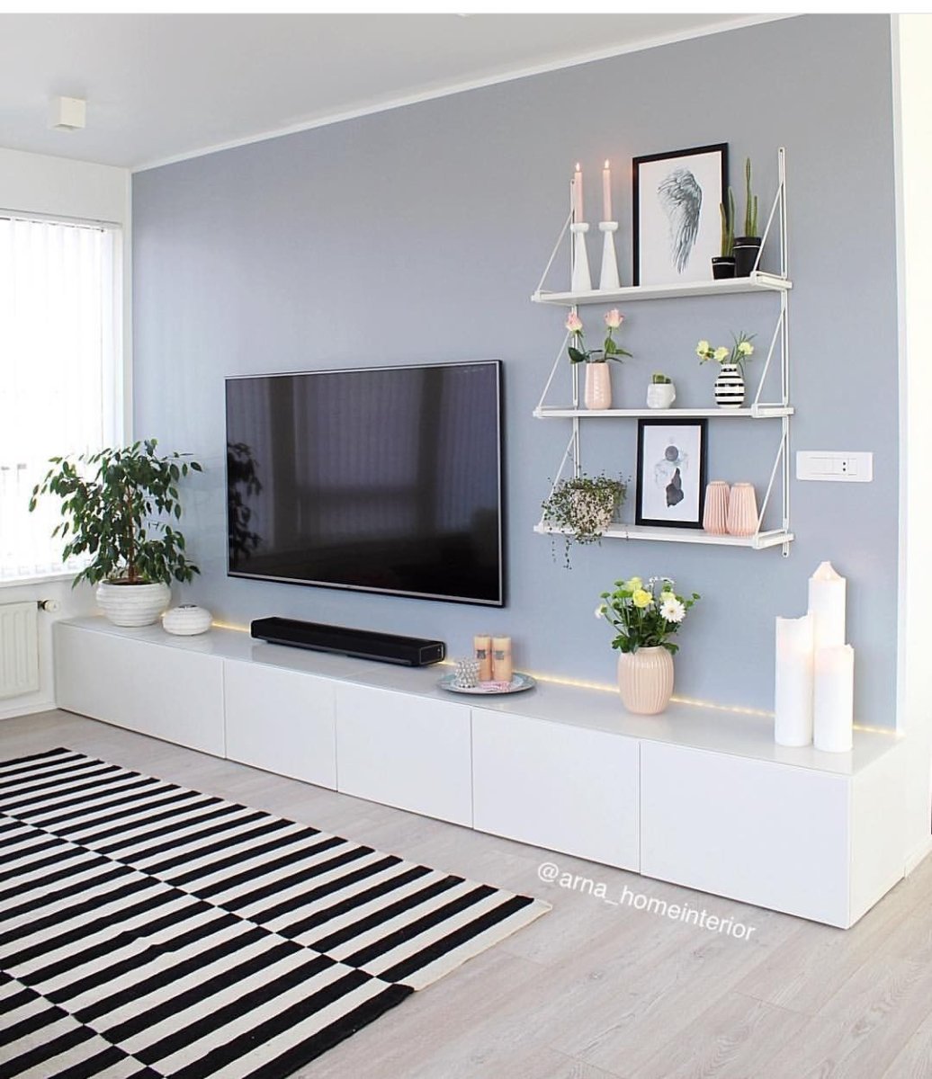 Белая полка в интерьере гостиной над телевизором