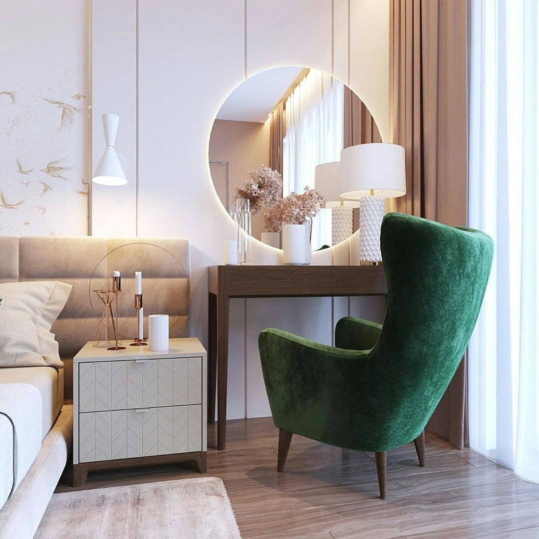 Зеленое кресло в интерьере спальни
