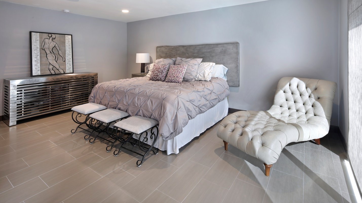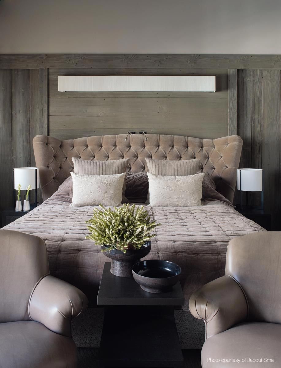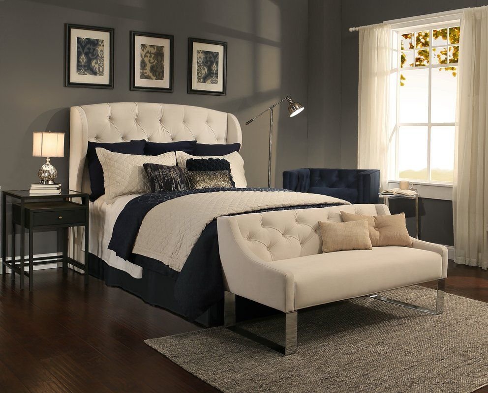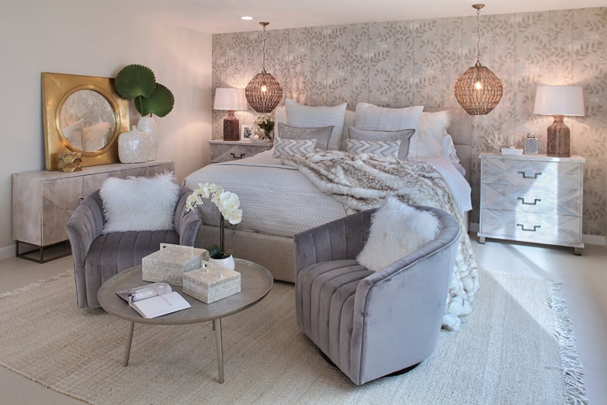 Серая кровать в интерьере спальни