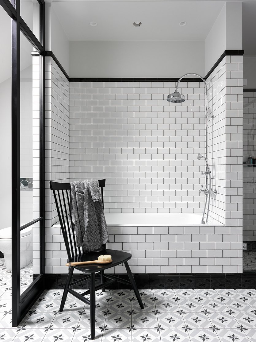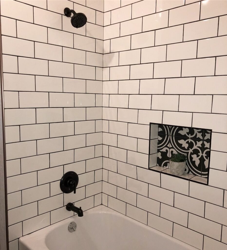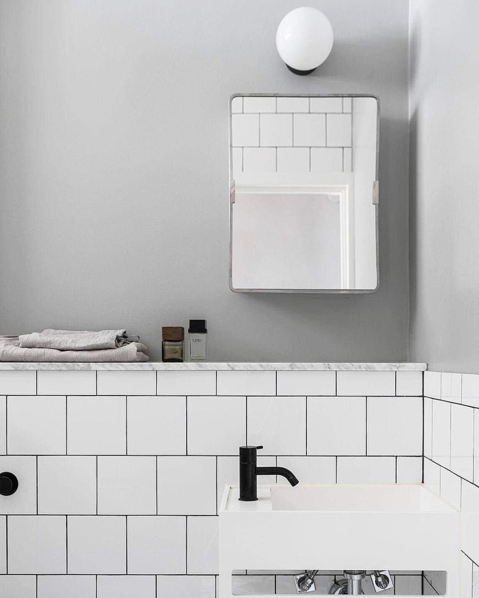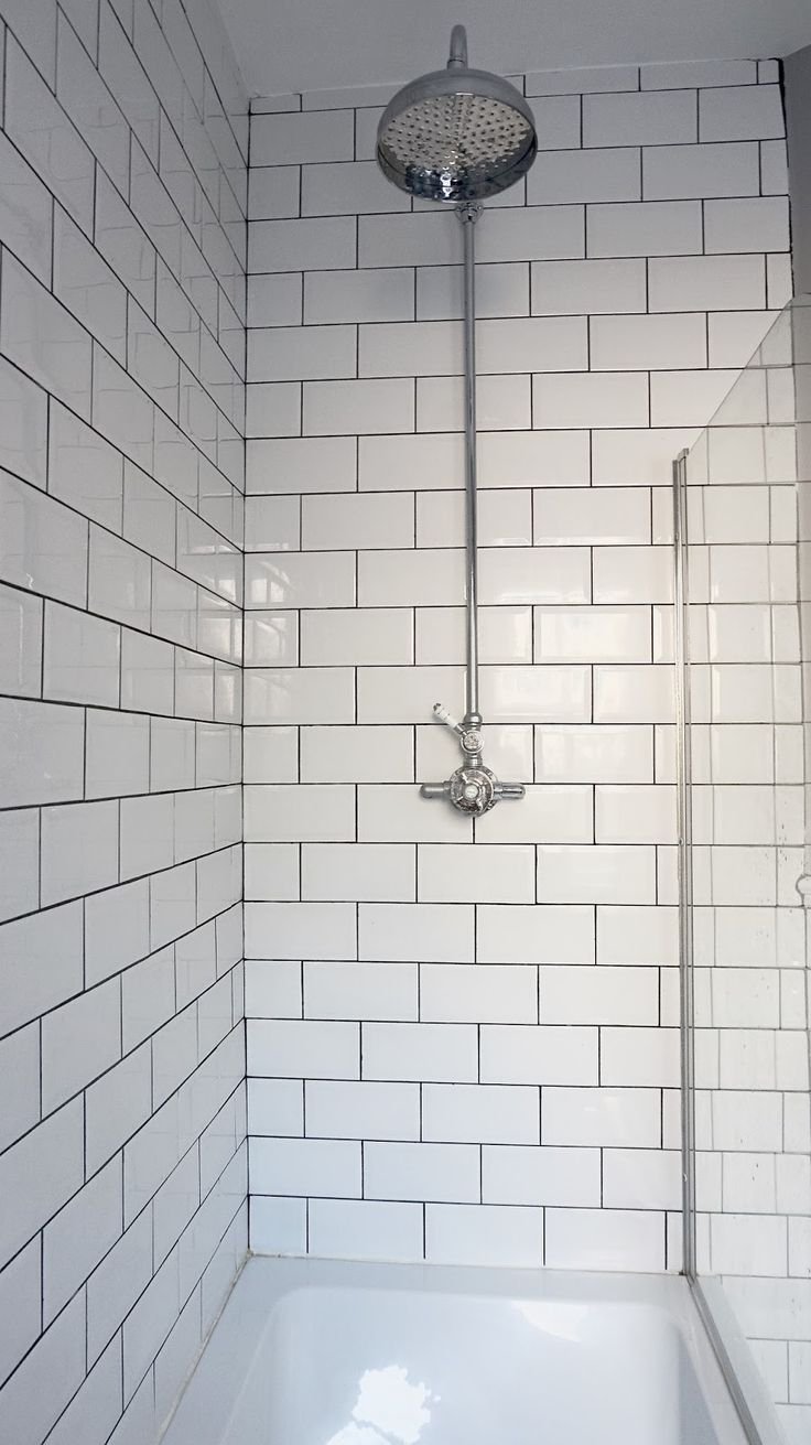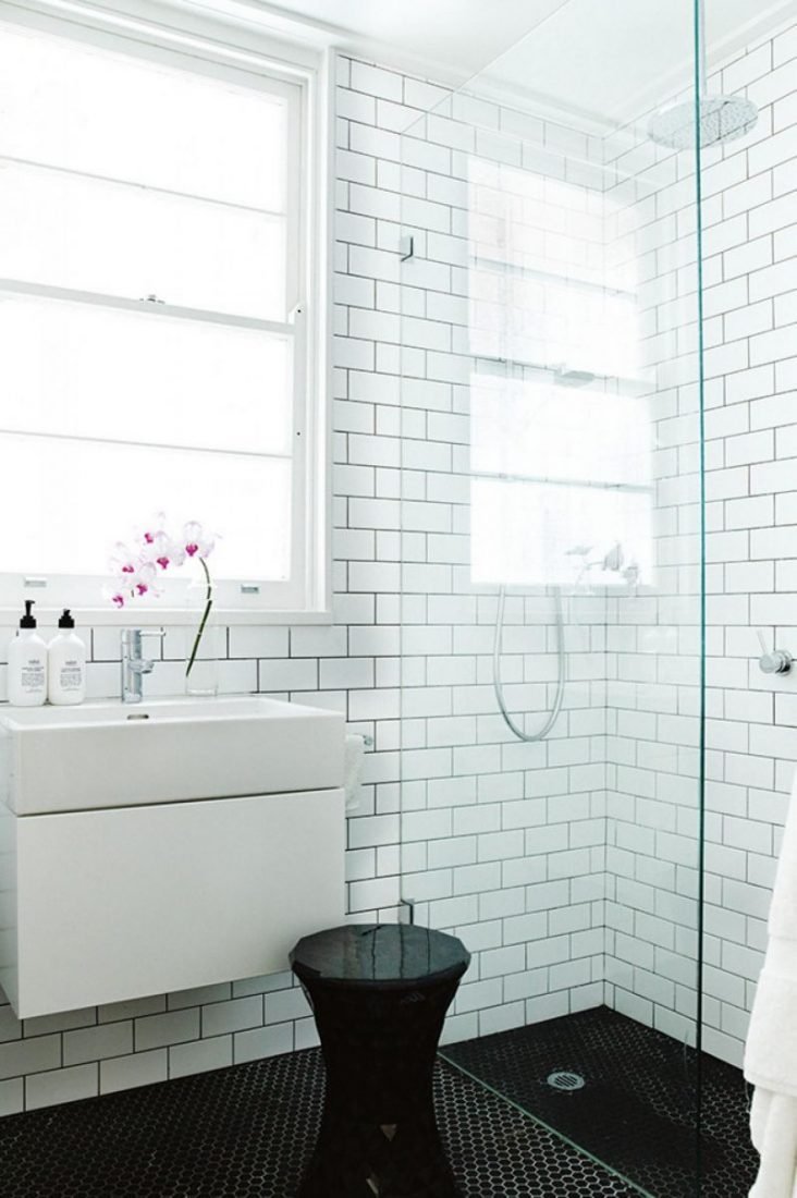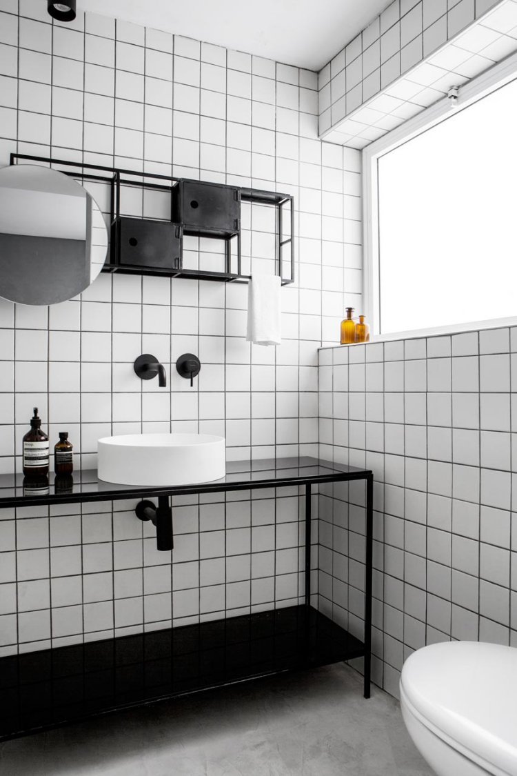 Ванная с белой плиткой и черной затиркой