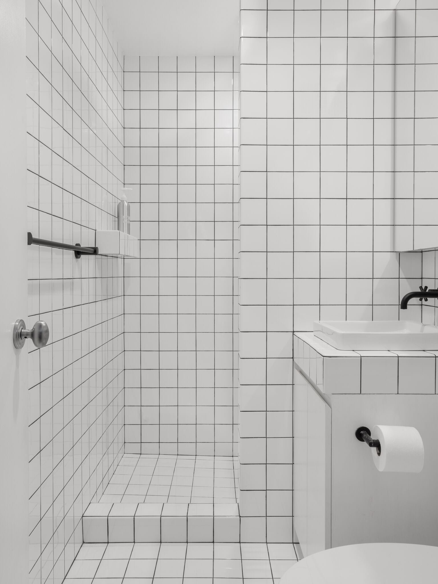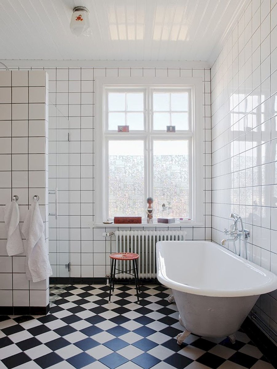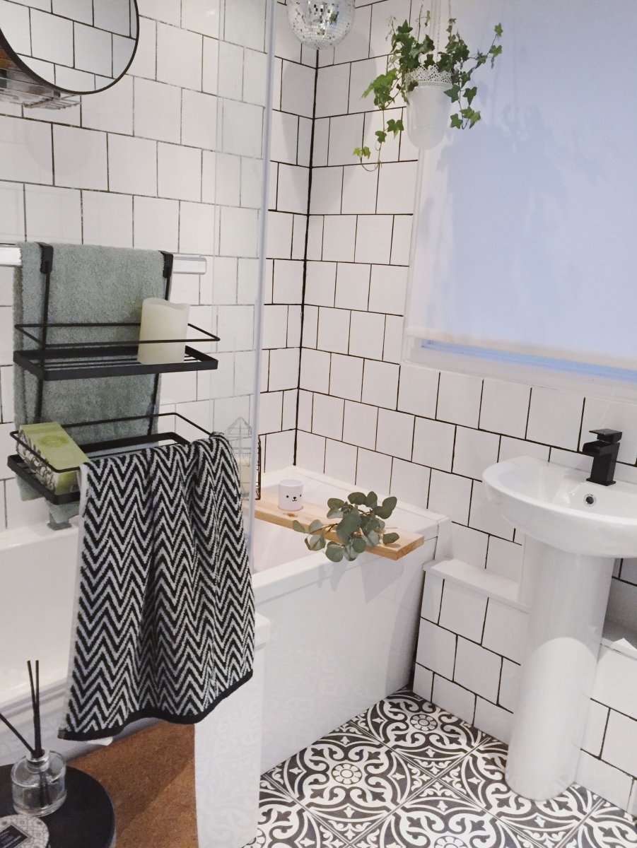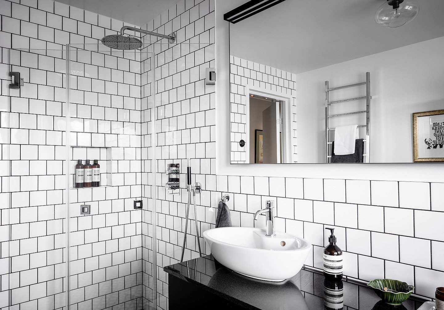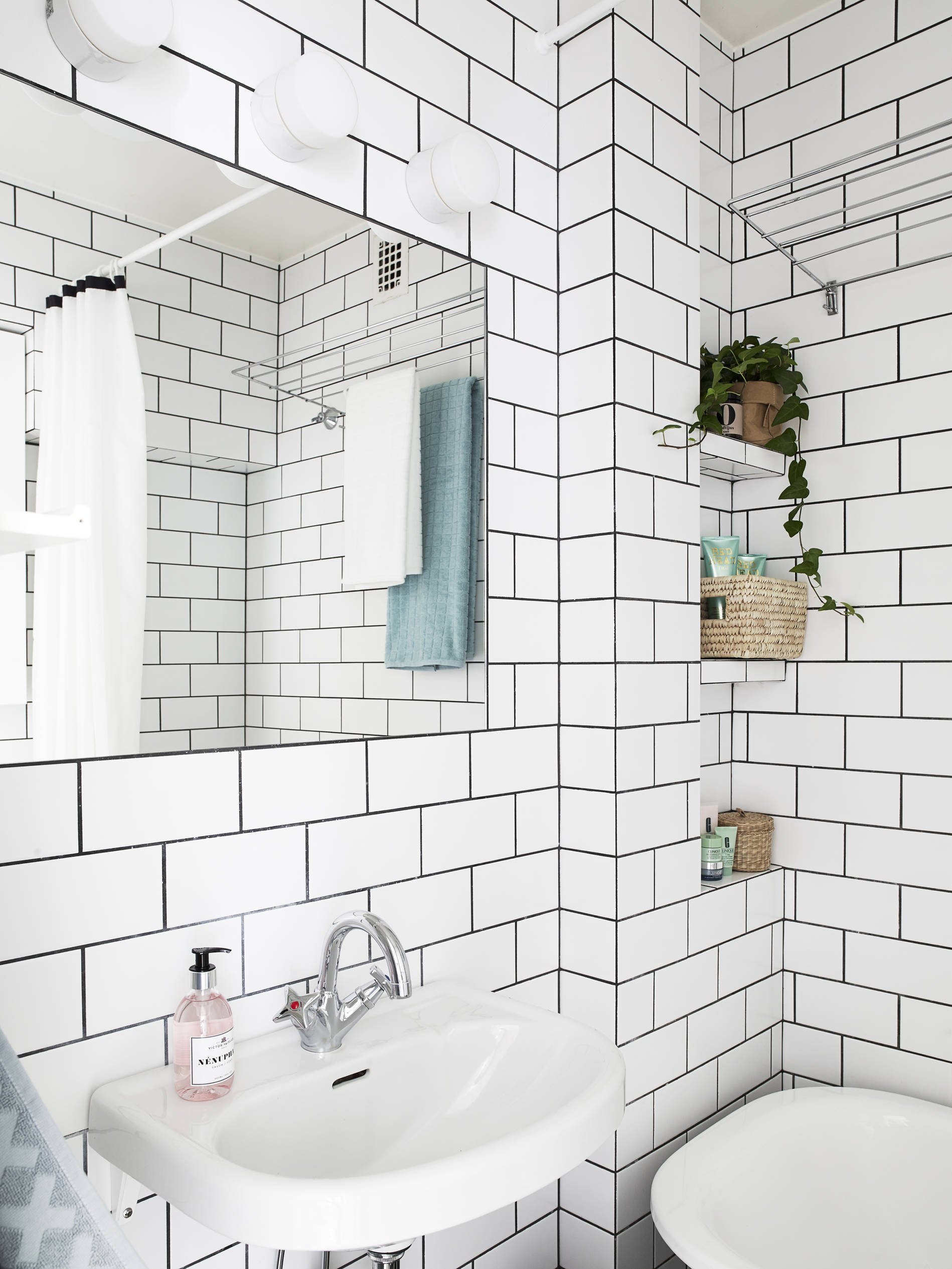 Ванная с белой плиткой и черной затиркой