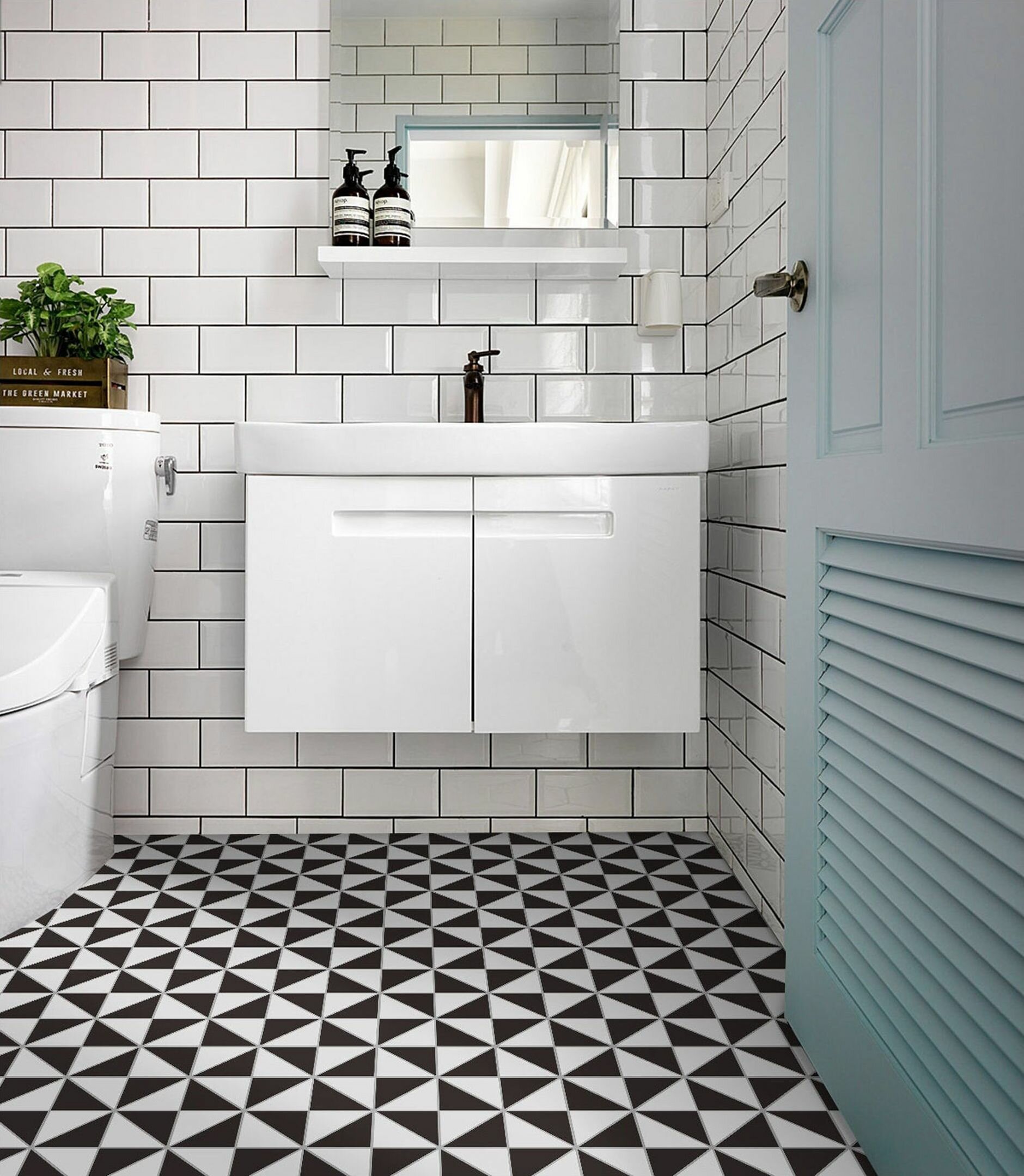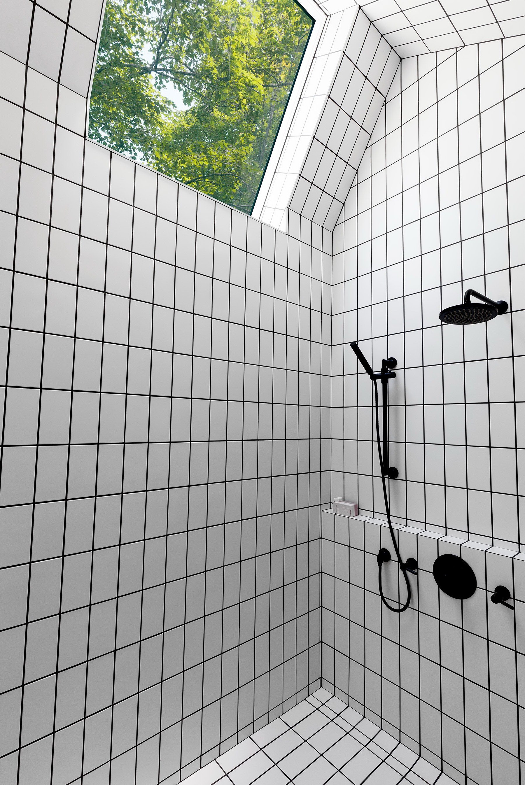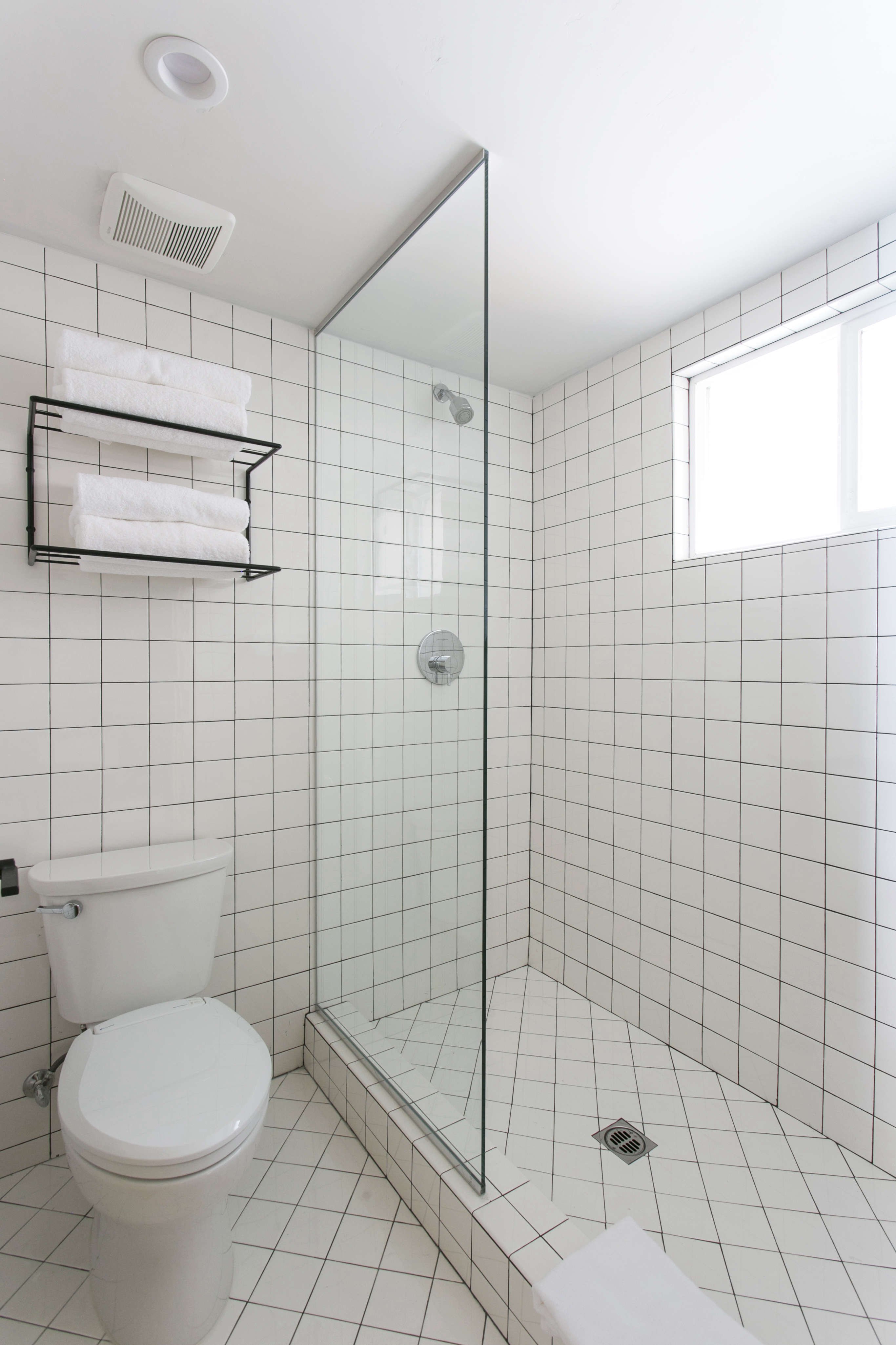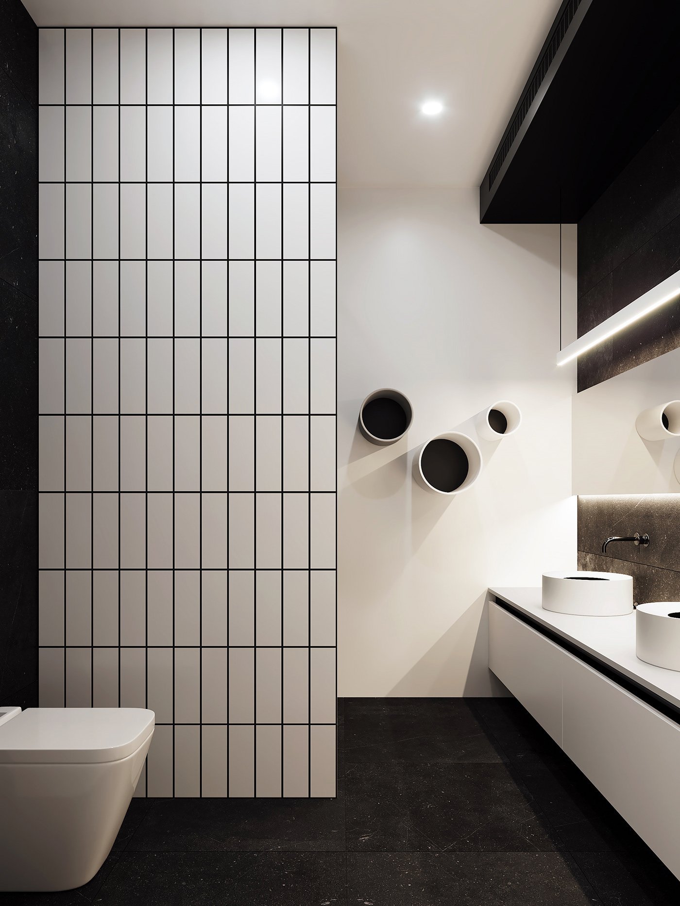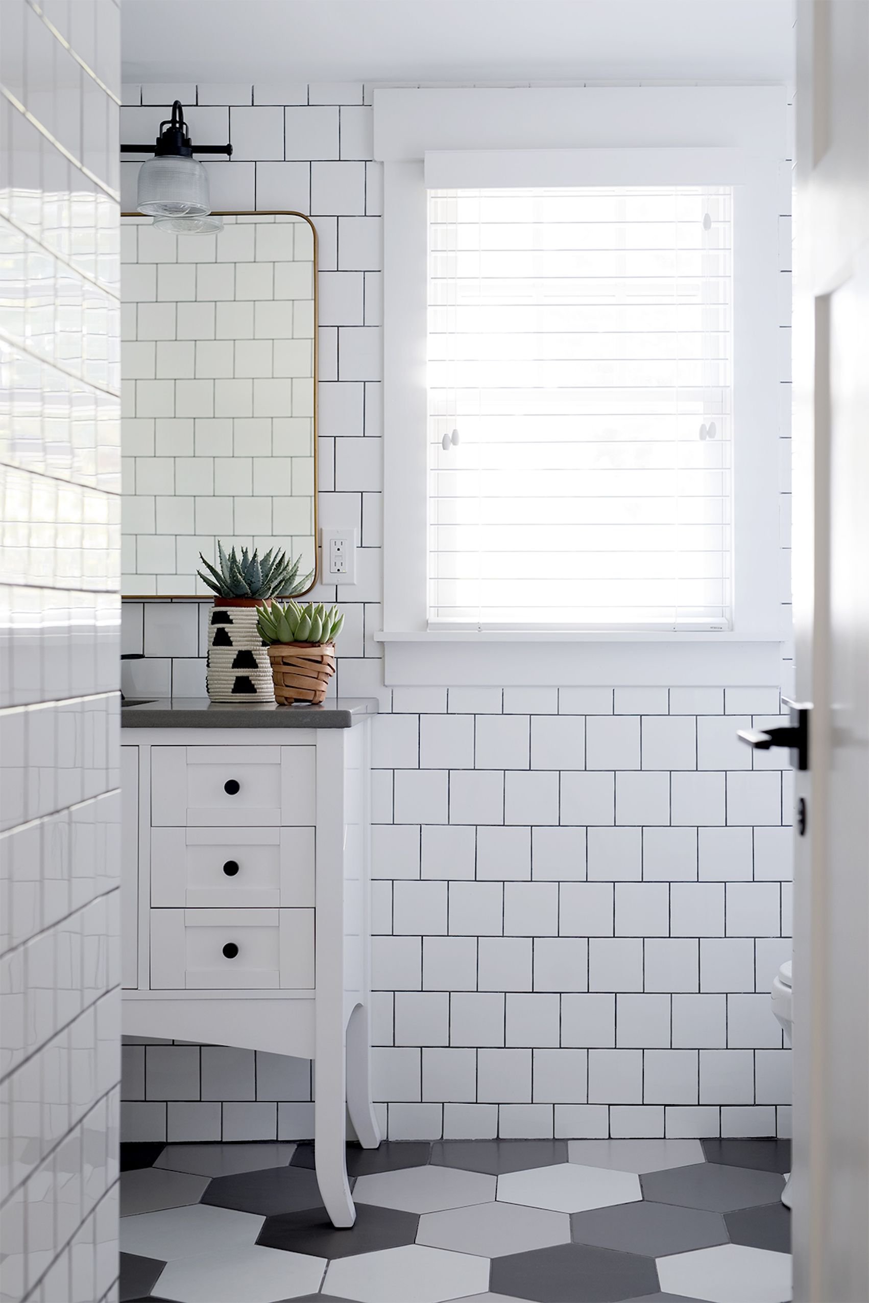 Ванная с белой плиткой и черной затиркой