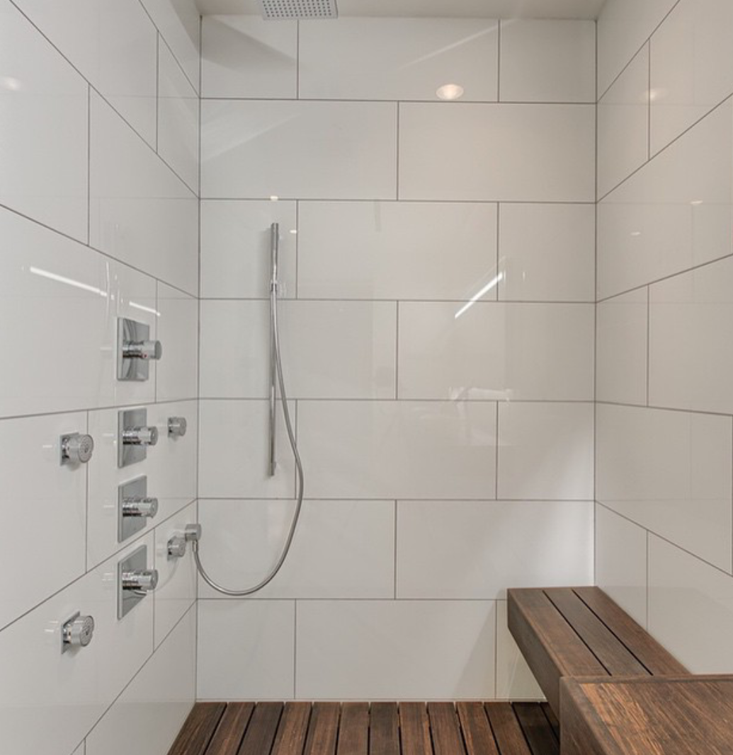 Серая затирка на белой плитке в ванной