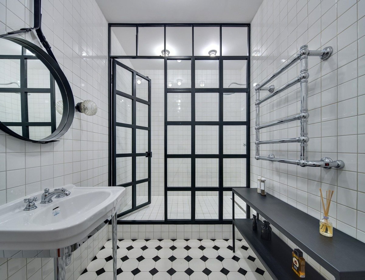 Перегородки в ванную в черно белой плитке
