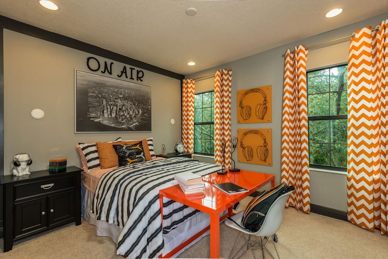 Оранжевые шторы в интерьере спальни