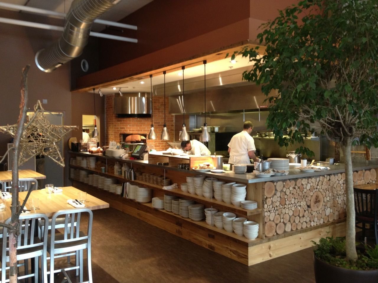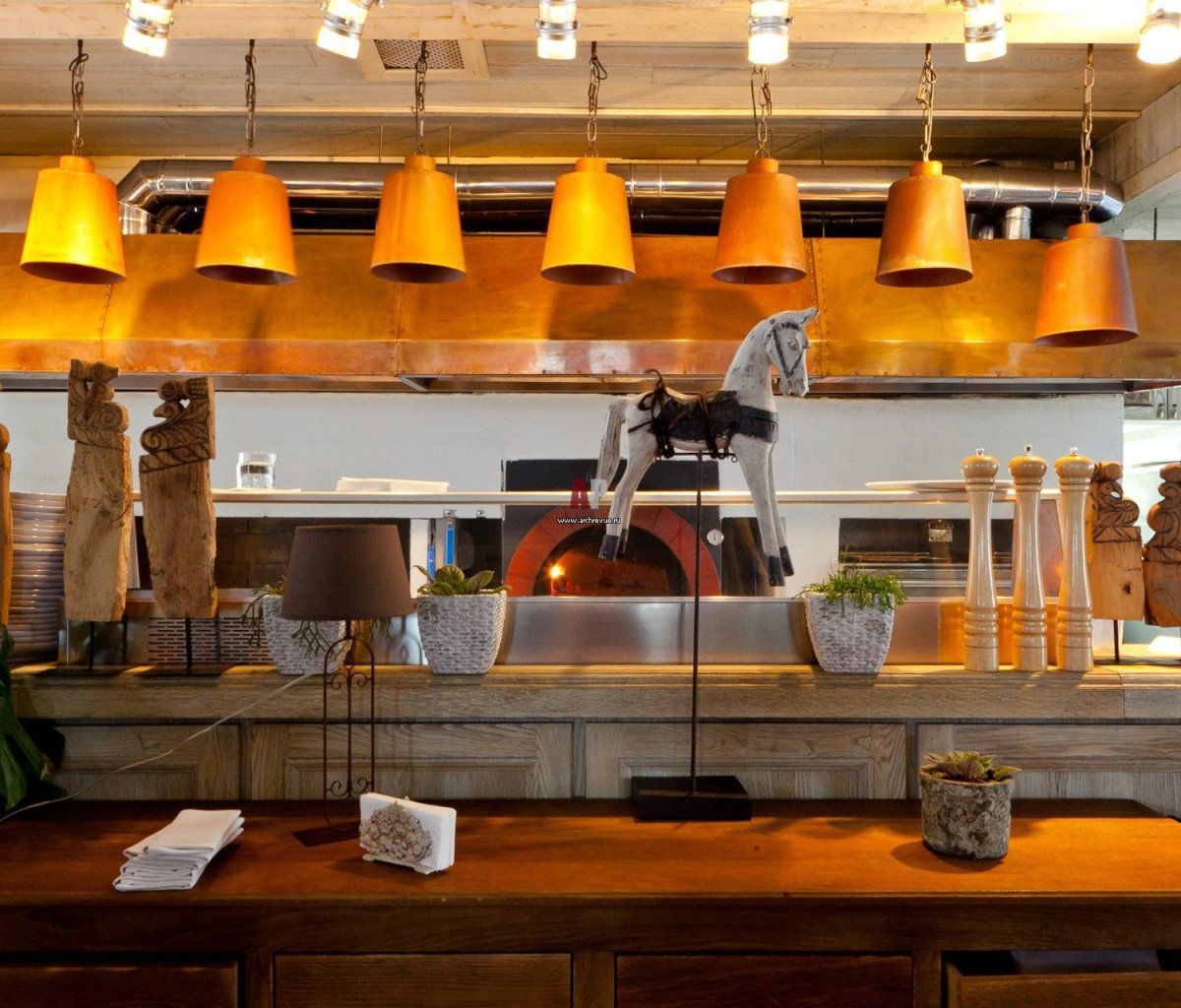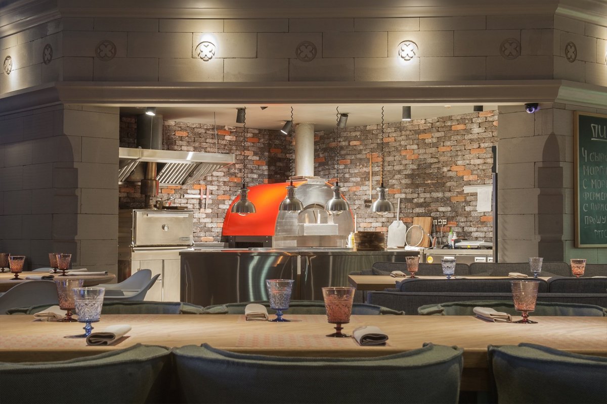 Интерьер пиццерии с открытой кухней