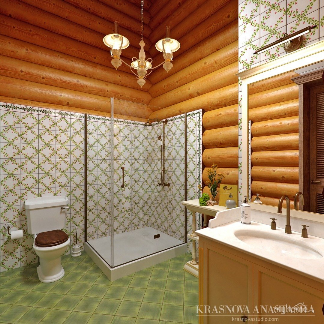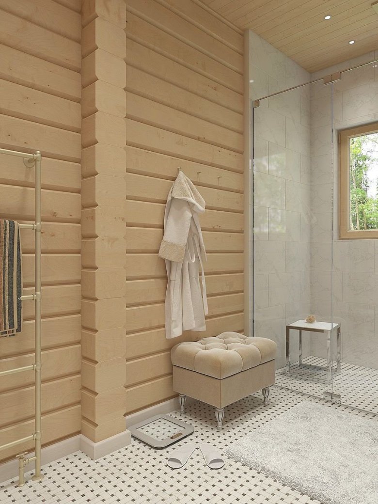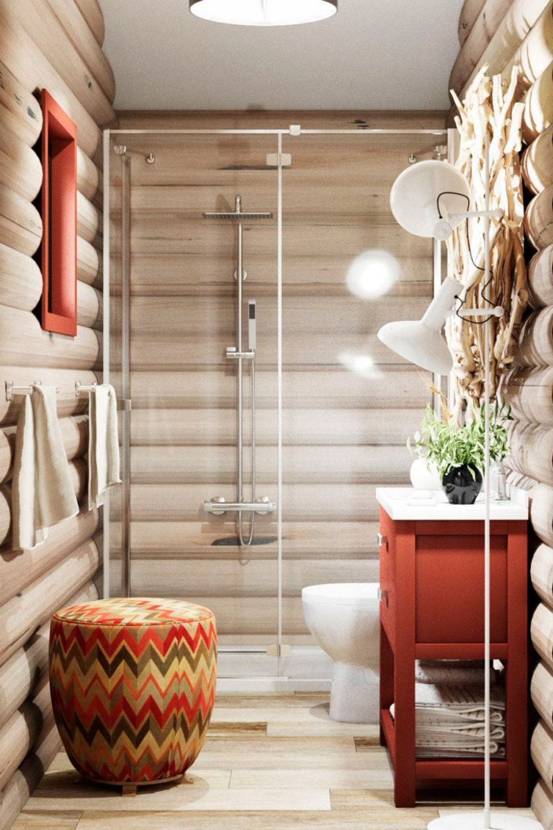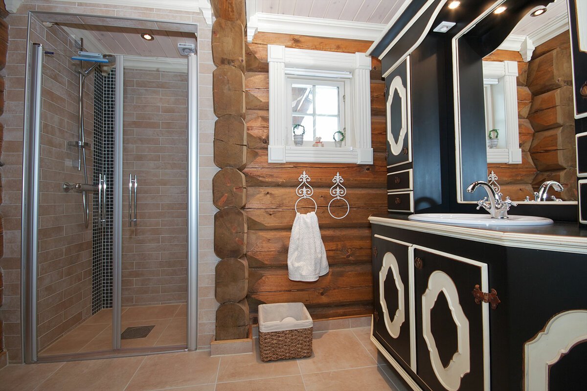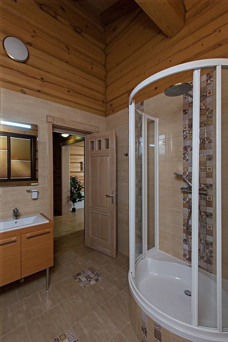 Интерьер ванной комнаты с душевой кабиной в срубовом доме
