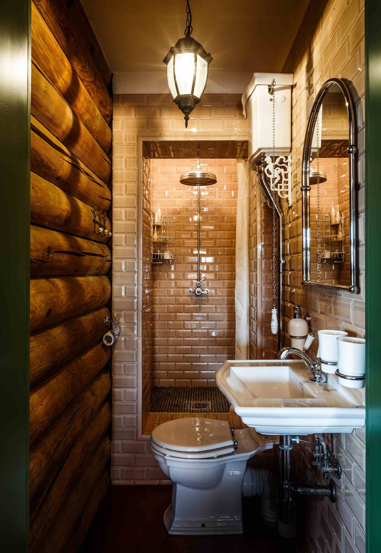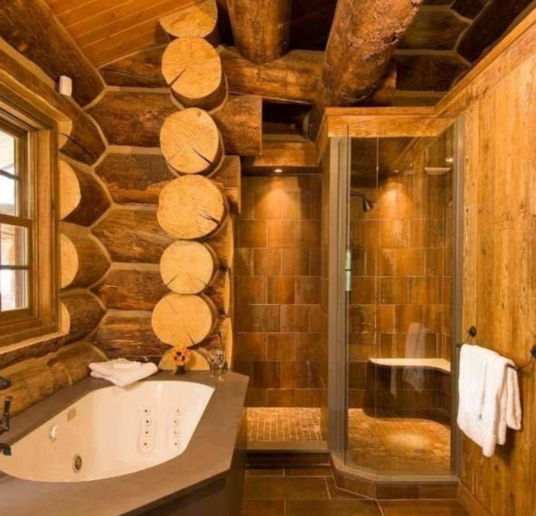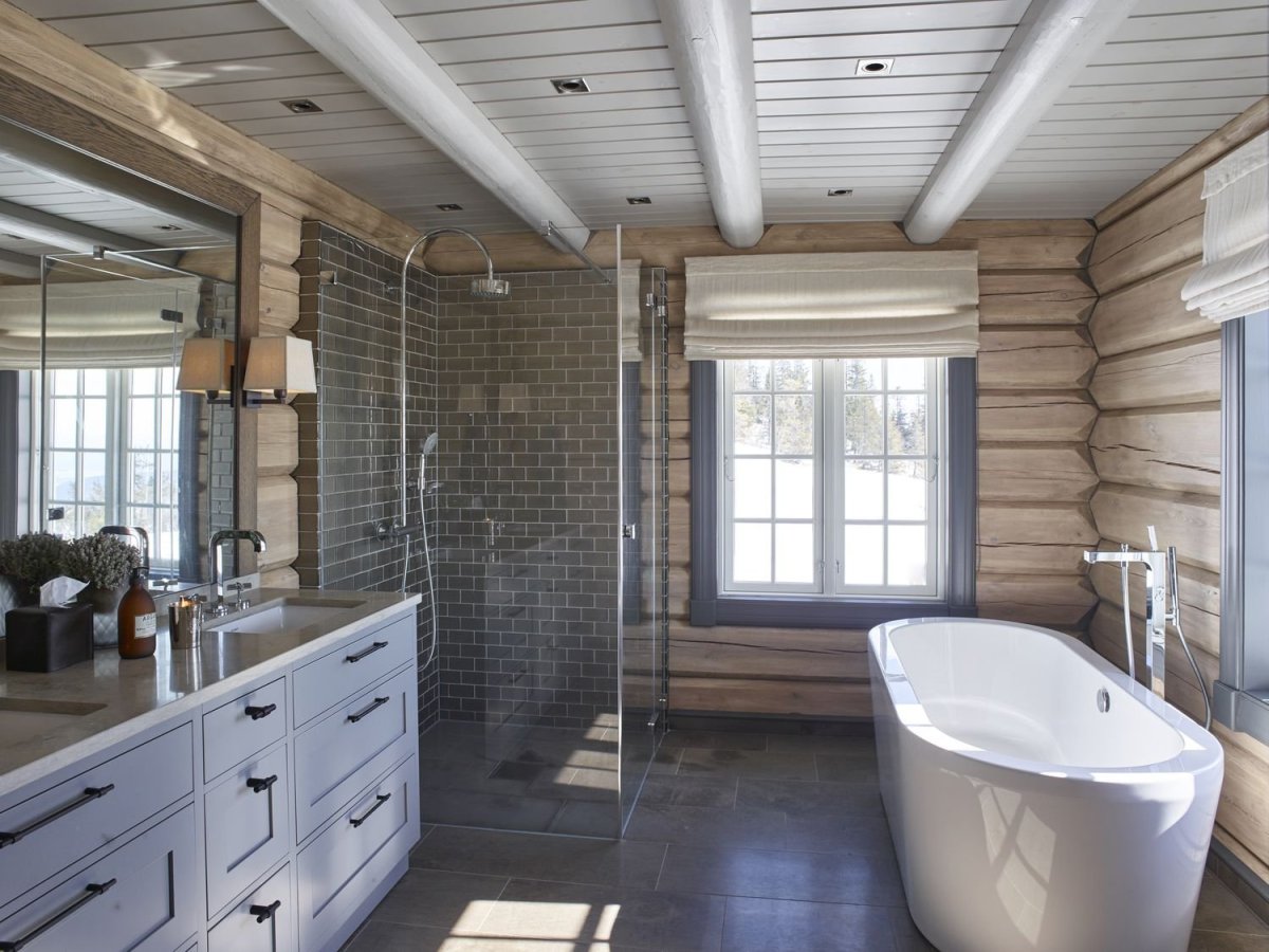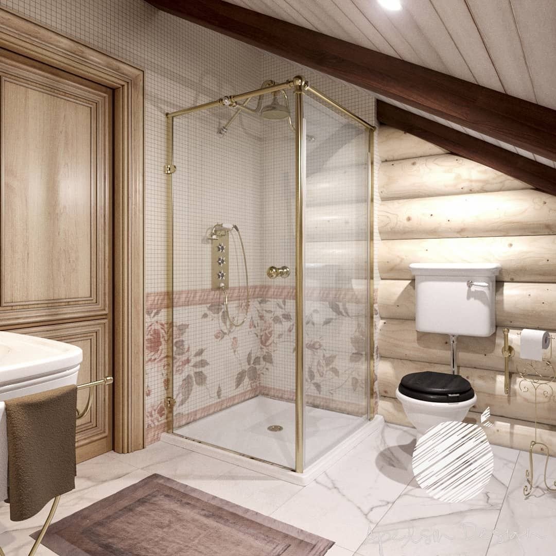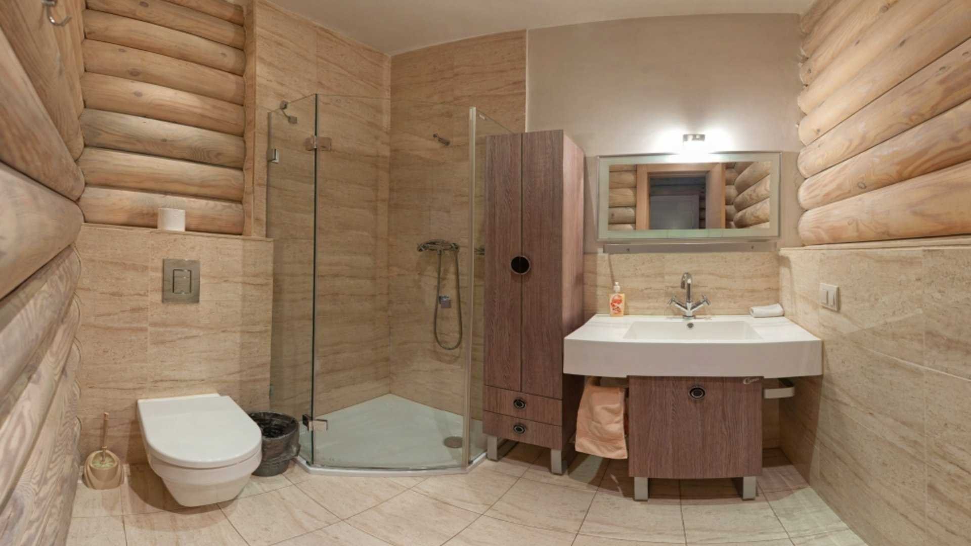 Интерьер ванной комнаты с душевой кабиной в срубовом доме