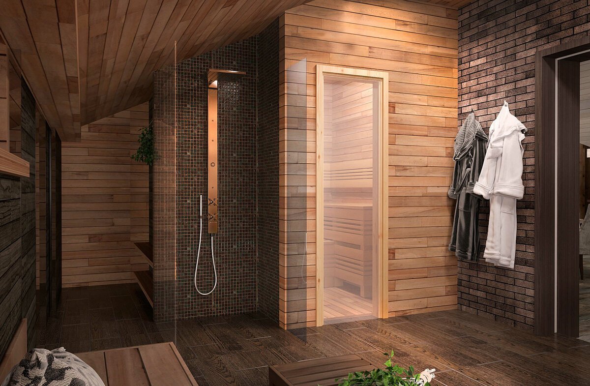 Помывочная в деревянной бане с душем интерьер
