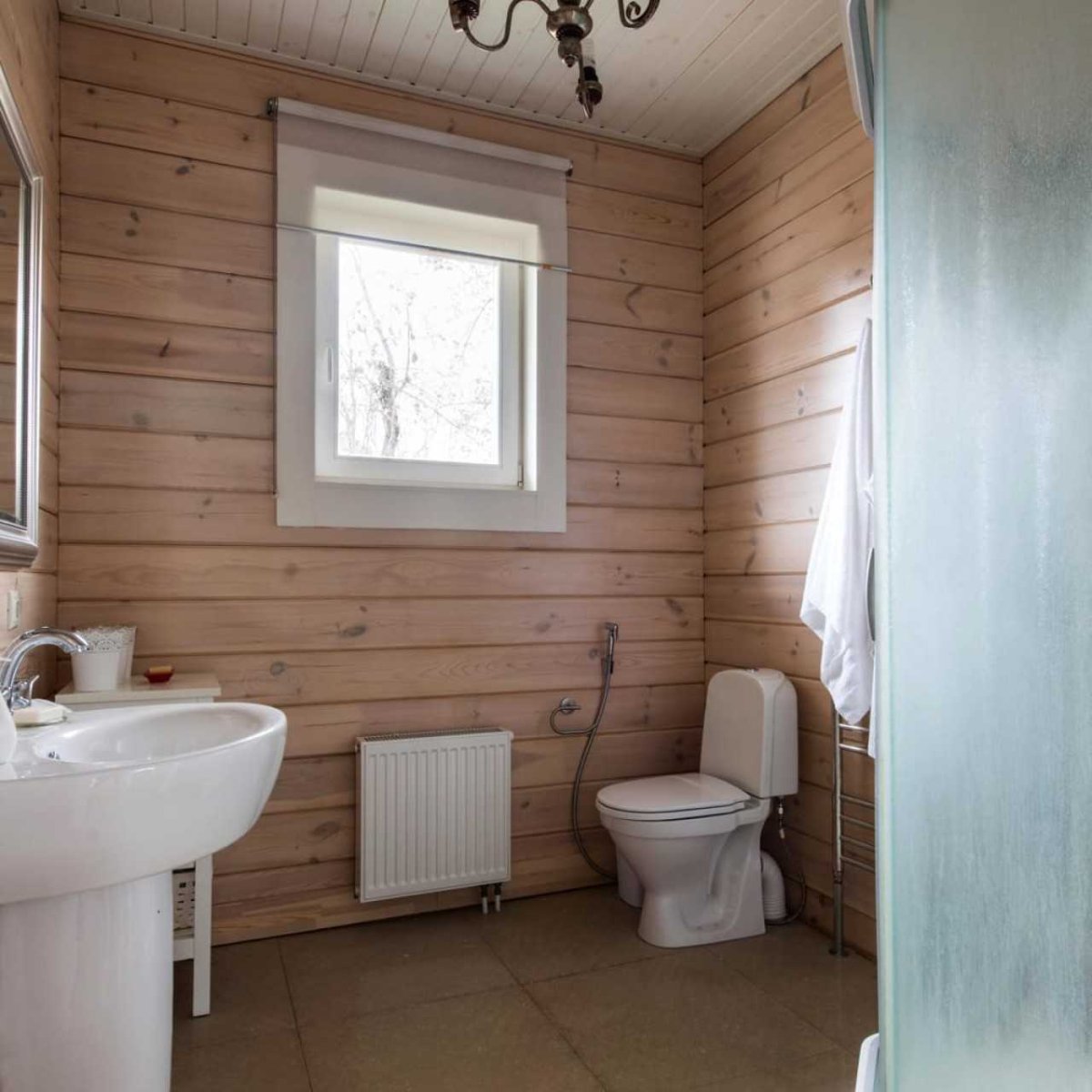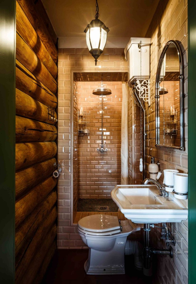 Ванная комната в деревянном доме с душевой