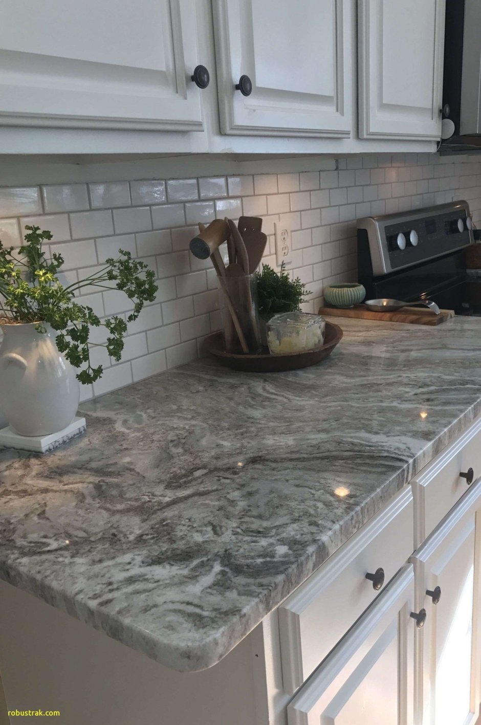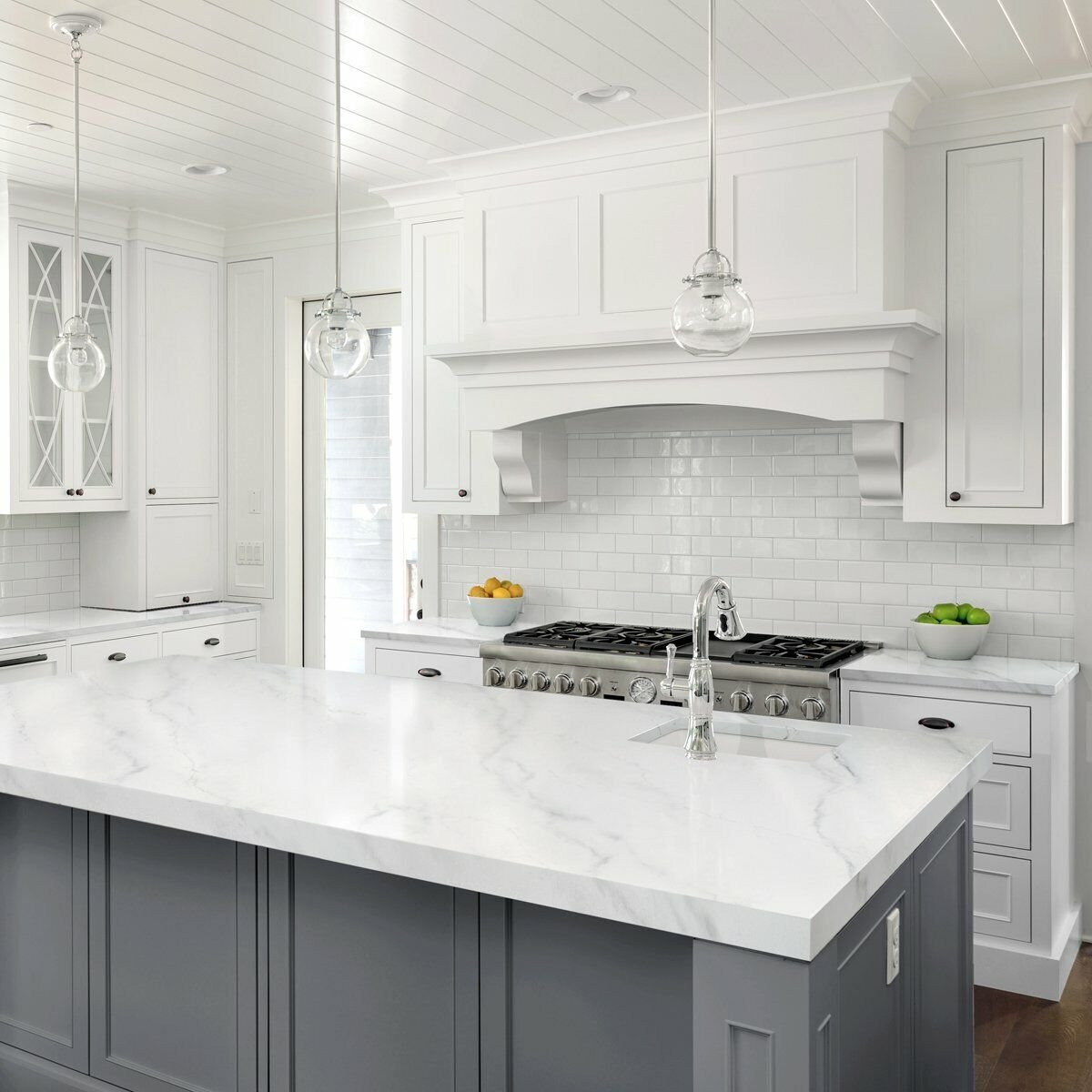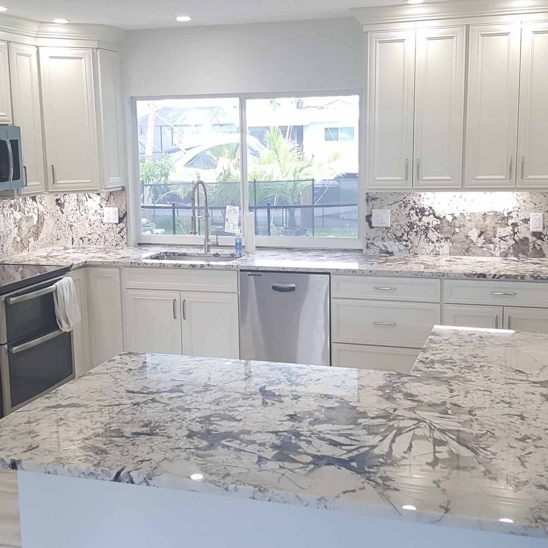 Белая кухня с мраморной столешницей