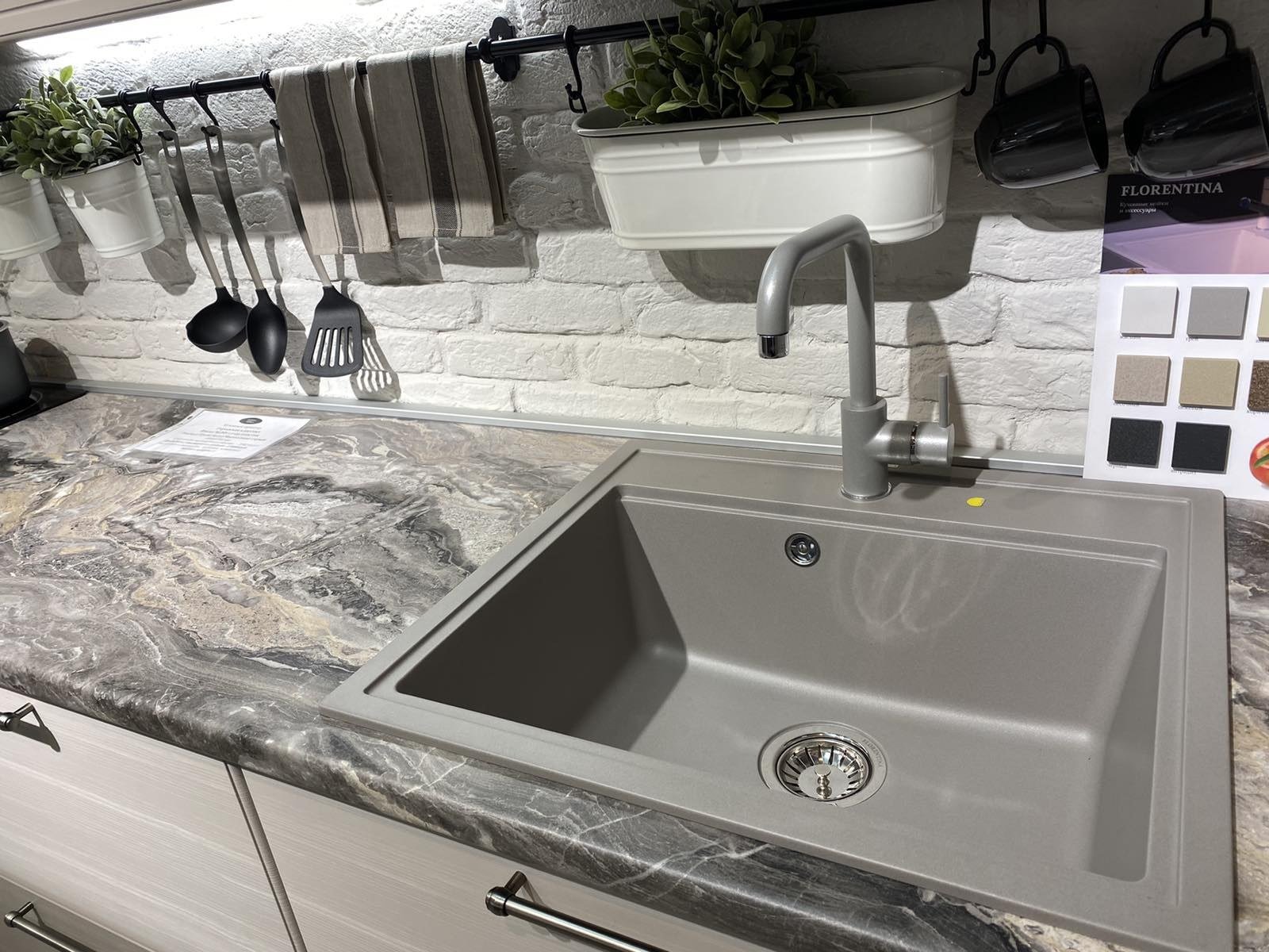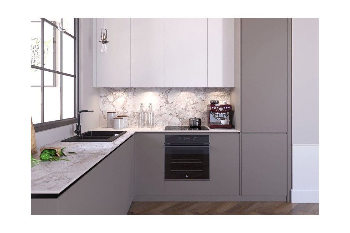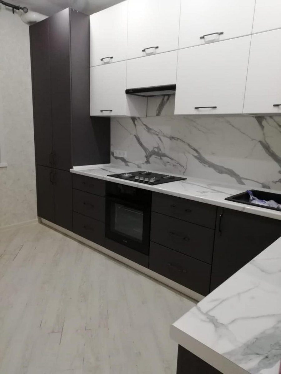 Серая кухня с белой столешницей