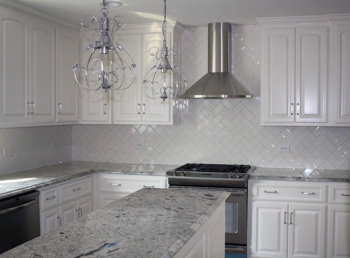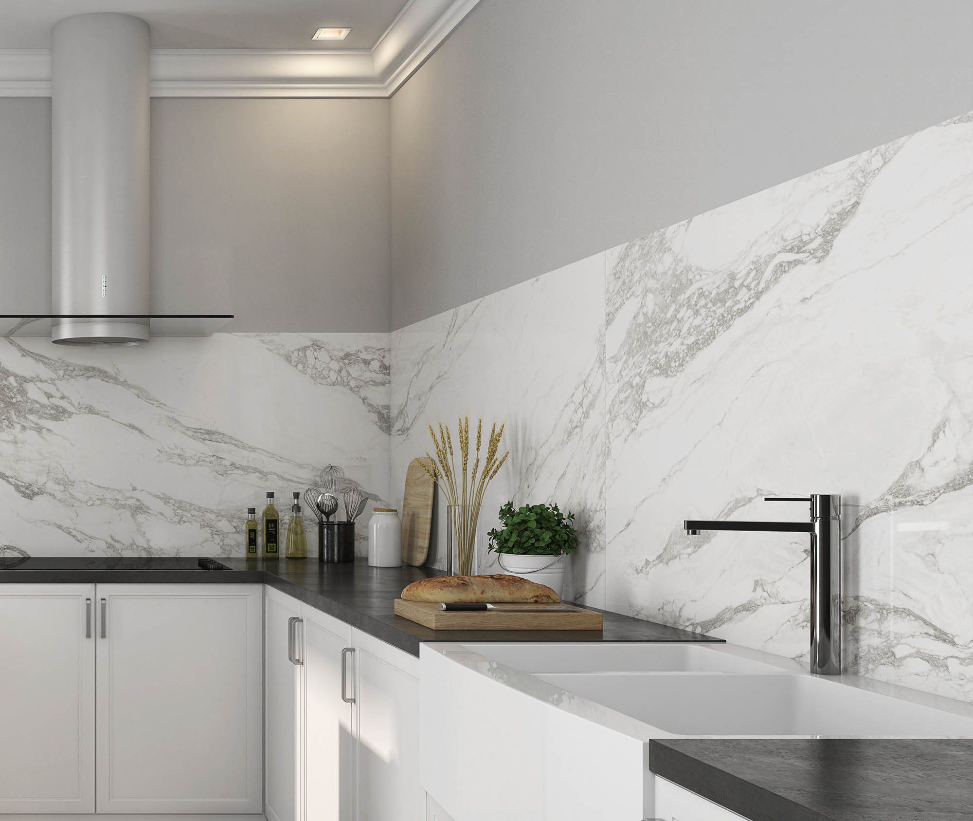 Белая кухня с мраморным фартуком