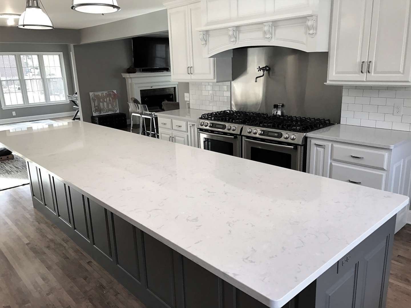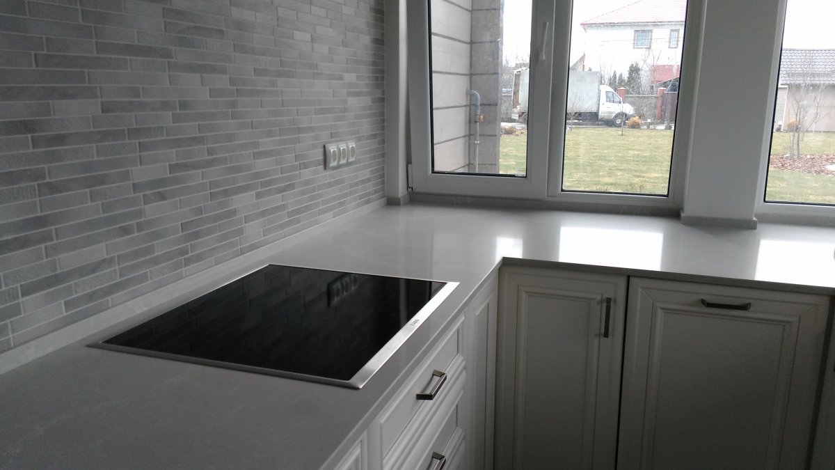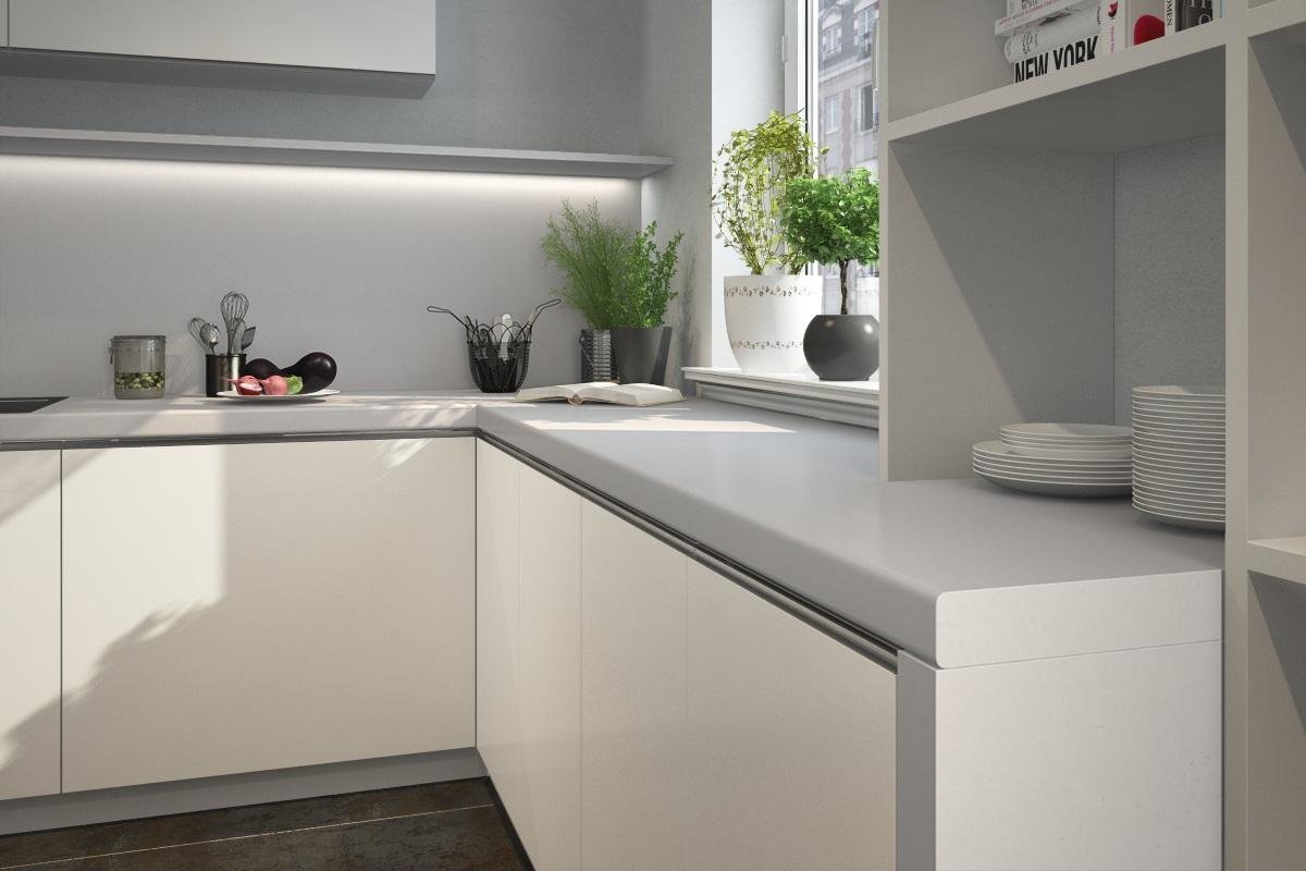 Белая кухня с серой столешницей