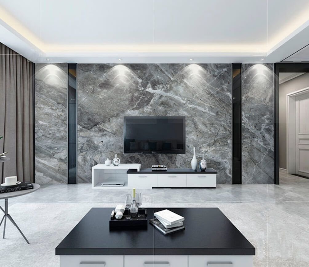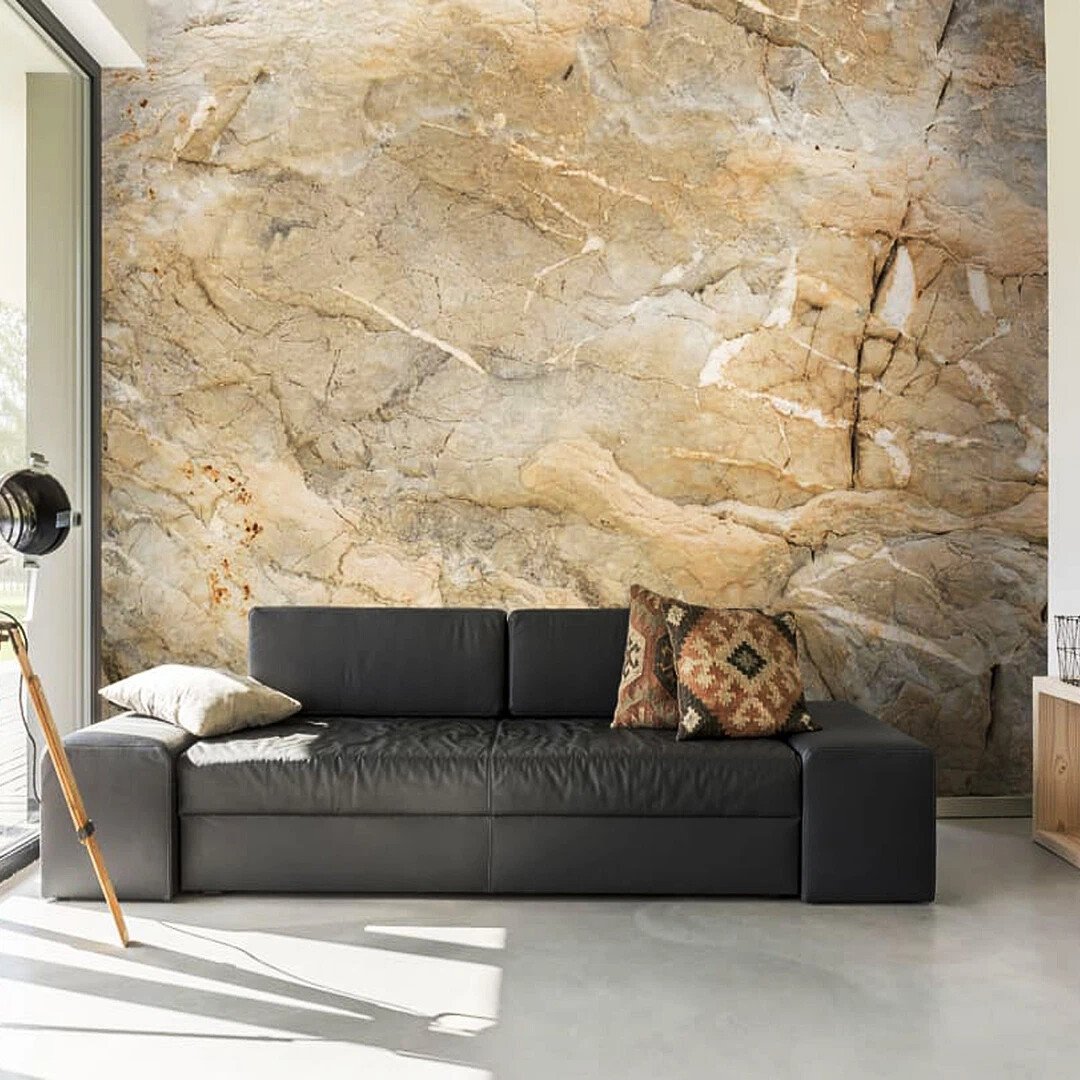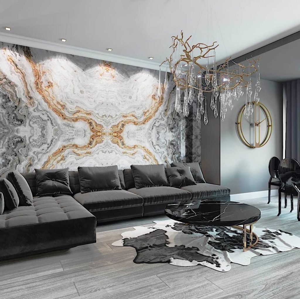 Обои под мрамор в интерьере гостиной