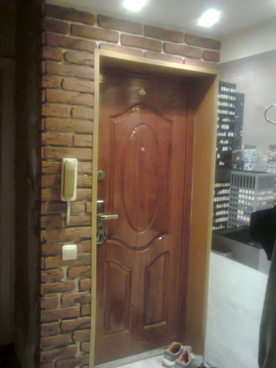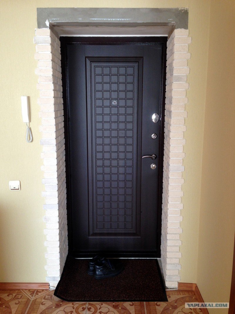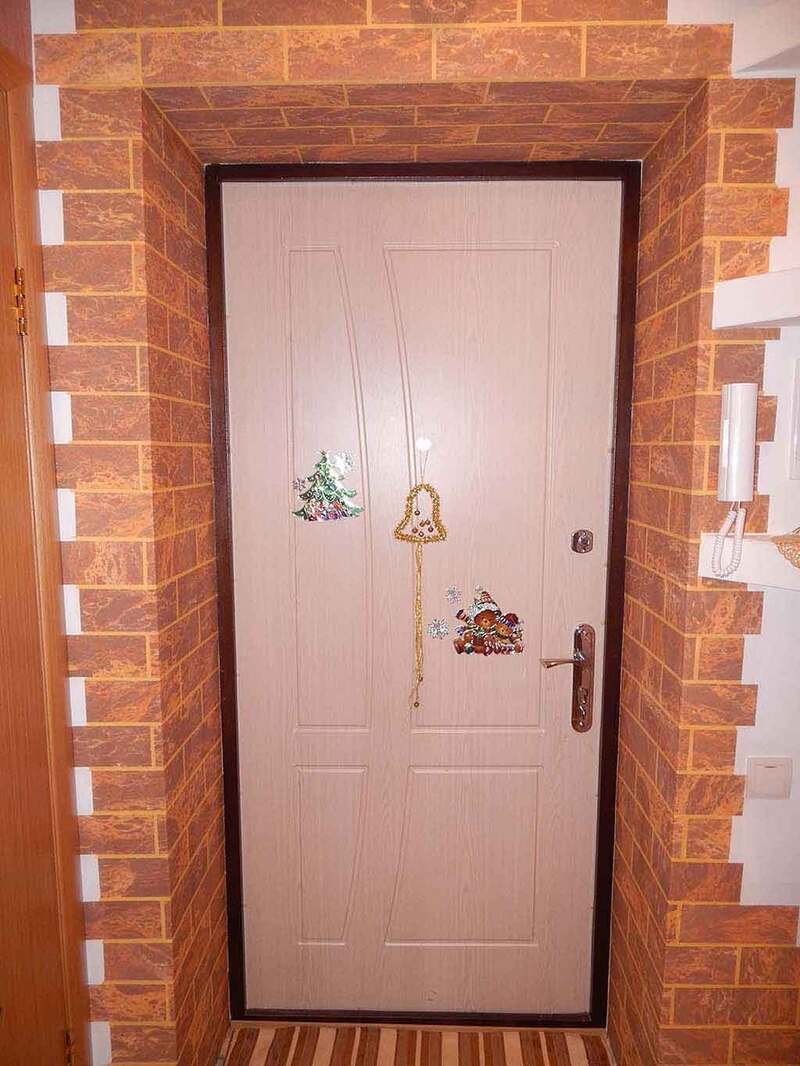 Входная дверь обшитая кирпичом декоративным