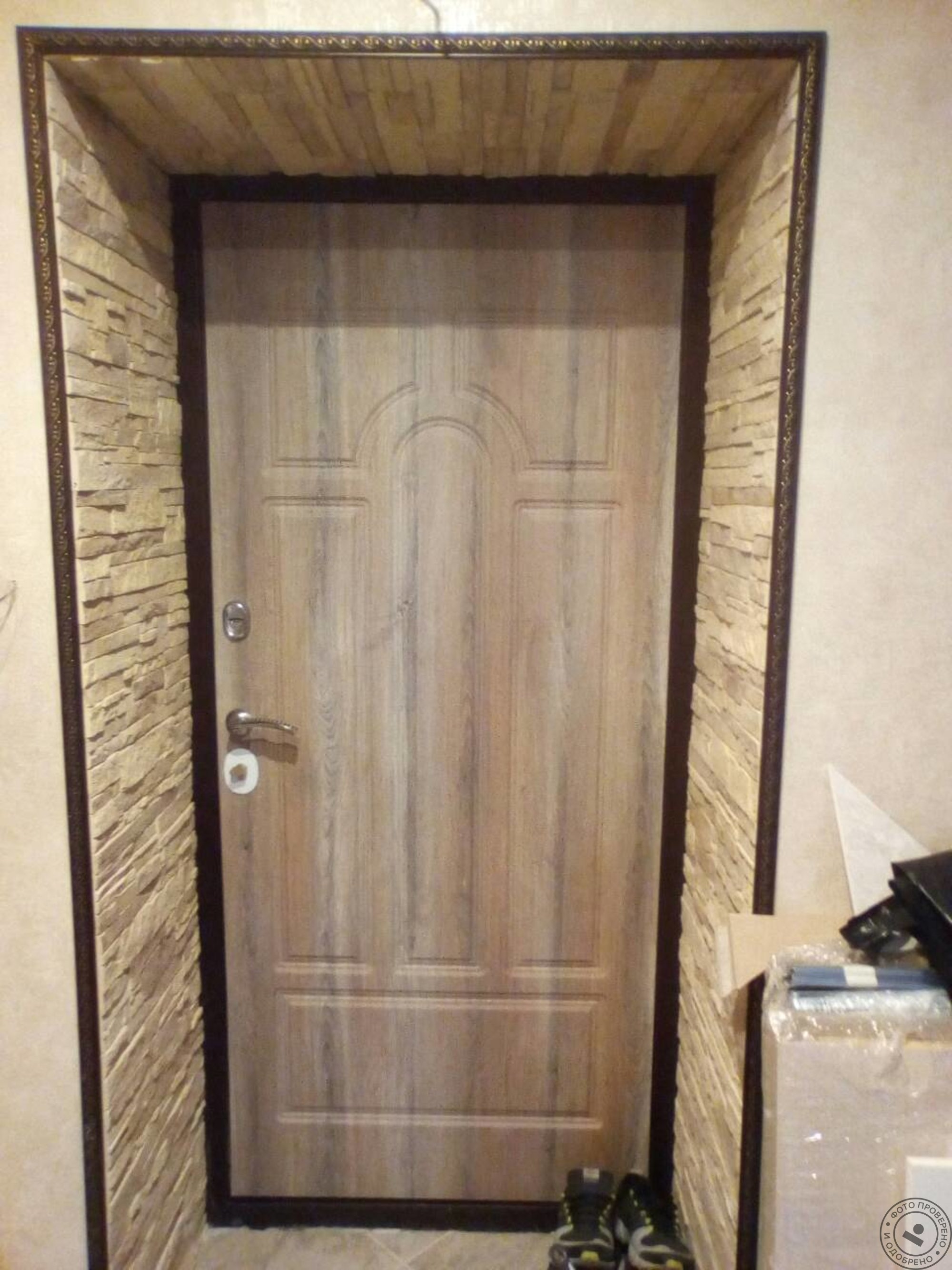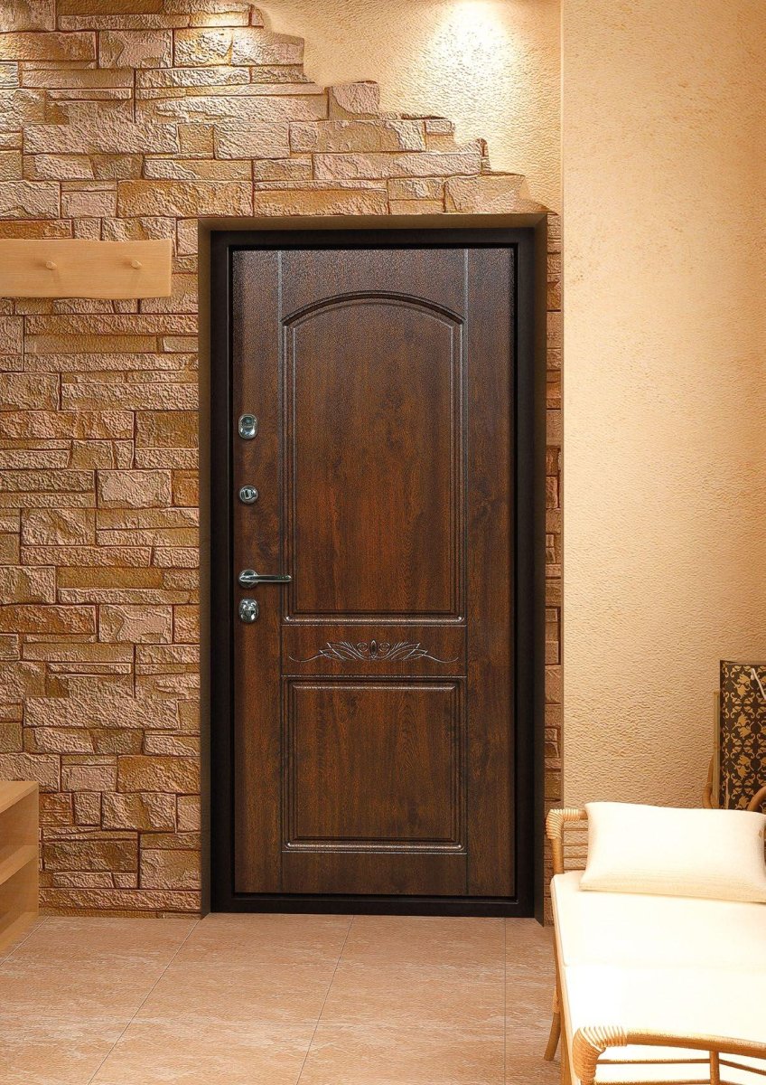 Входная дверь отделанная декоративным камнем