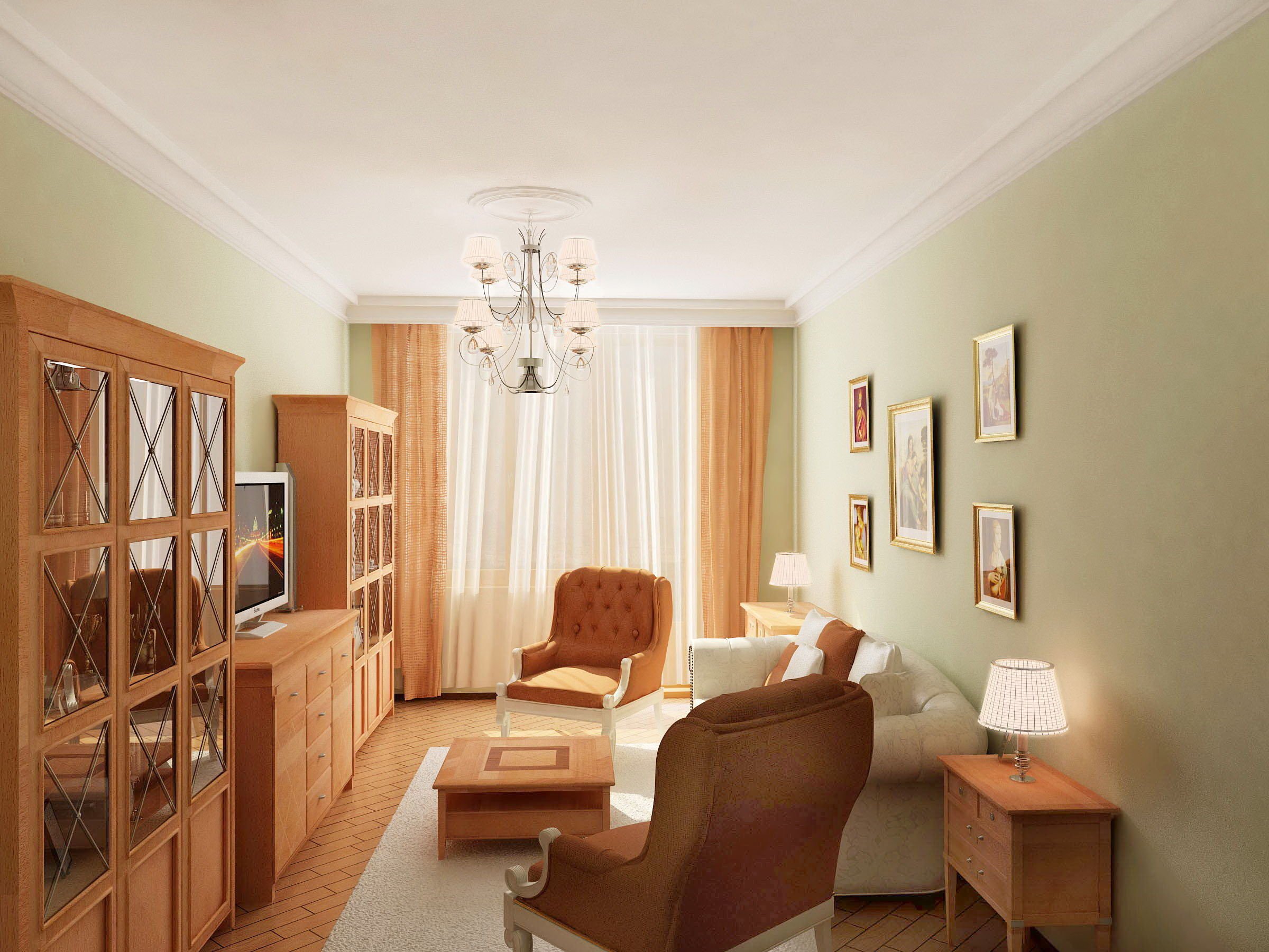 Интерьер узкой гостиной