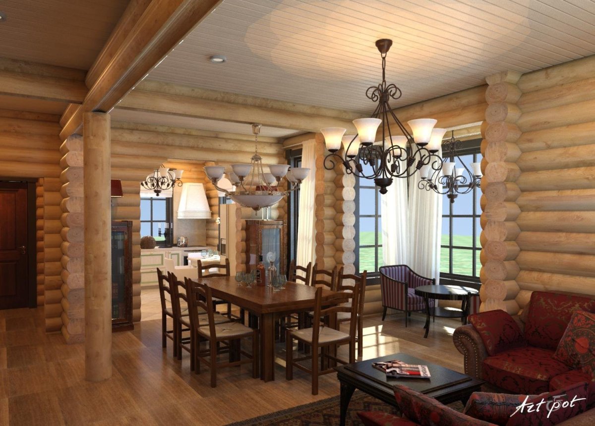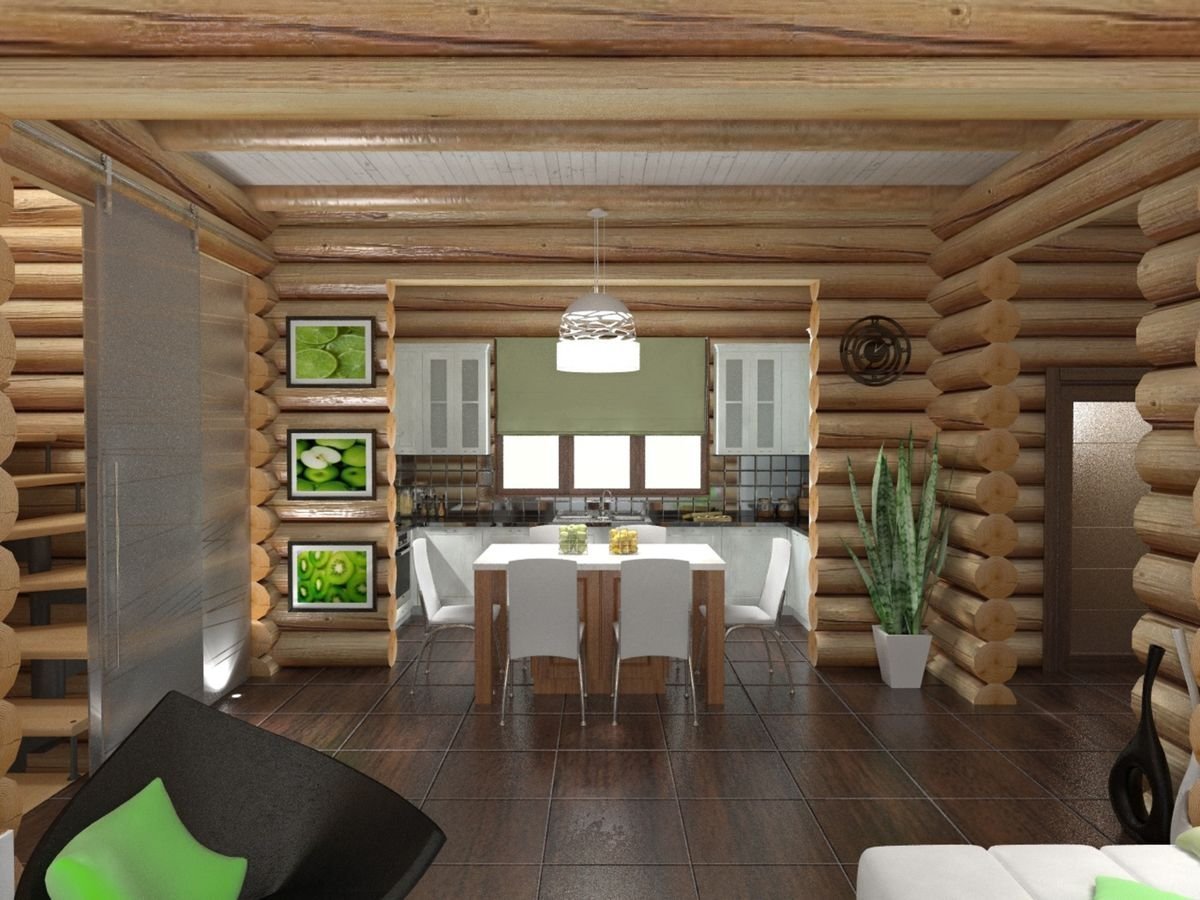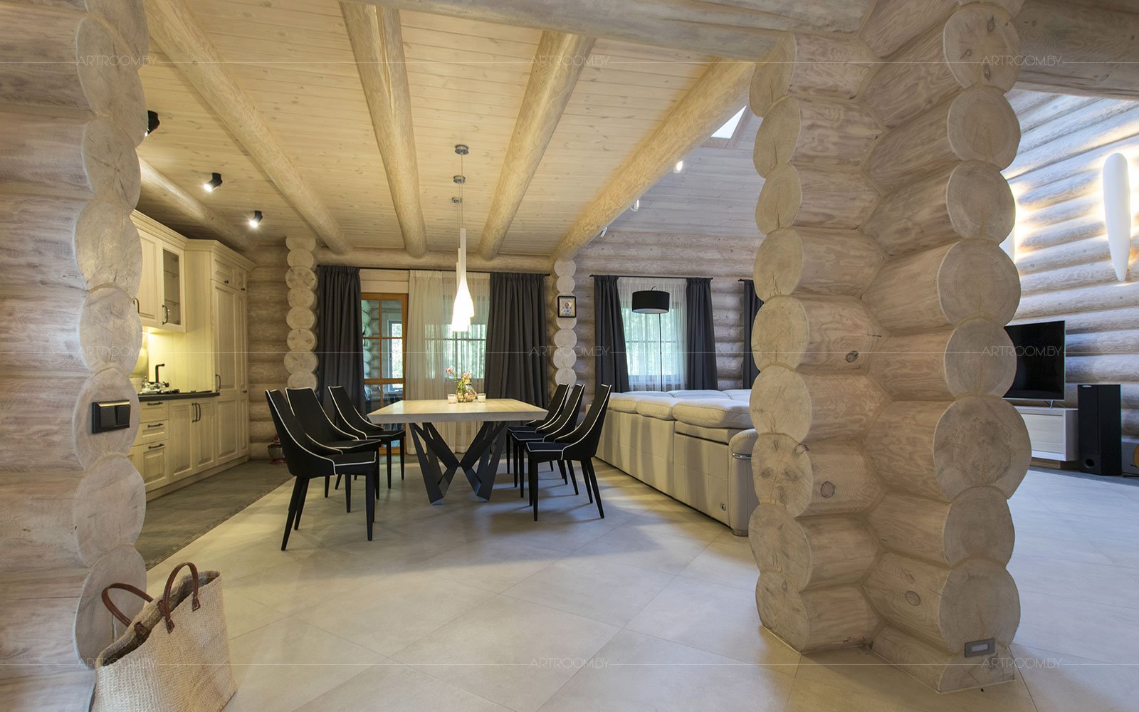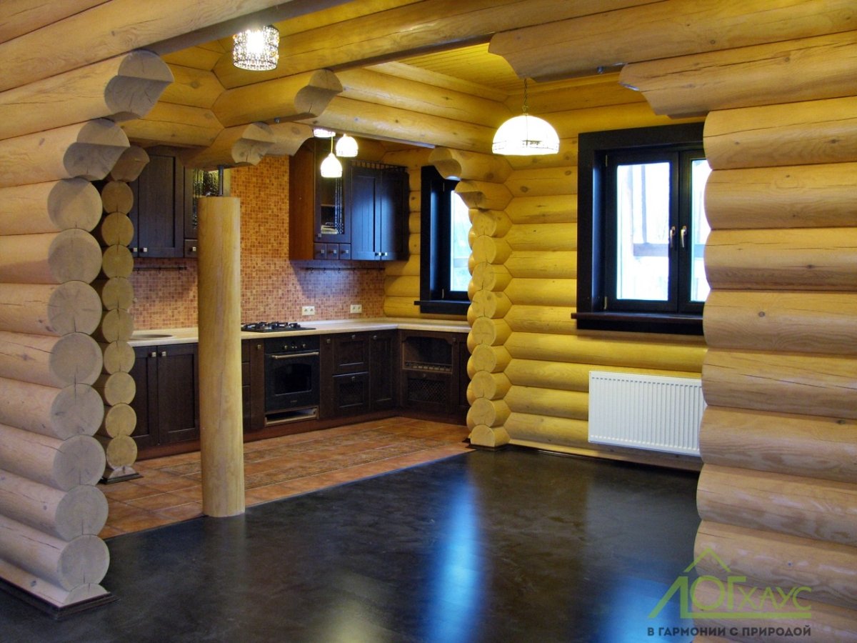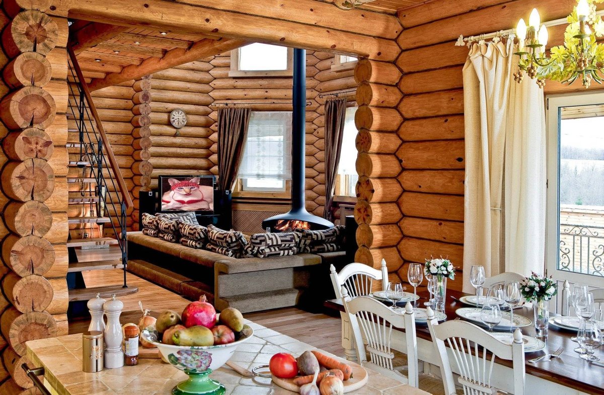 Дом из оцилиндрованного бревна интерьер кухня гостиная