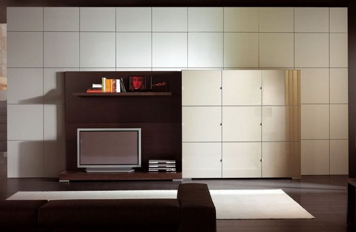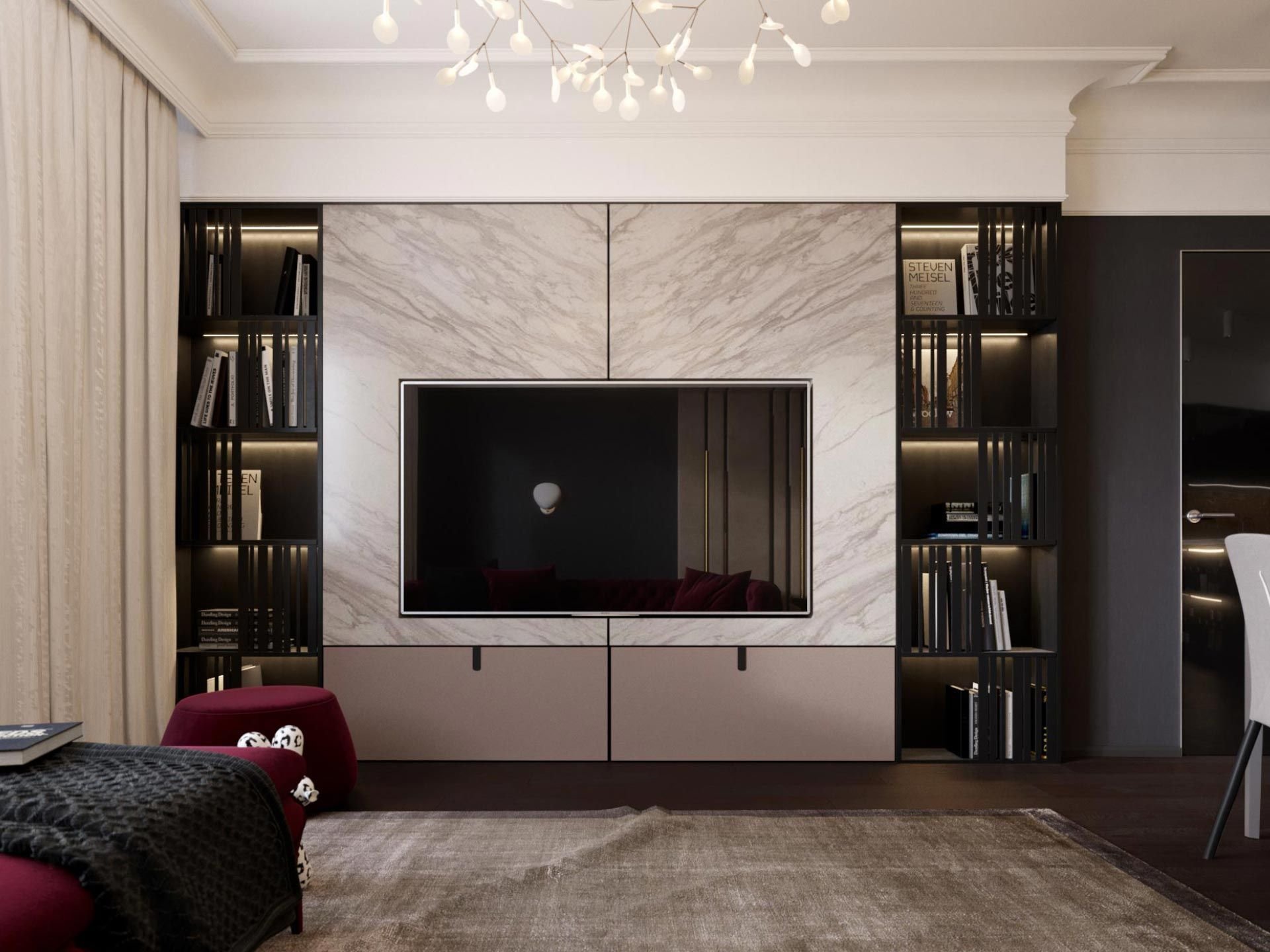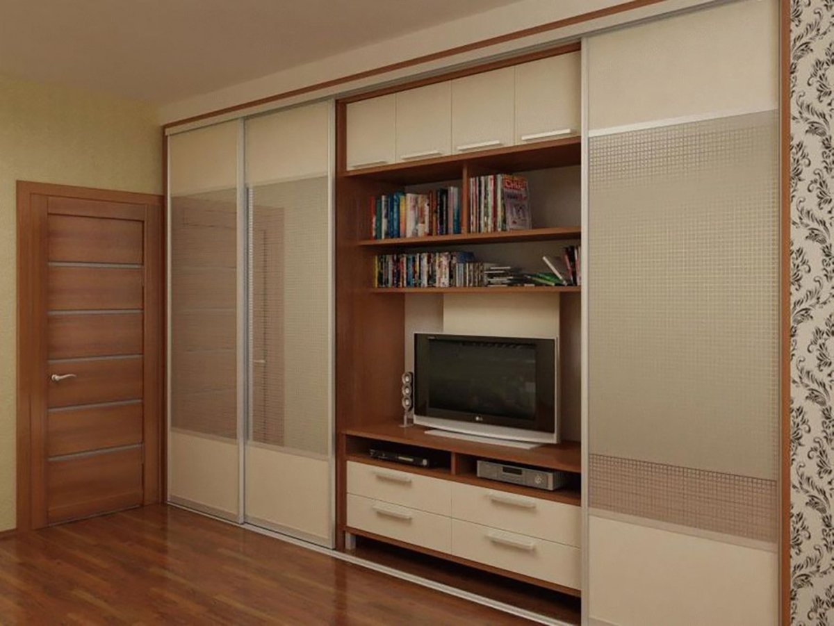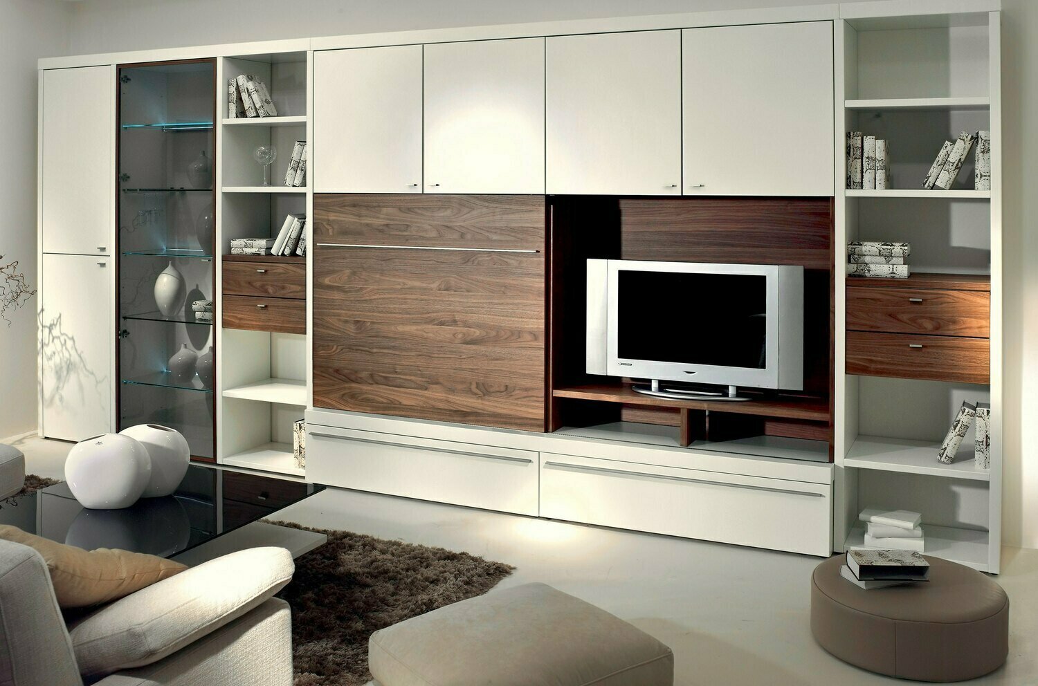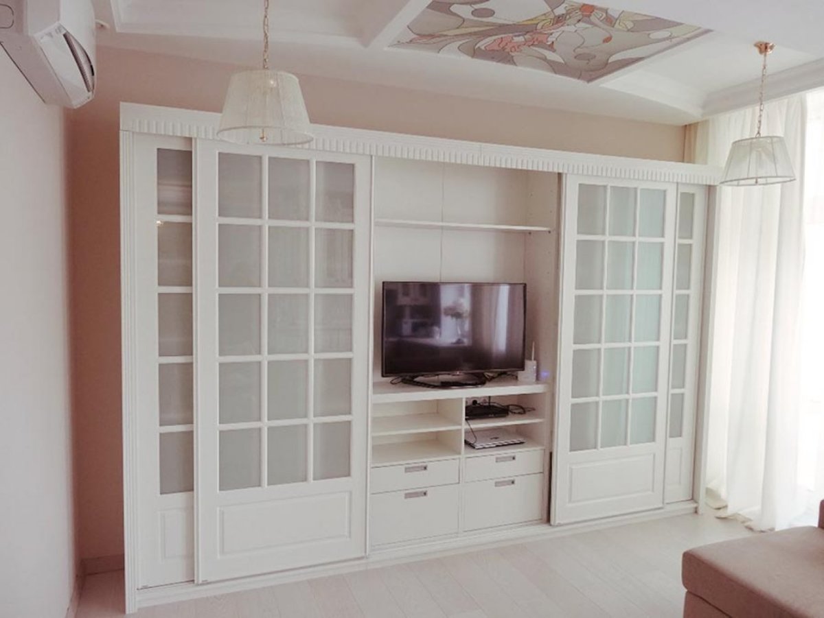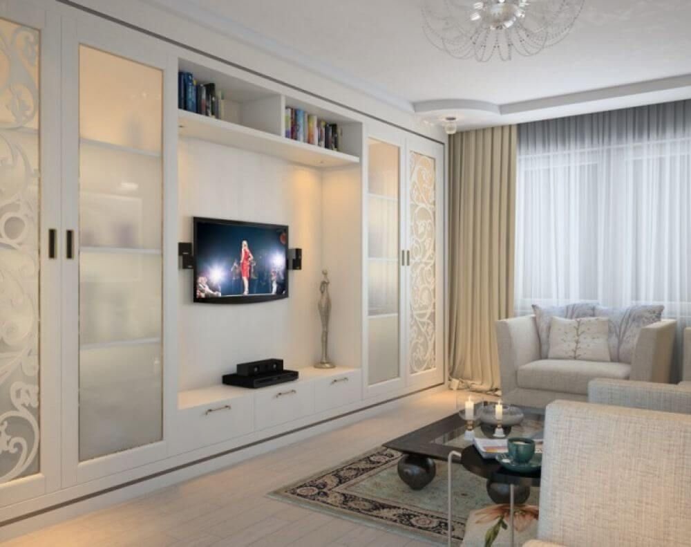 Шкаф с тумбой под телевизор в интерьере гостиной