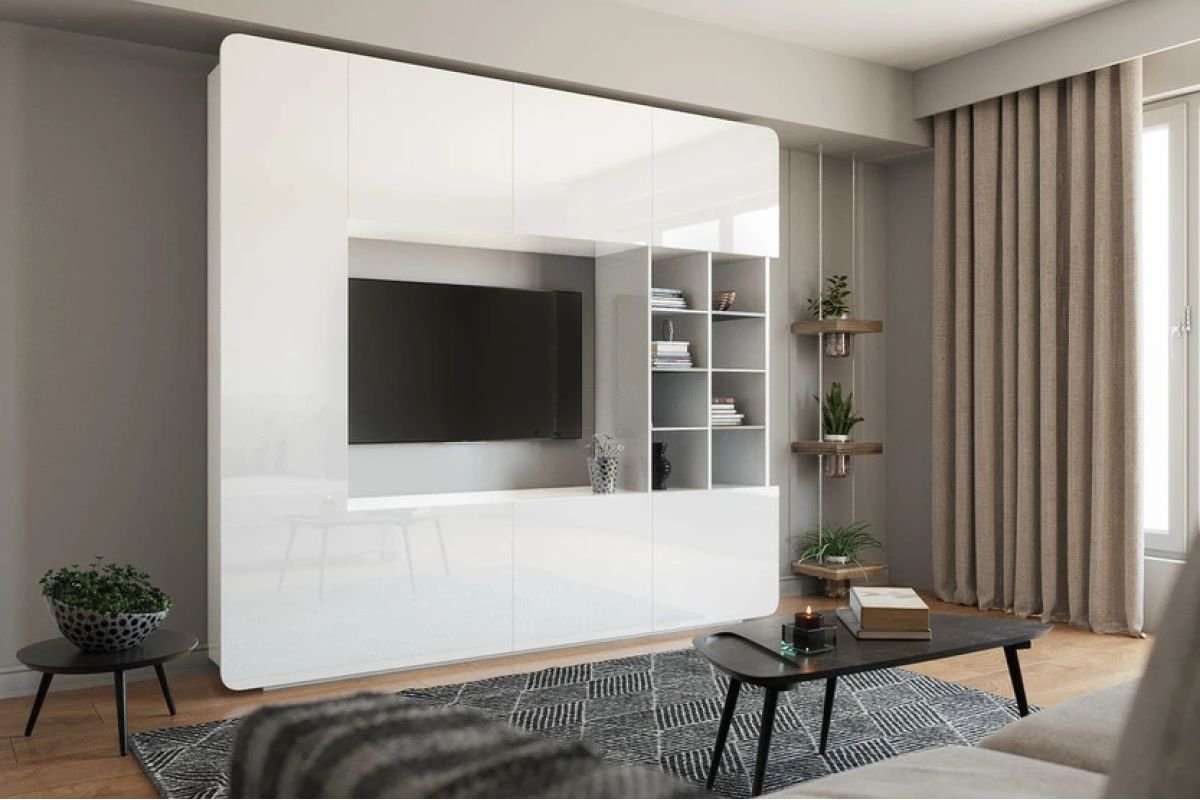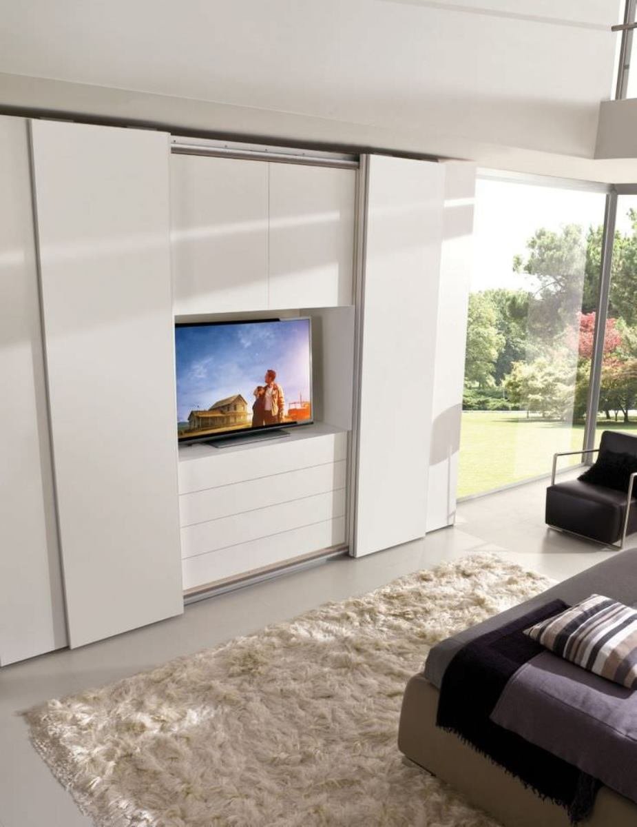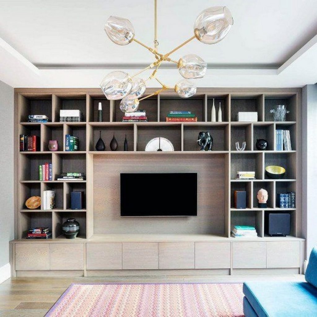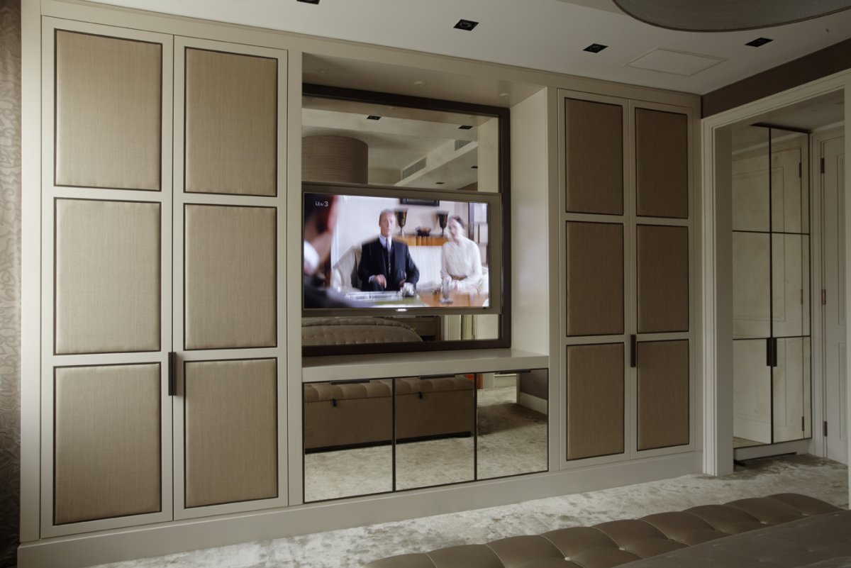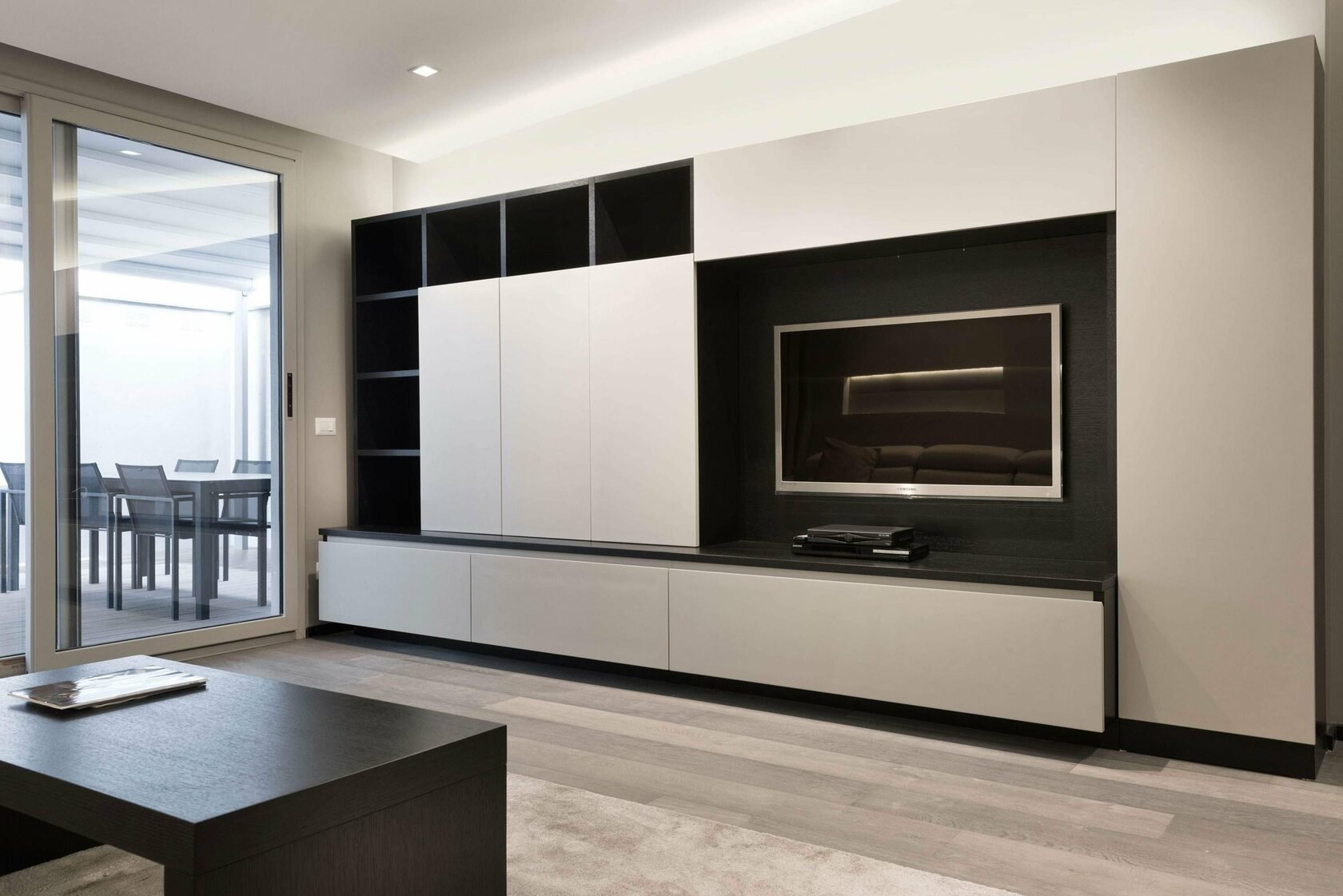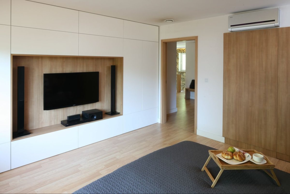 Шкаф с тумбой под телевизор в интерьере гостиной
