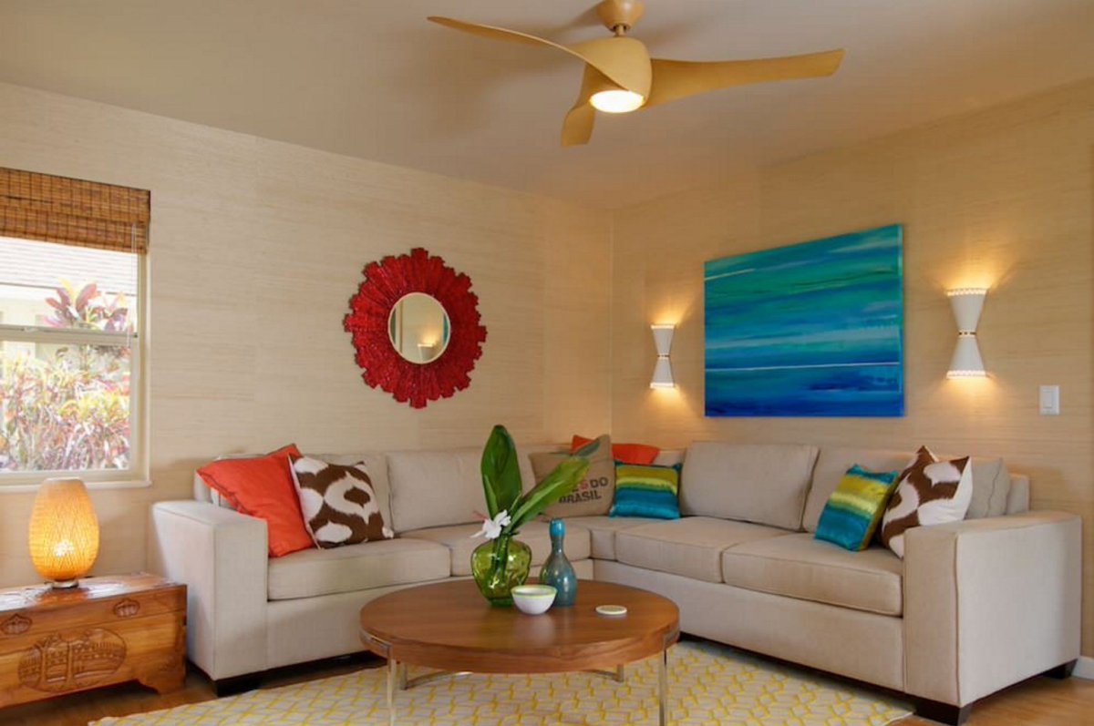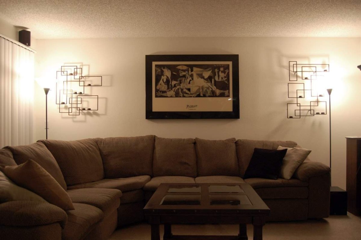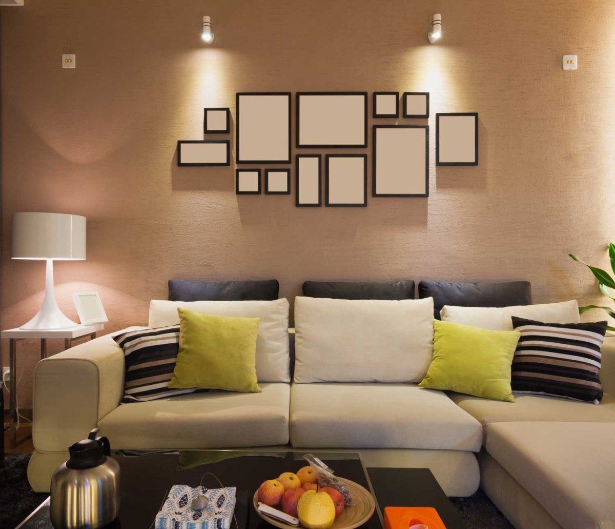 Декор стены в гостиной над угловым диваном