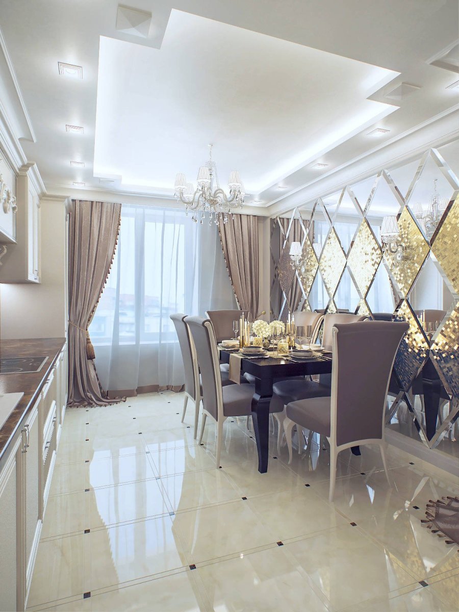 Зеркальная стена в интерьере кухни