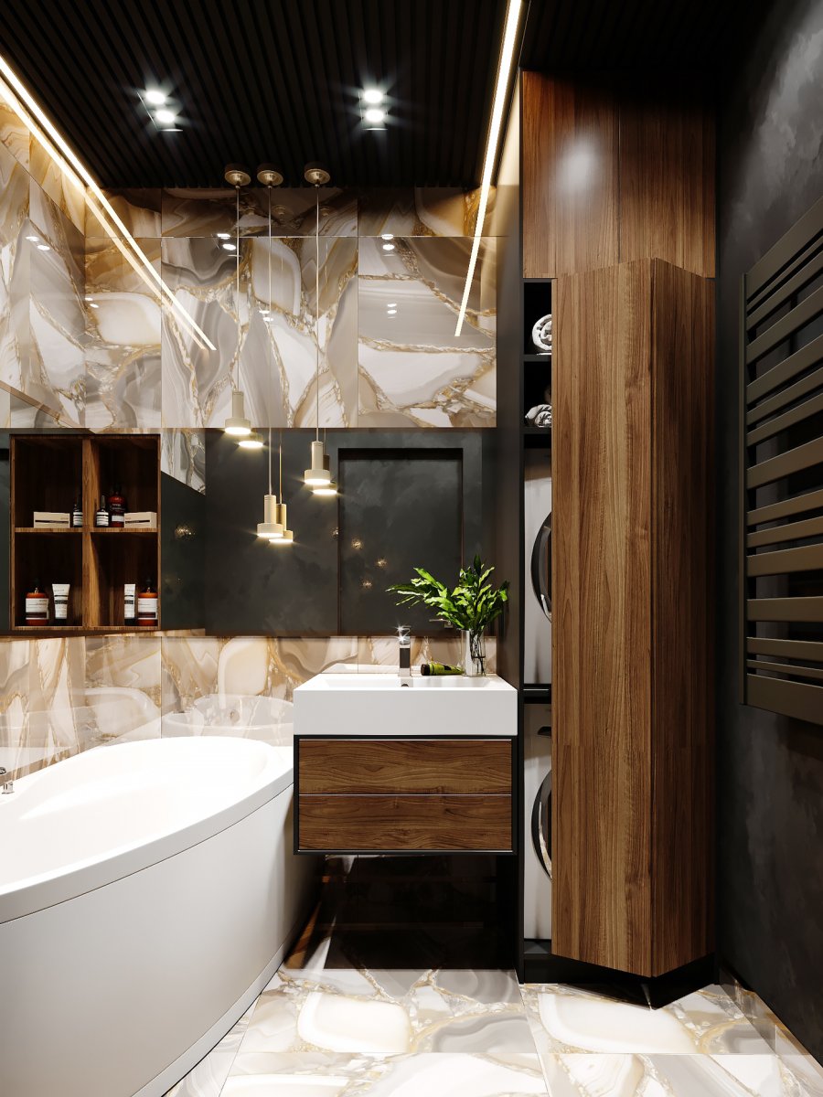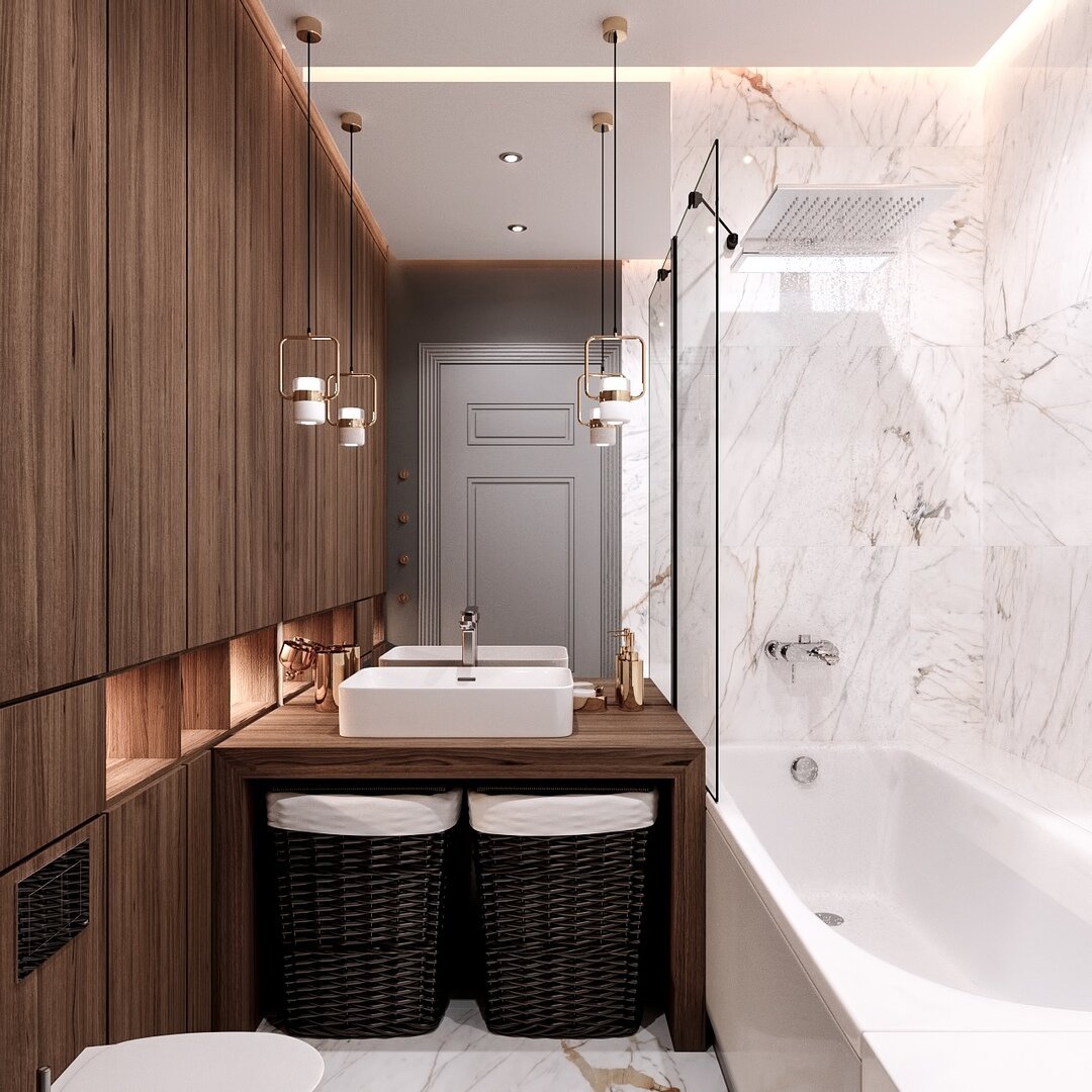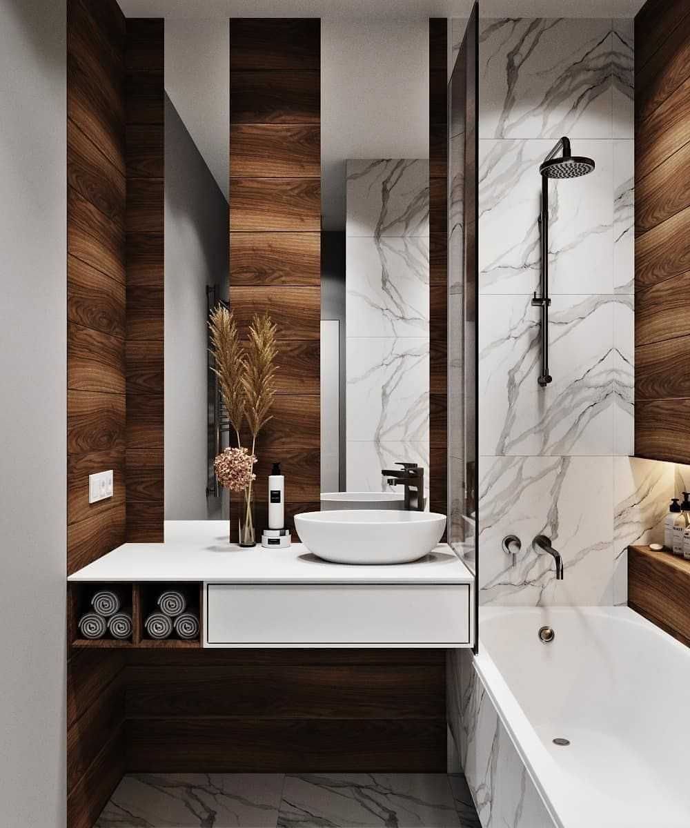 Дизайн ванной комнаты мрамор и дерево